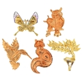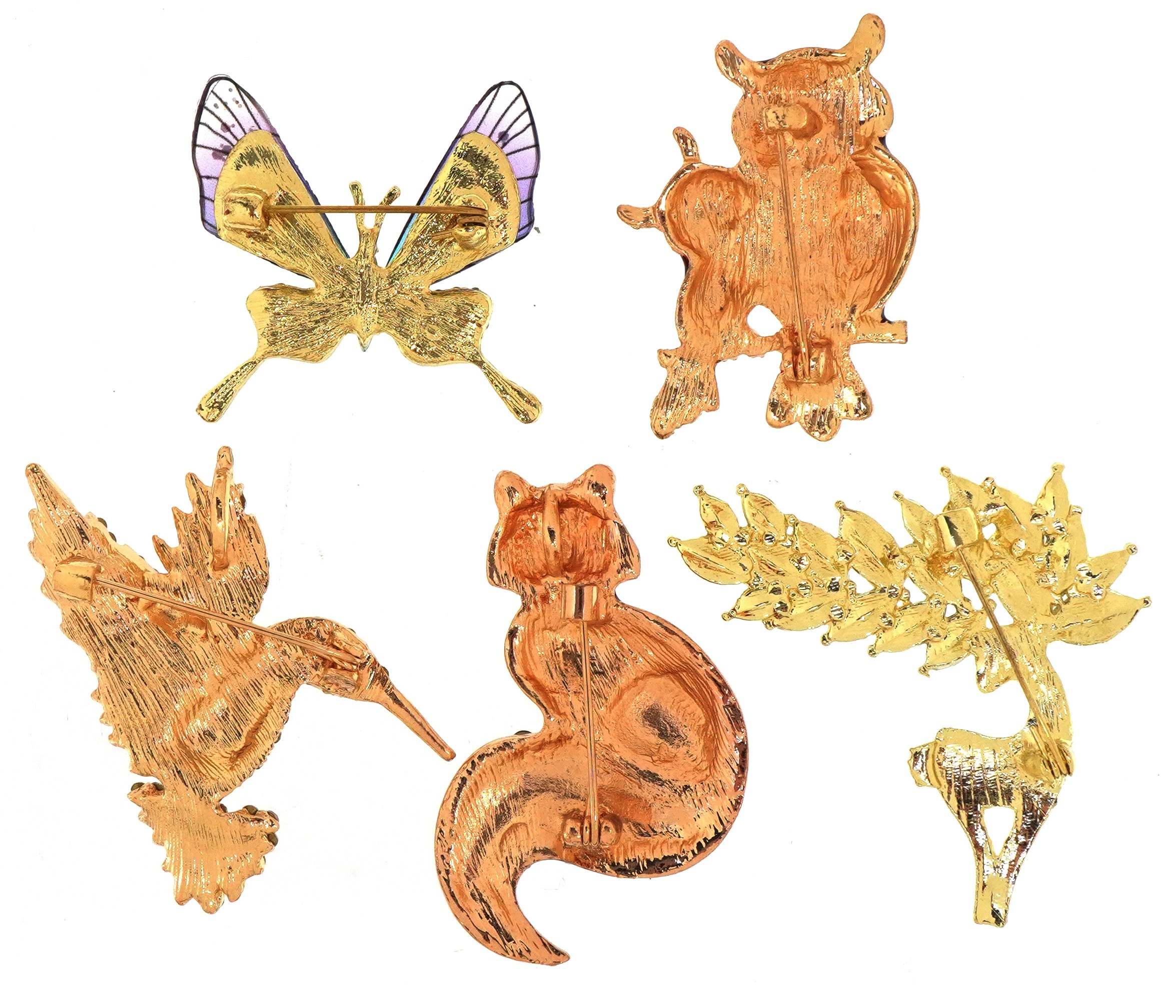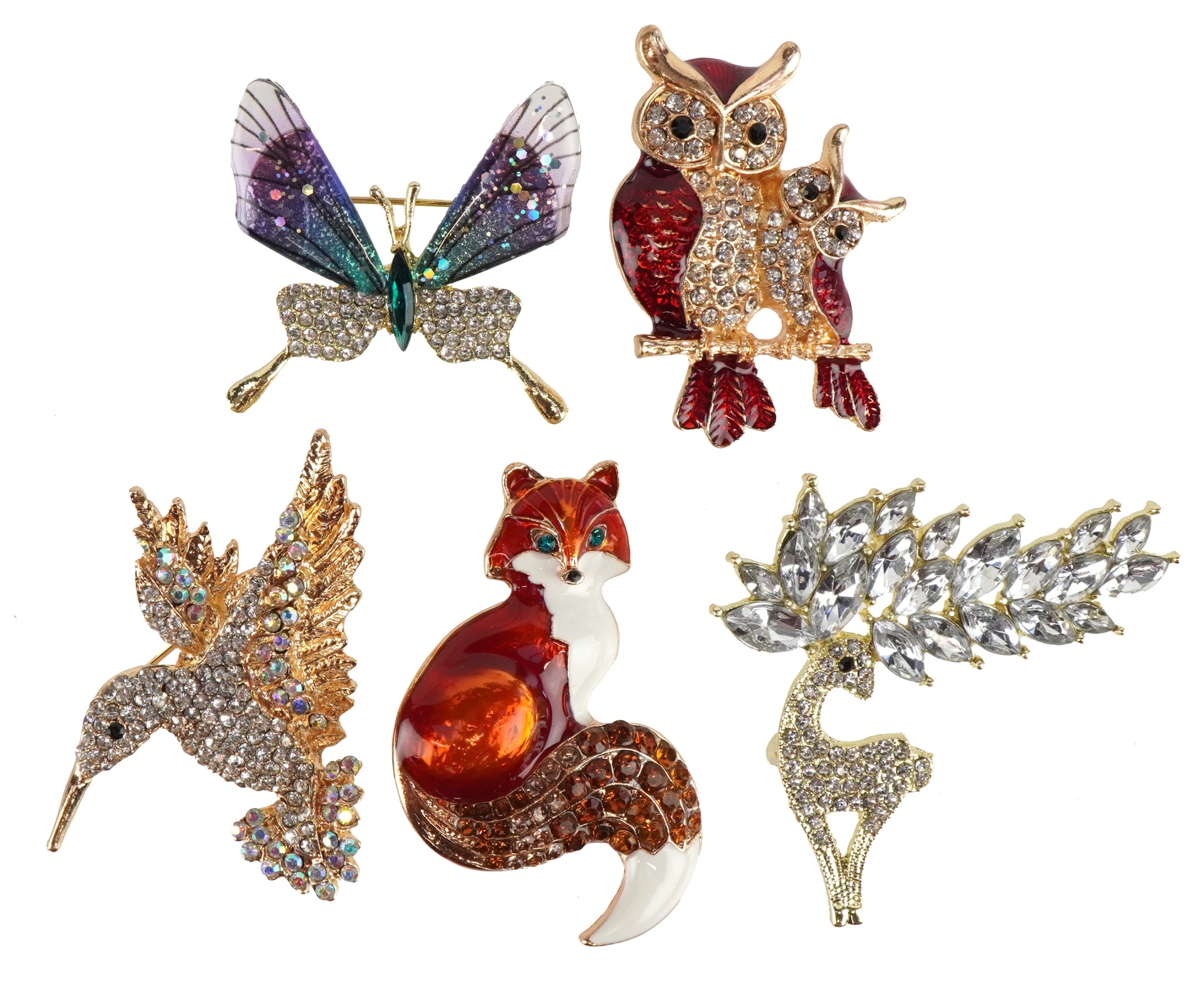Five jewelled brooches in the form of animals comprising an enamelled fox, enamelled owls, stag, hummingbird and butterfly, the largest 5cm high.