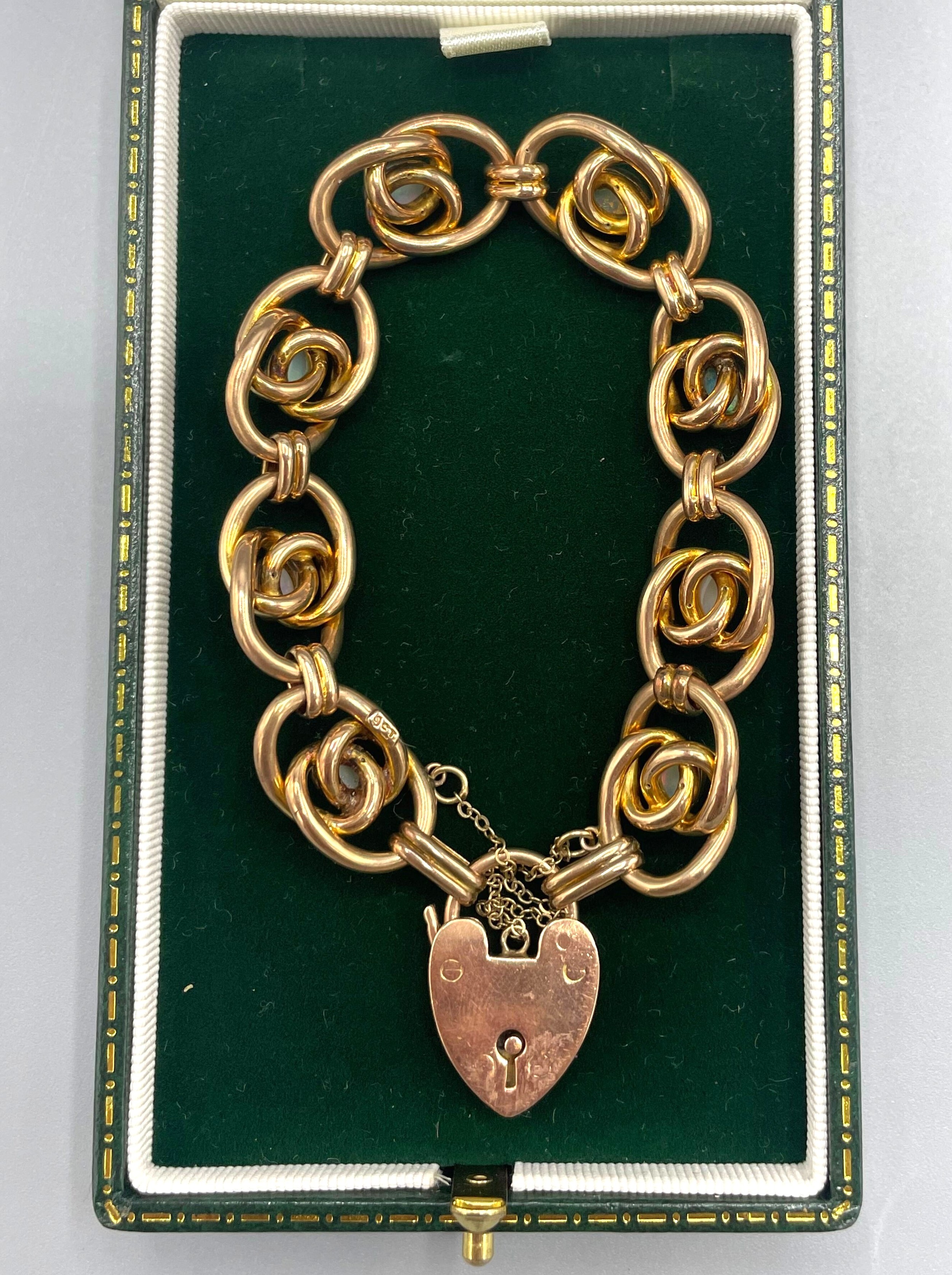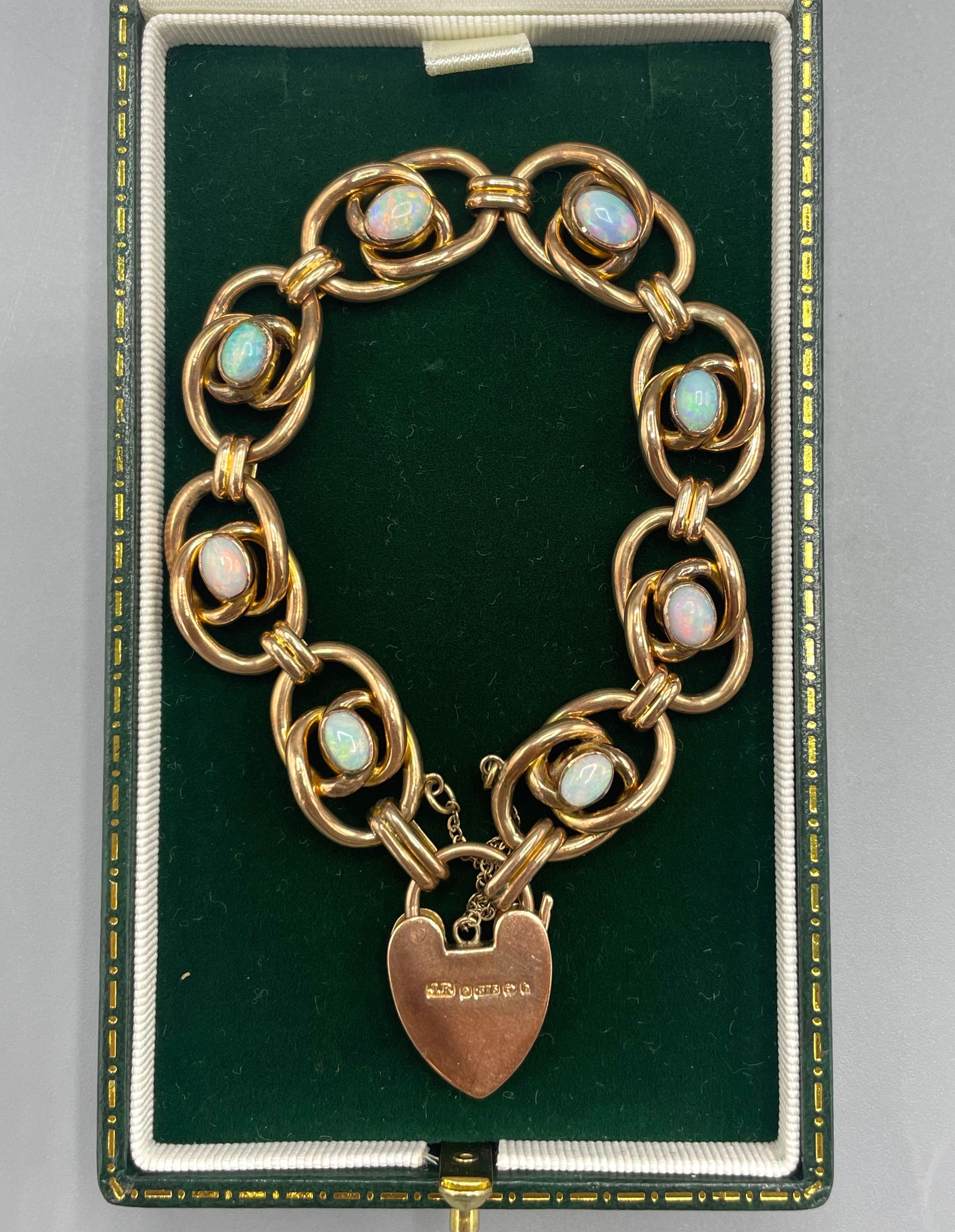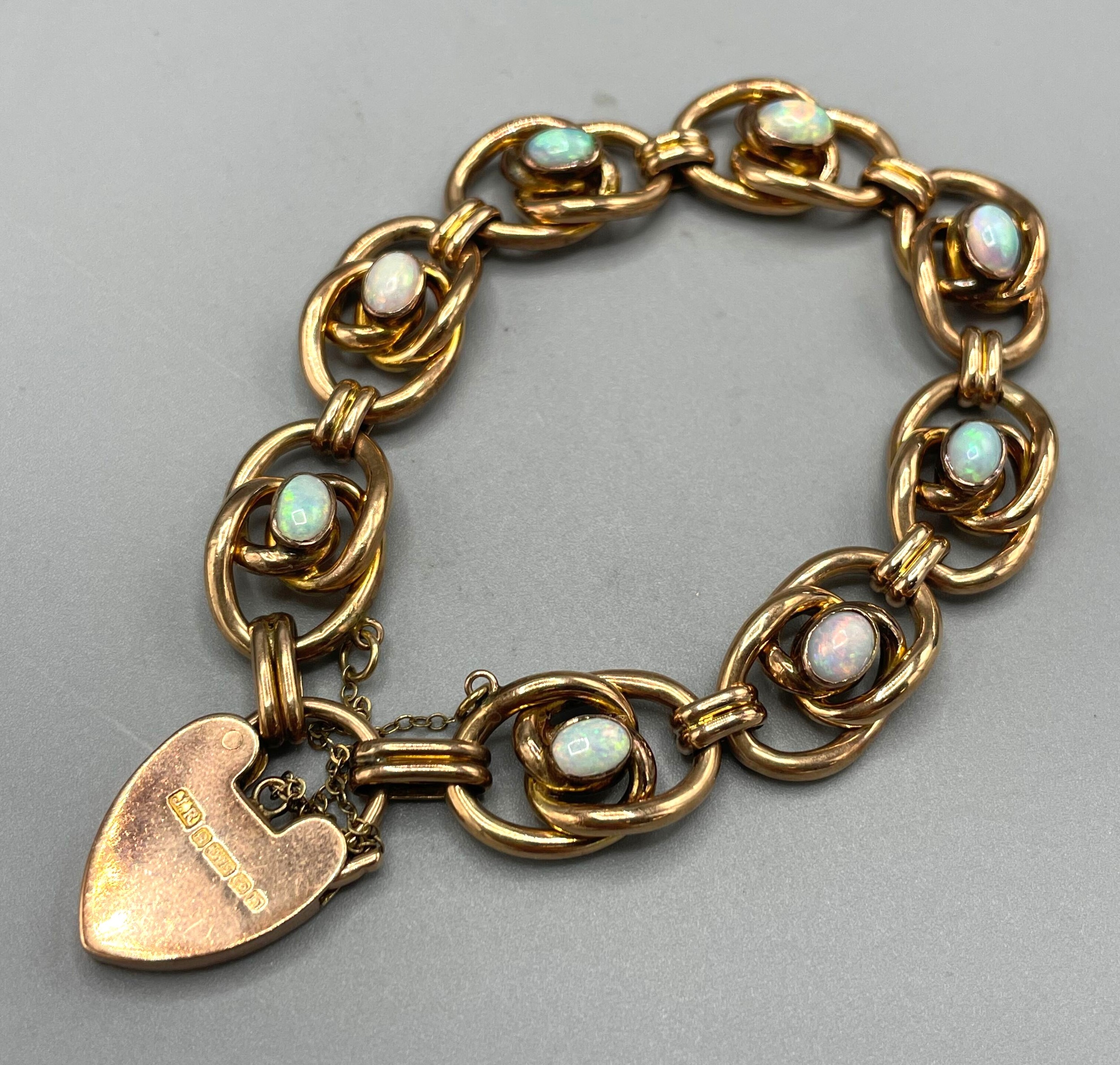 Edwardian 9ct rose gold fancy link chain bracelet set with opals, stamped 375, Birmingham 1907, 19.9g