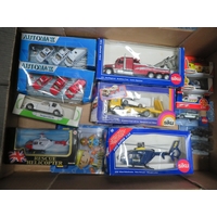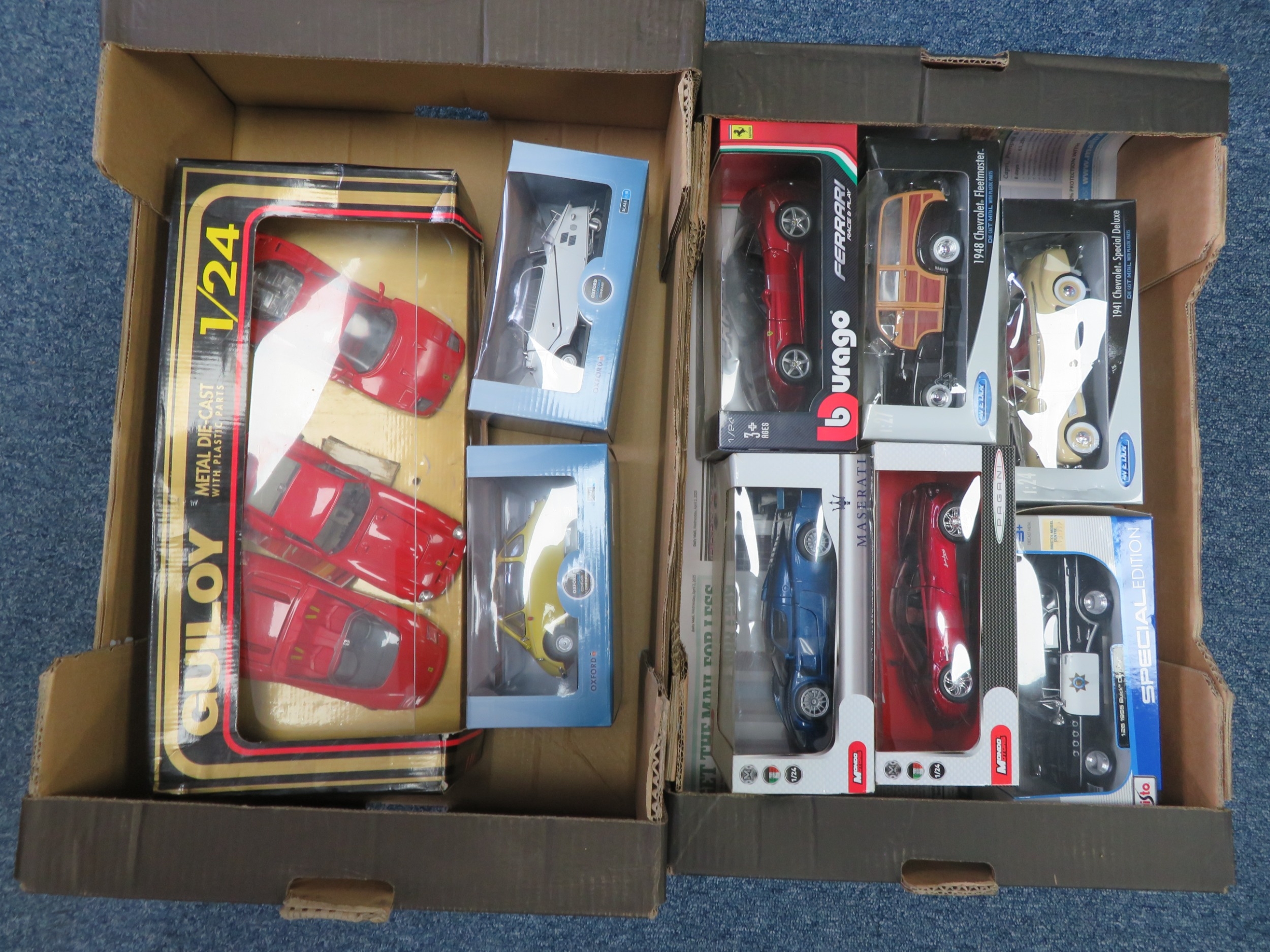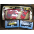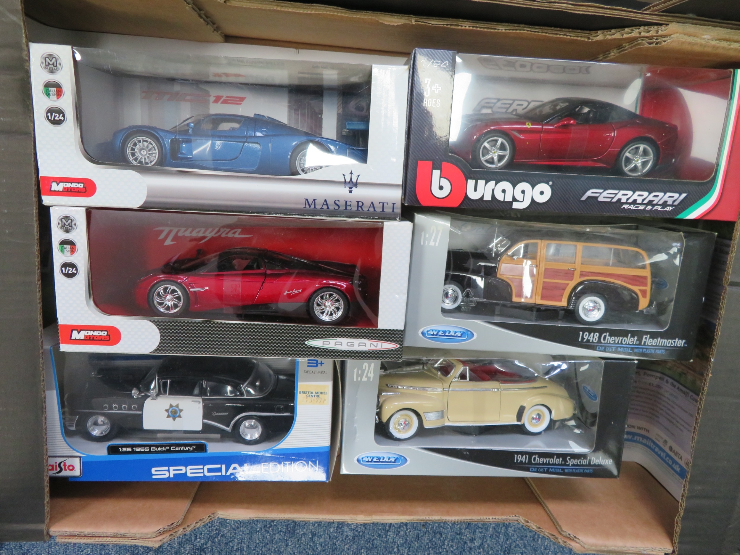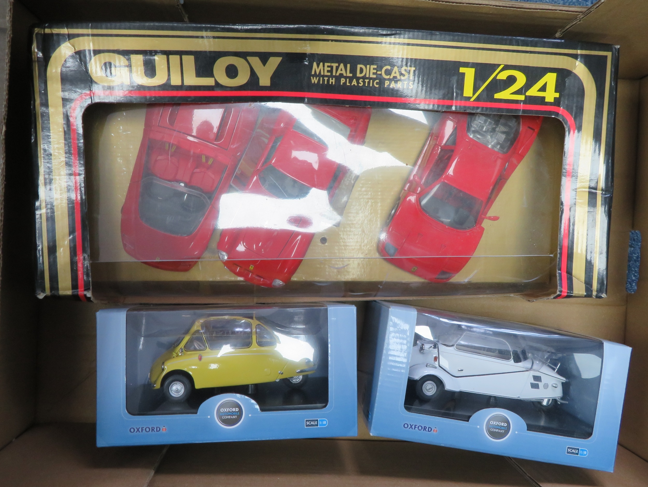 Mainly 1/24th scale collection, generally excellent to good plus in good or better boxes, with Guiloy 3-piece Ferrari set, Burago Ferrari California T No. 18-26002, Mondo Motors Pagani and Maserati, Welly (2), etc., plus 1/18th scale Oxford Diecast Messerschmidt KR200 white No. 18MBC005 and Heinkel yellow No. 18HE003. Contents appear complete but unchecked. Viewing recommended. Qty 9 (2B)