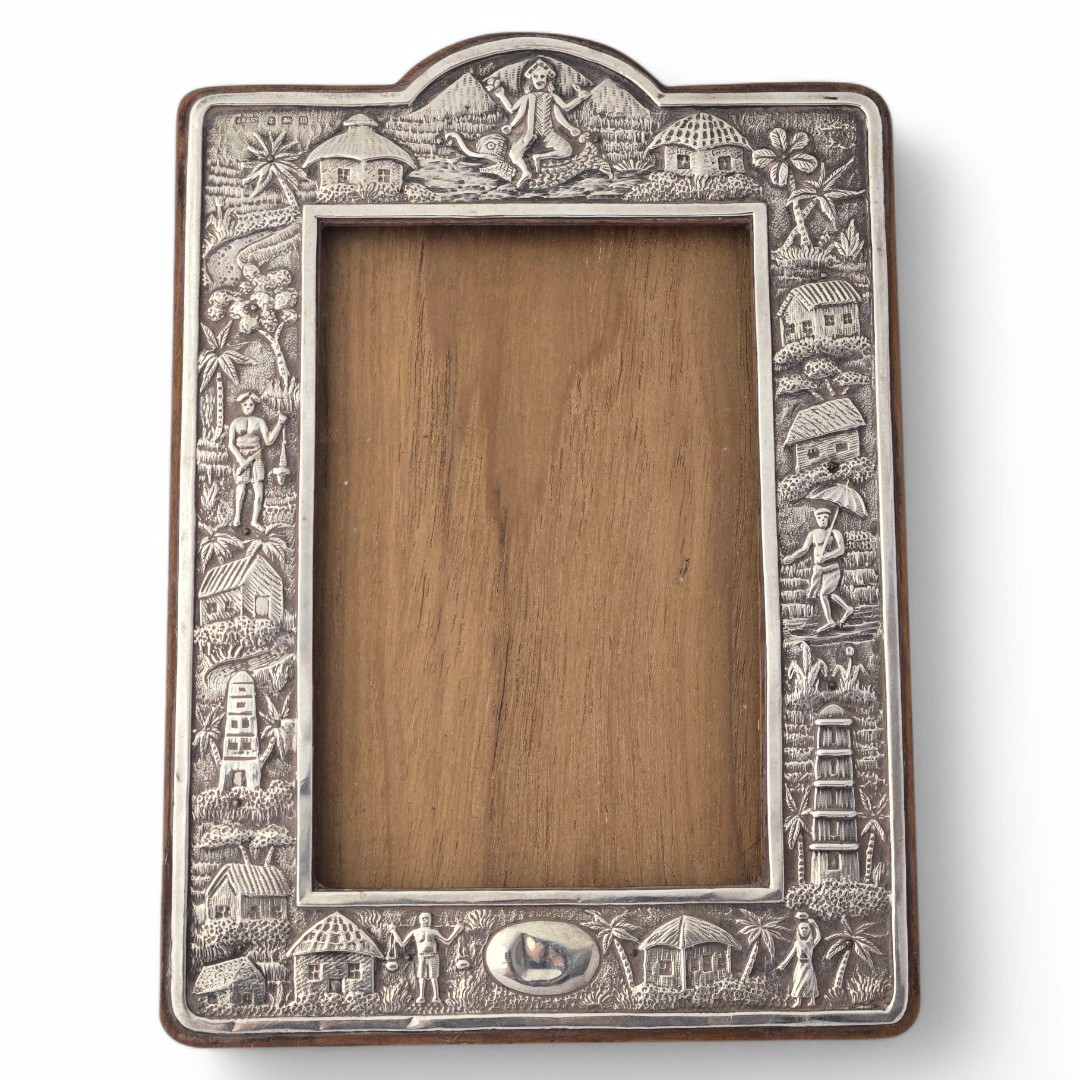 UK hallmarked repoussé silver photo frame 22 x 16cm decorated with an Eastern theme. Shipping group (A).