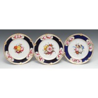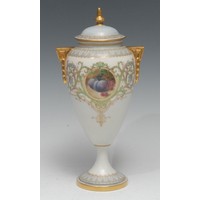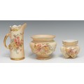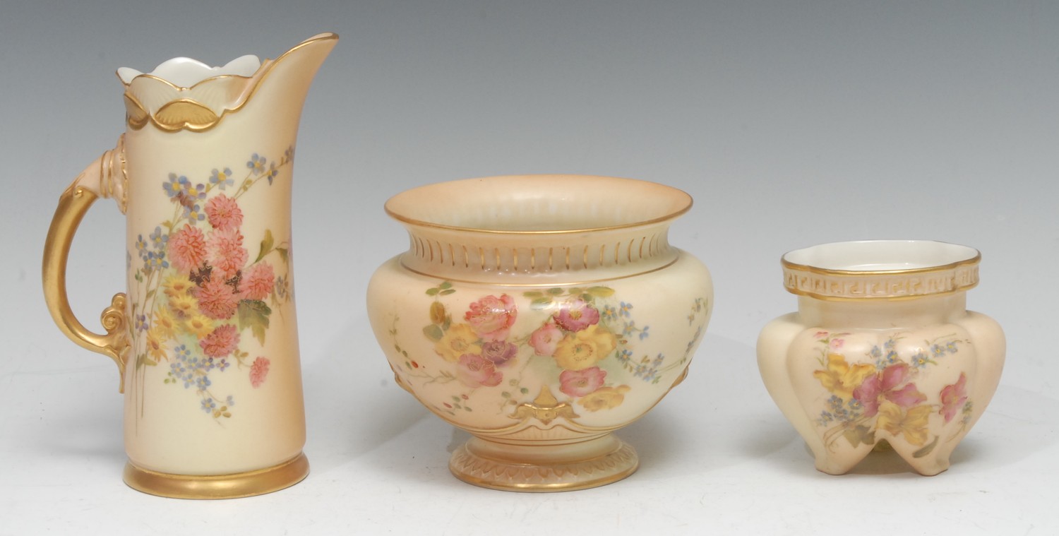 A Royal Worcester tusk-shaped cabinet ewer, painted with chrysanthemums and country flower, blush ivory ground picked out in gilt, 15.5cm high, model no. 1229, puce printed marks, c. 1900; a pair of similar bowls, various, (2), [3]