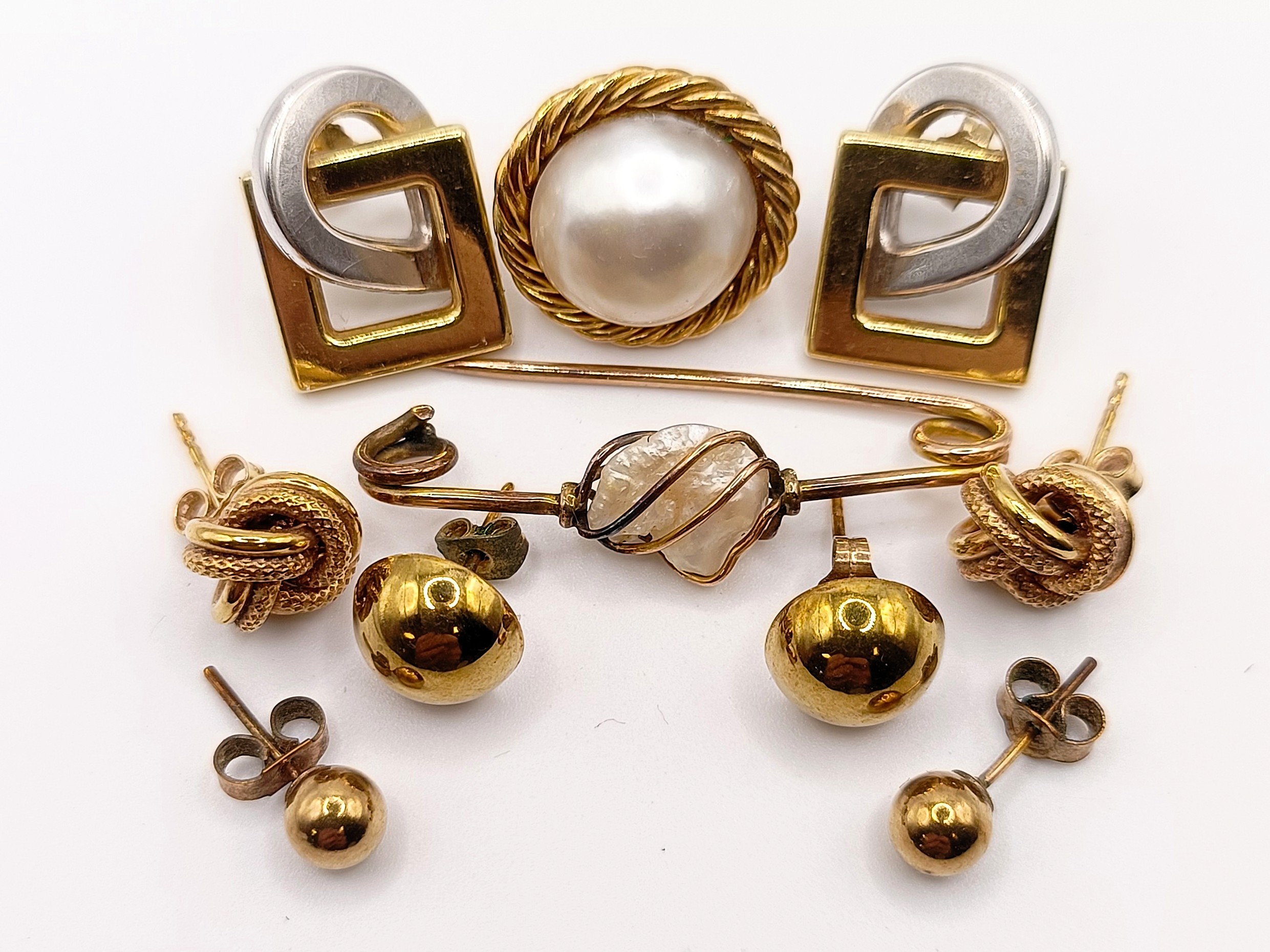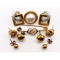 ***Regretfully Withdrawn*** A yellow coloured metal and pearl bar brooch, four pairs of stud earrings, and a single earring