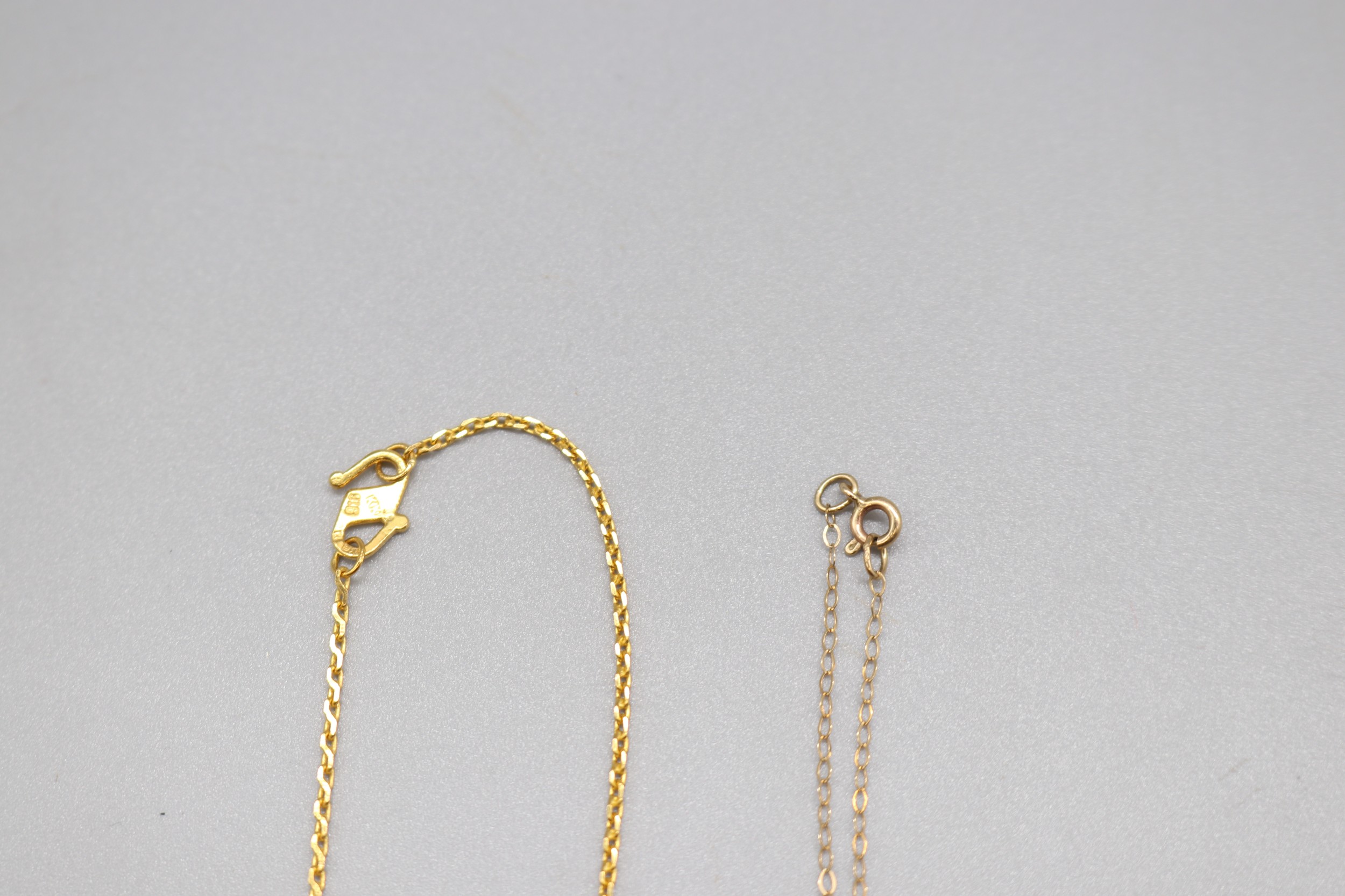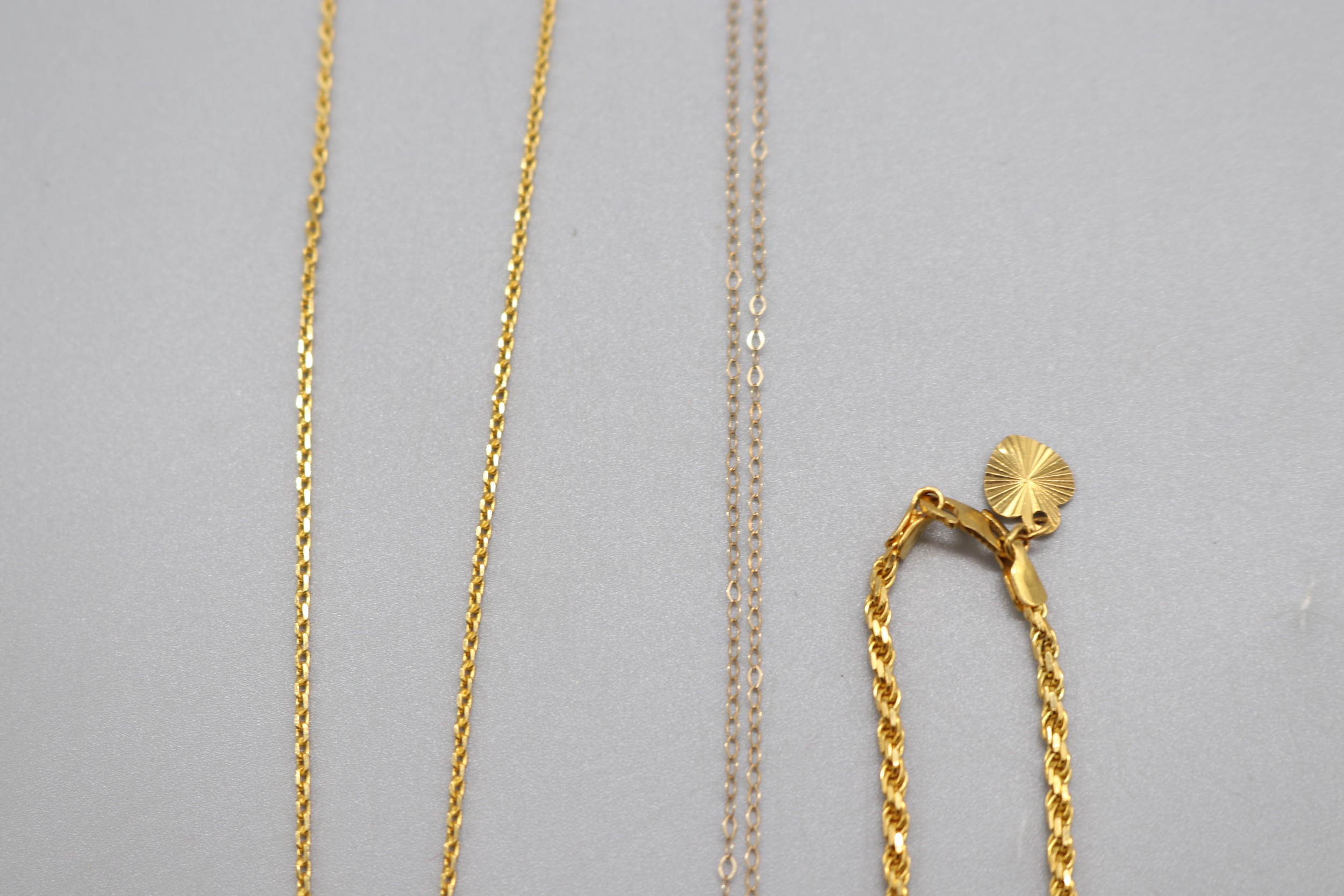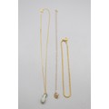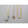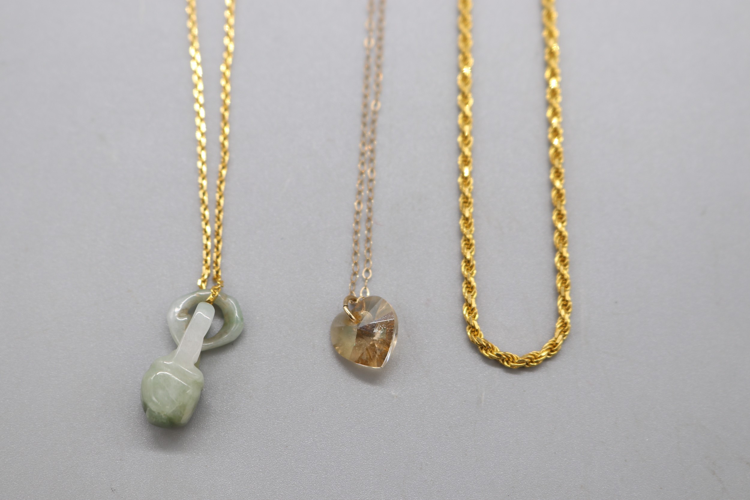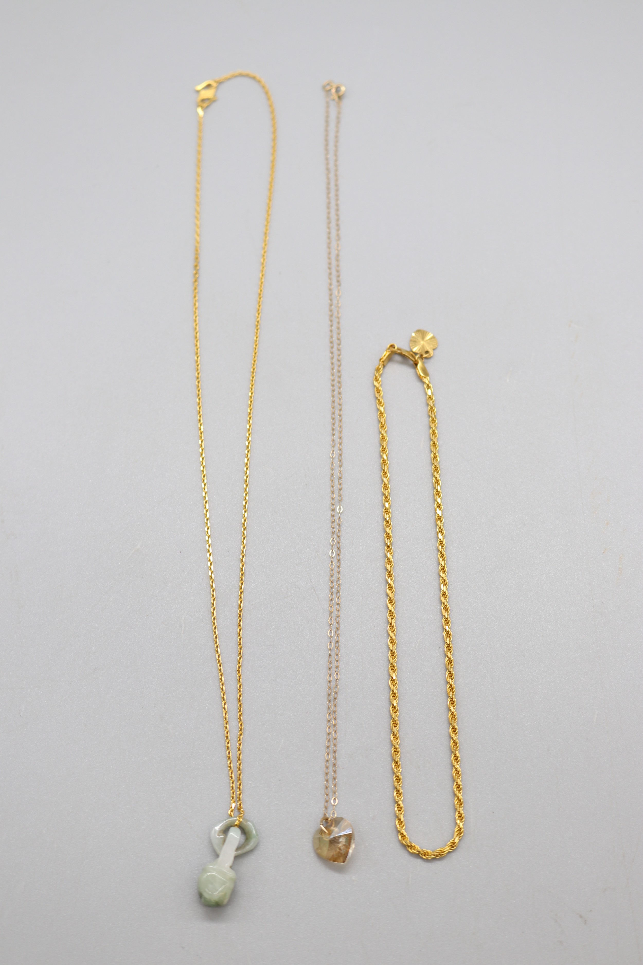 Lot of stamped 916 plate yellow metal, jade lantern pendant weight 5.37g and stamped 916 plate gold rope chain anklet, weight 7.16g, length 10.5" and a yellow metal bail and chain crystal faceted heart necklace, weight 1g