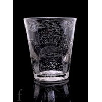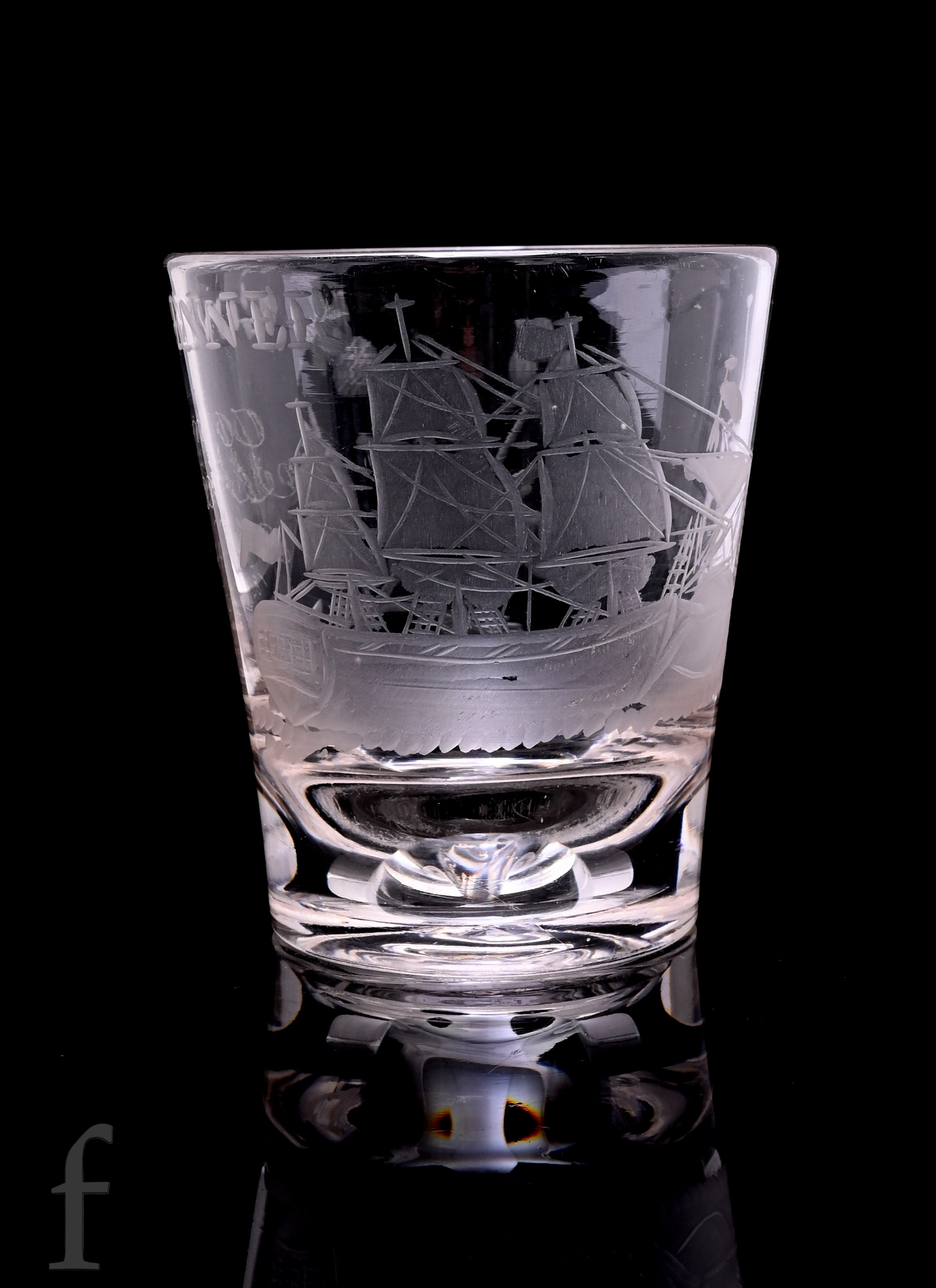 A mid 19th Century heavy tumbler with illusion base, engraved with a scene of three masted sailing vessel titled Govenor Fenner in collision with the steam paddle vessel Nottingham in 1841, with titled, monogram and date with further foliate motifs, height 10.5cm.