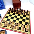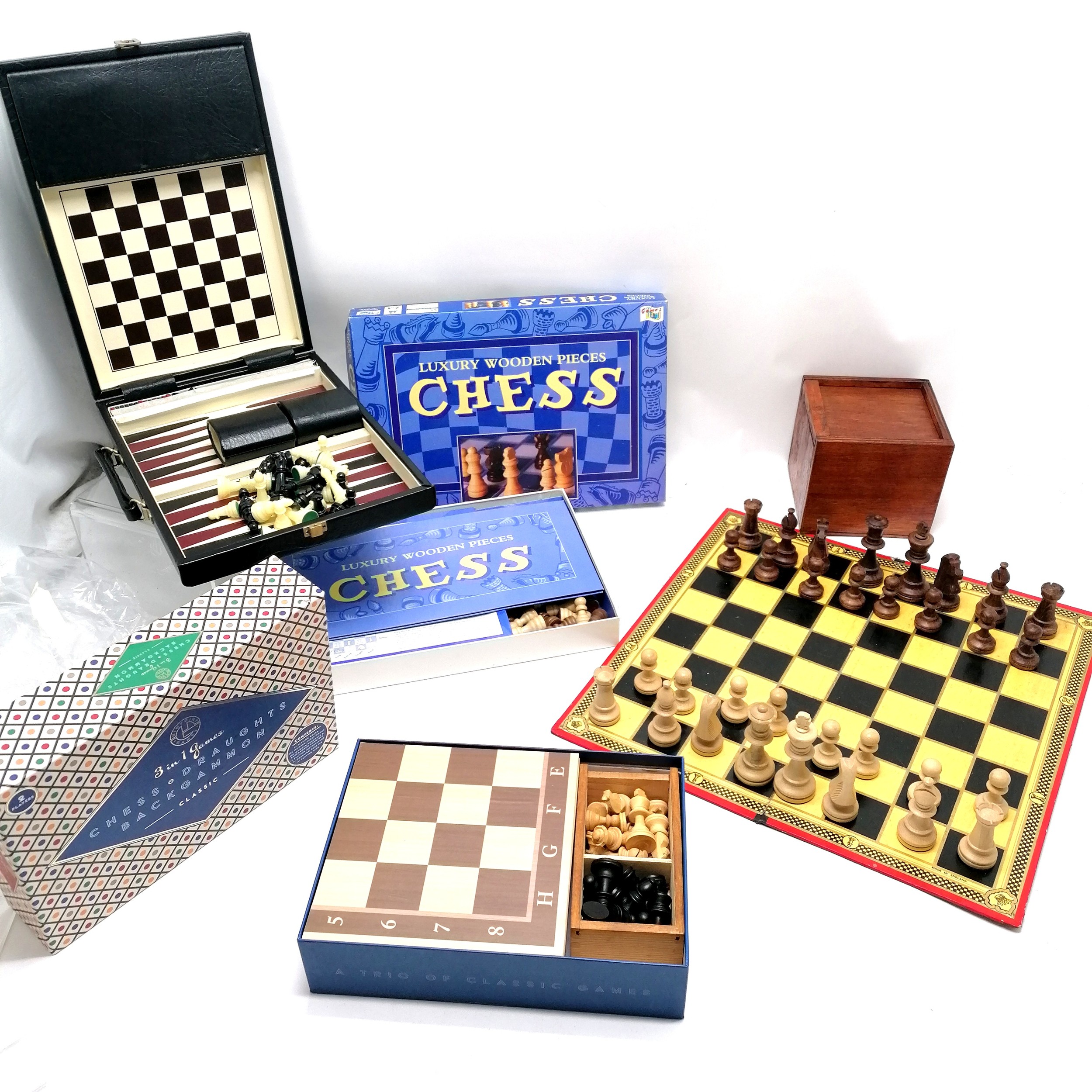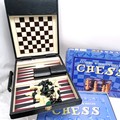 Vintage wooden chess set and board, Pierre Cardin cased backgammom, boxed chess,and 3in1 chess, draughts and backgammon boxed,