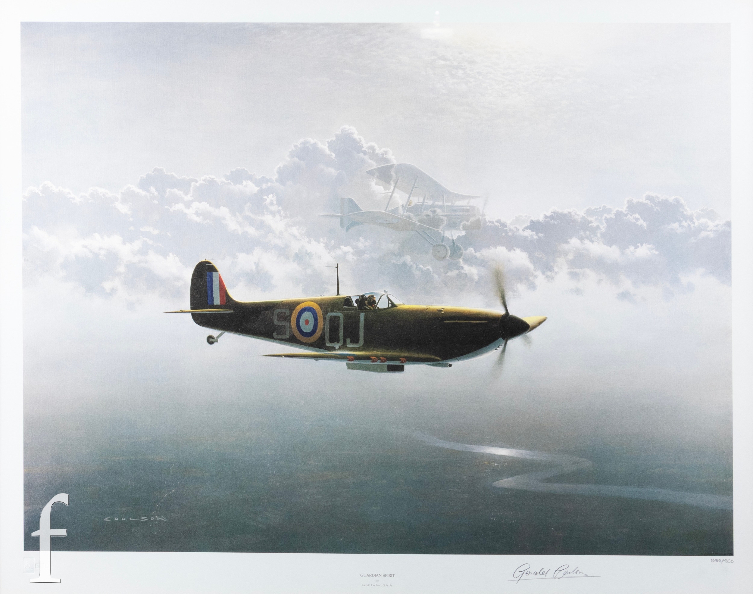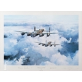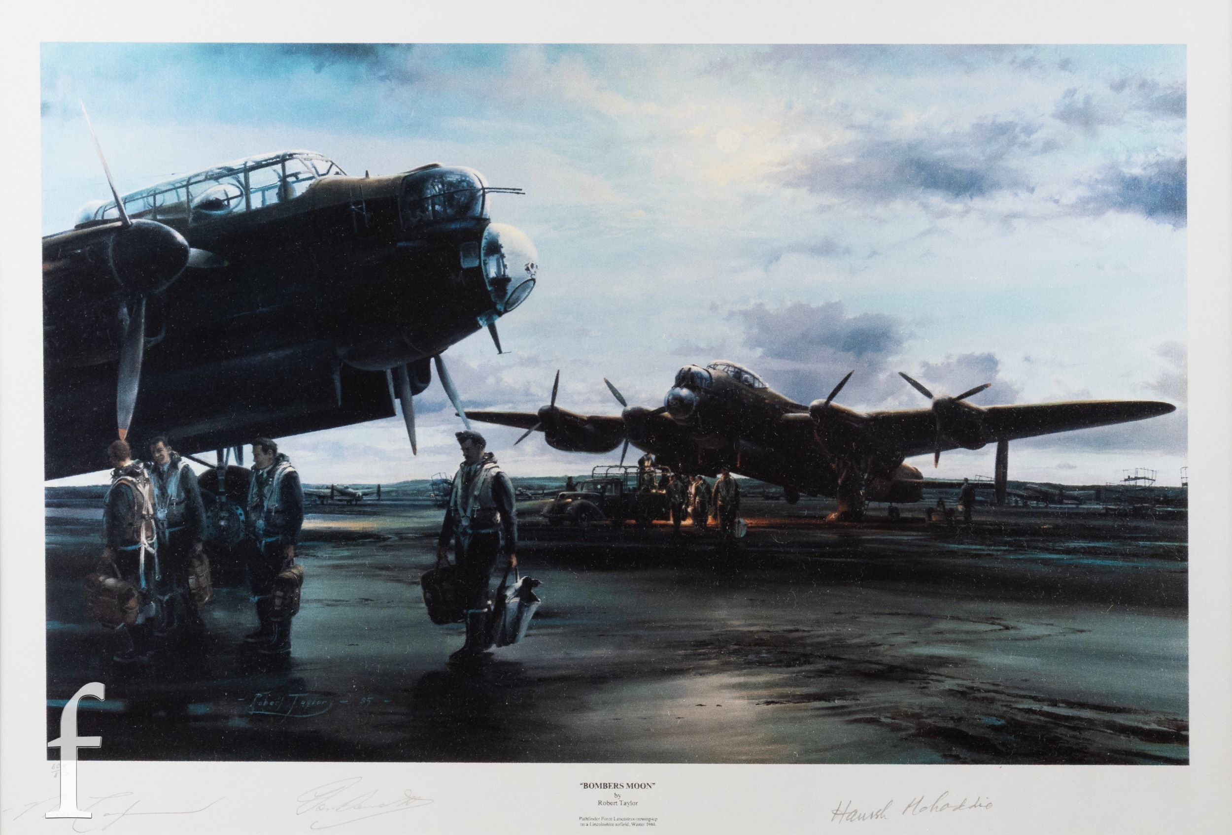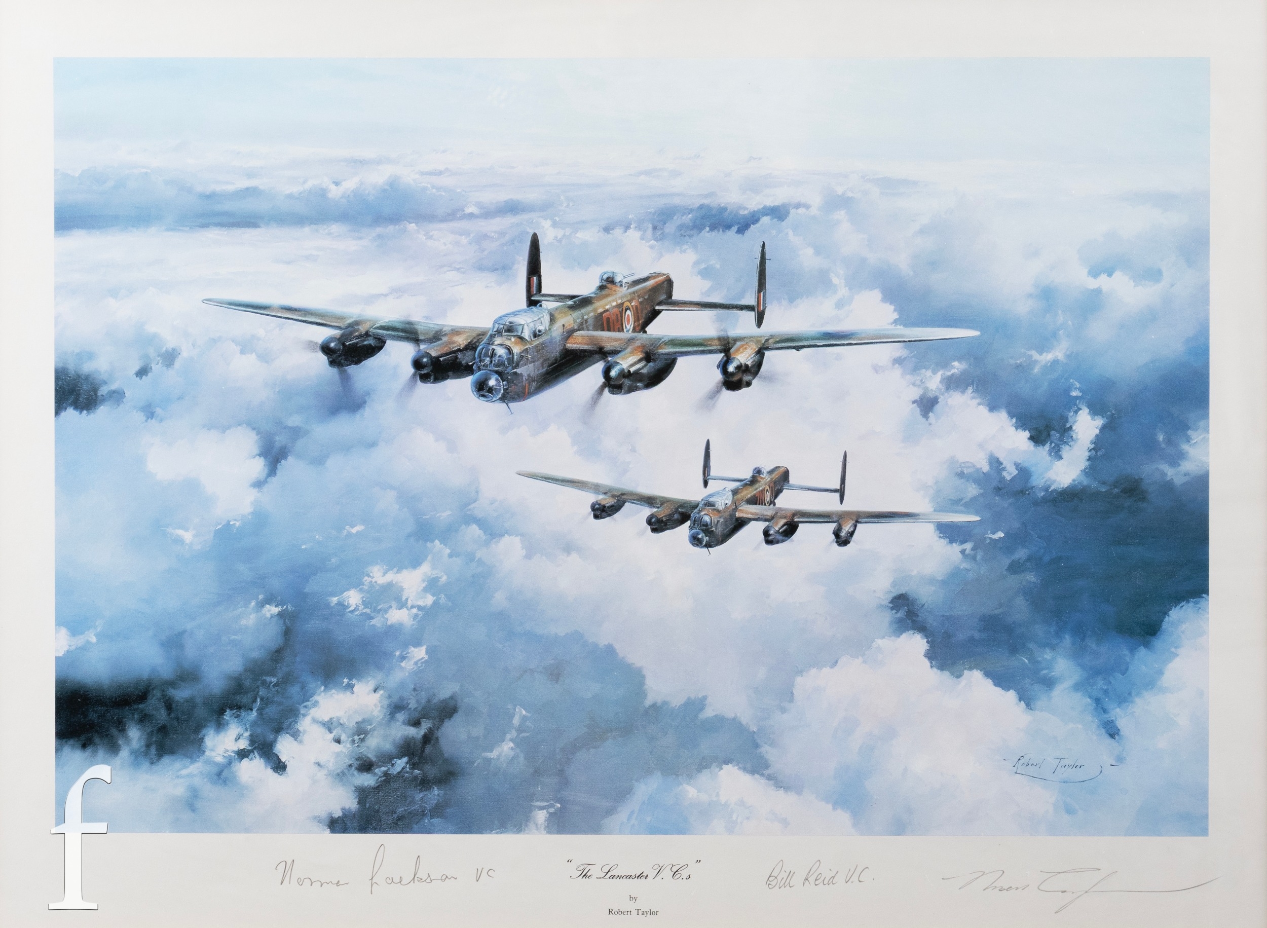 Robert Taylor (Born 1946) - 'Lancaster V.C', limited edition colour print, signed in pencil, retains certificate of authenticity, framed, 38cm x 52cm, frame size 59cm x 73cm, also another limited edition print titled 'Bombers Moon' and a limited edition print by Gerald Coulson titled 'Guardian Spirit'. (3)