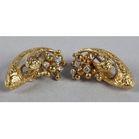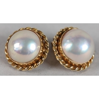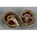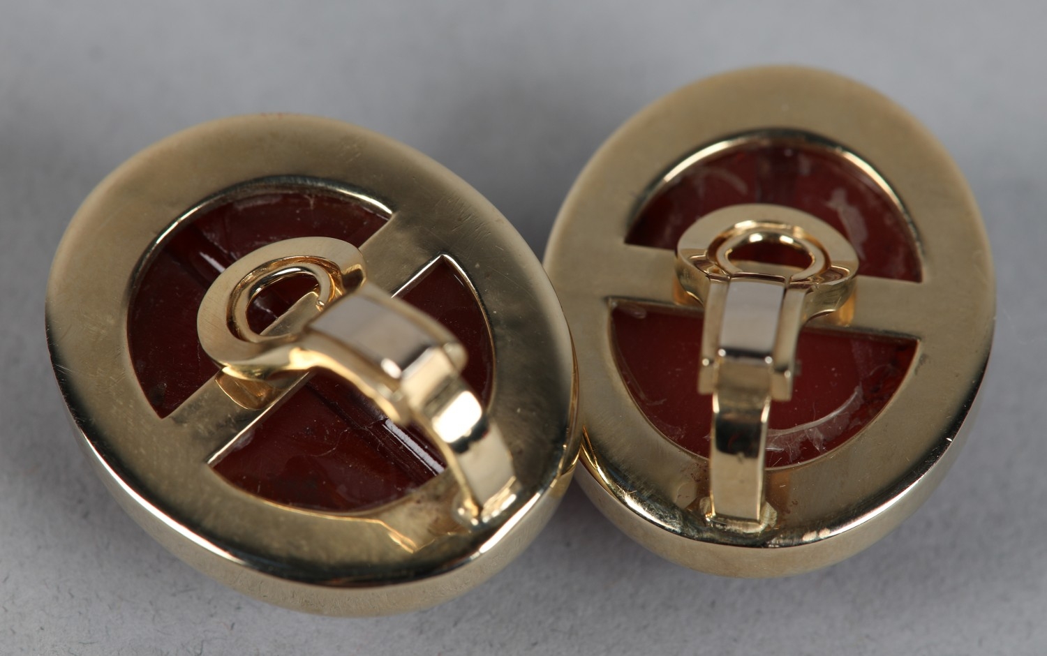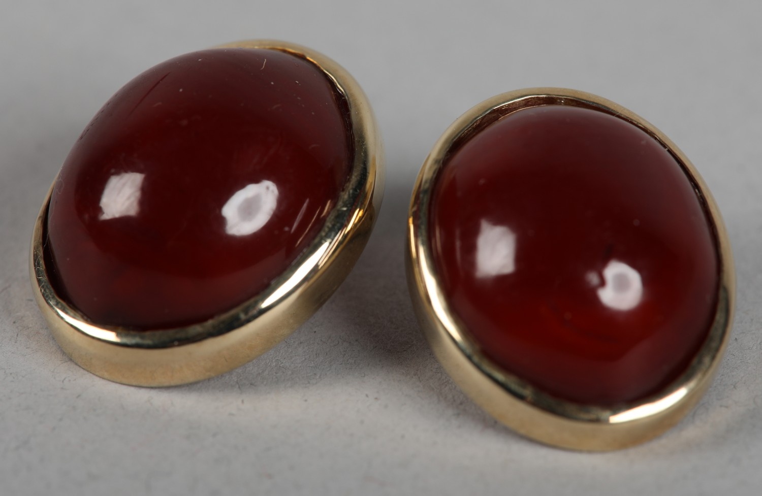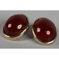 A PAIR OF EAR CLIPS each collet set with an oval Bakelite cabochon, in yellow metal (tests as 9ct and 18ct gold), approximately 28mm x 23mm, total approximate weight 23.9g