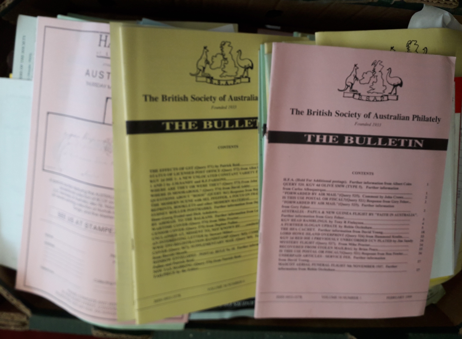 Australia Large Box Australia - The British Society of Australian Philately Extensive well for society Bulletins etc., 1980's to 2000. Valuable research for the specialist. (Qty) Buyer collects/arranges carrier.