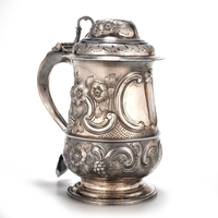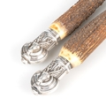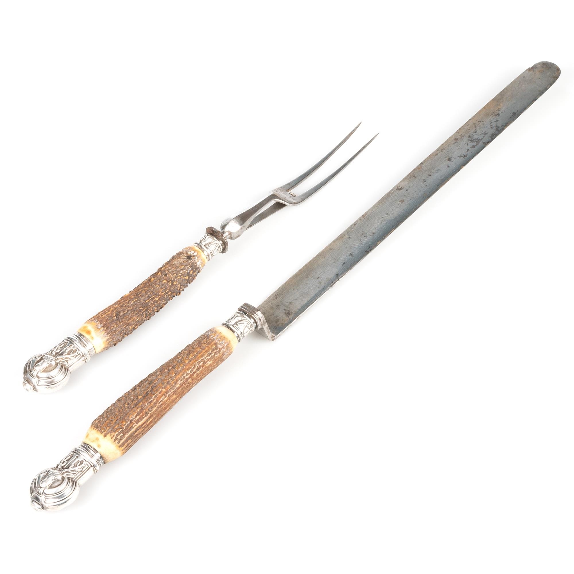 by Joseph Rodgers & Sons, Sheffield, with rubbed registration lozenge, the antler handles both with silver collar and cap embossed with deer/stag heads and hunting horns, in a green baize-lined fitted wooden case. Carving knife 57.5cm long