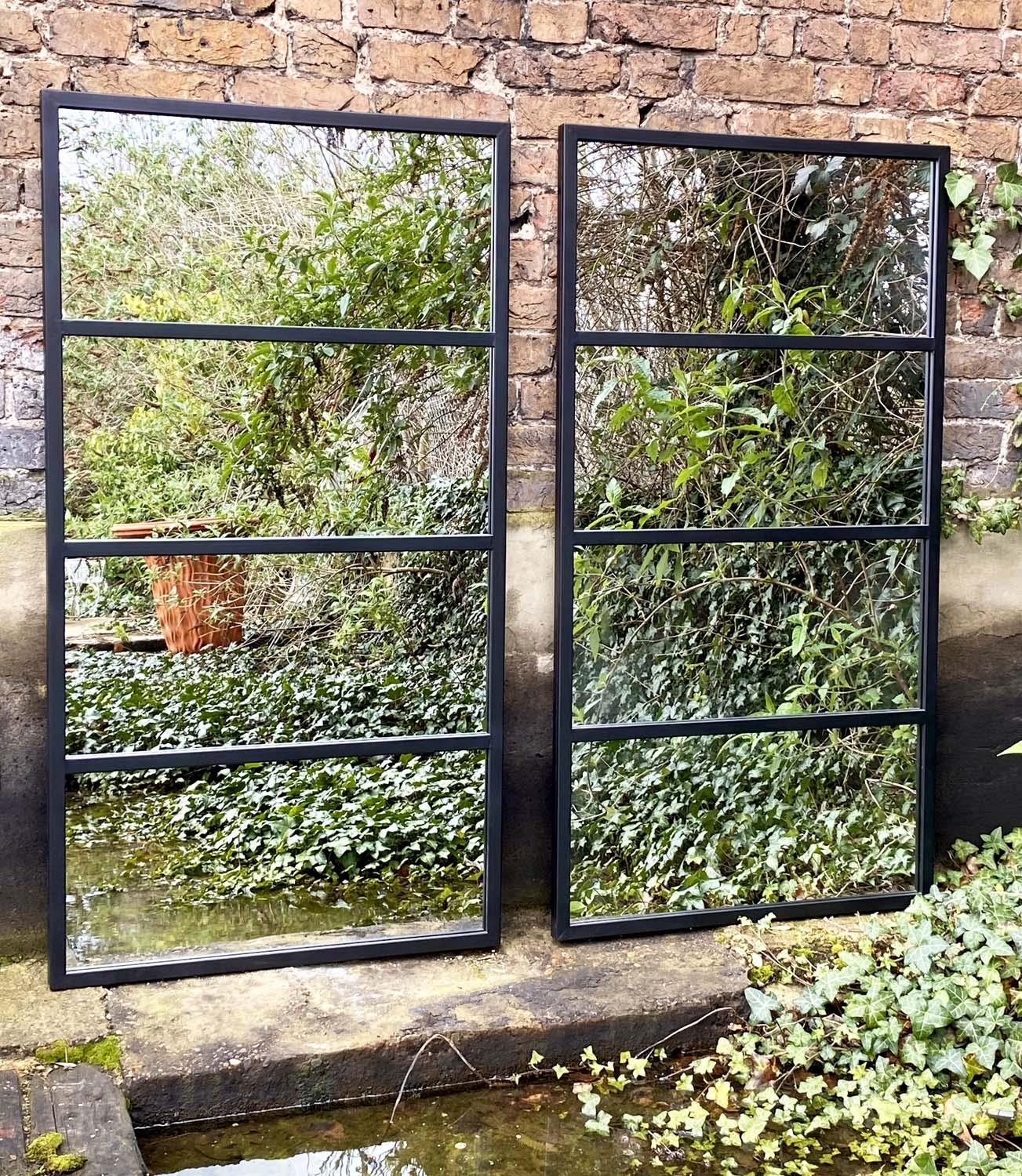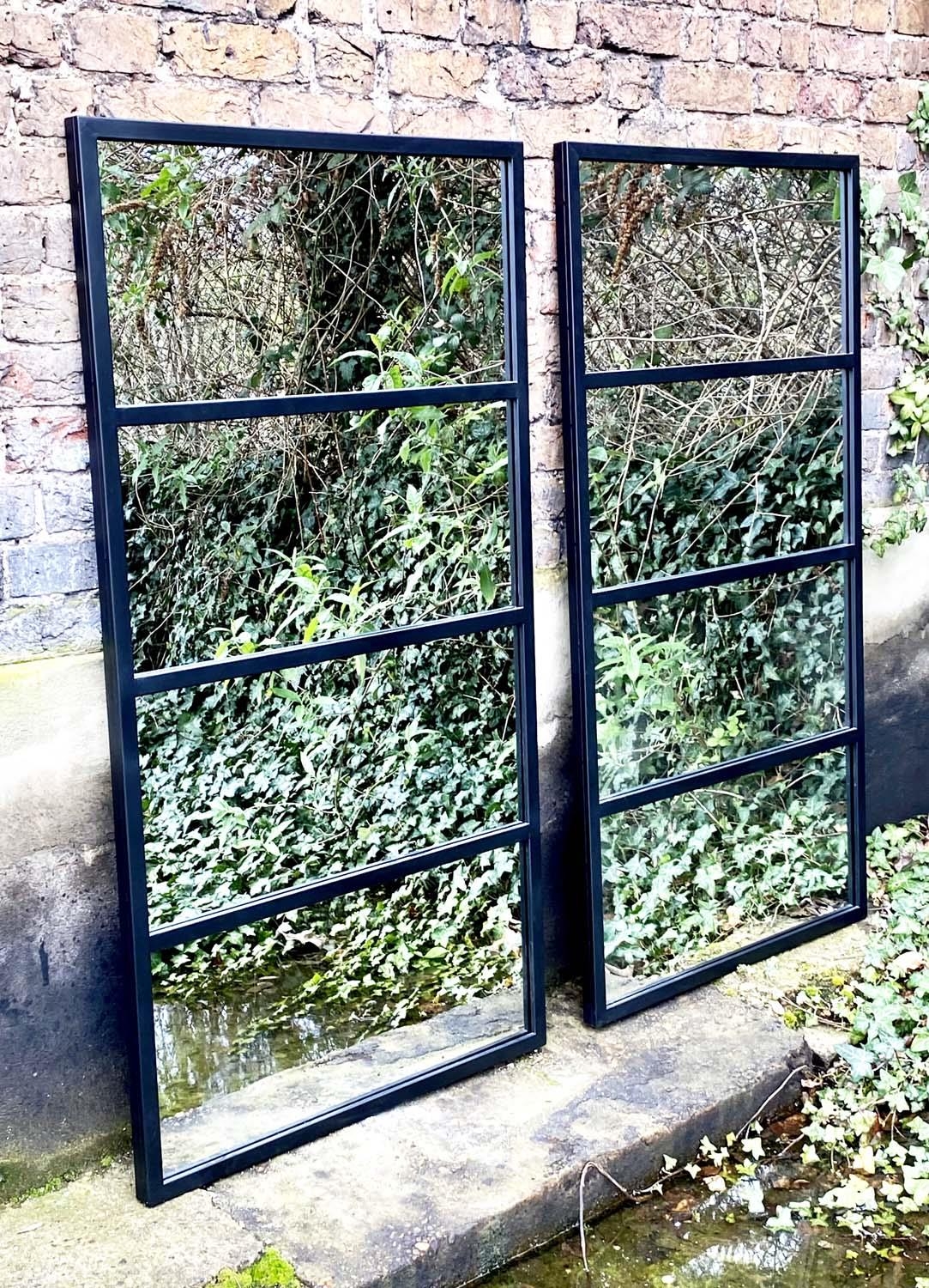 ARCHITECTURAL GARDEN MIRRORS, a pair, contemporary design, 139cm x 75cm. (2)