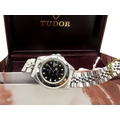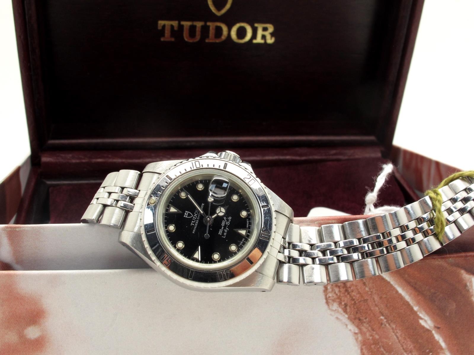 Tudor; A Modern Princess Oysterdate Lady-Sub Automatic Ladies Wristwatch, the signed black dial 200m=660ft with centre seconds and date aperture, (movement unseen) to integral Tudor bracelet, complete with guarantee numbered "B441264" and Watches of Switzerland service Guarantee leaflet purchase date 28.09.01, in original box.