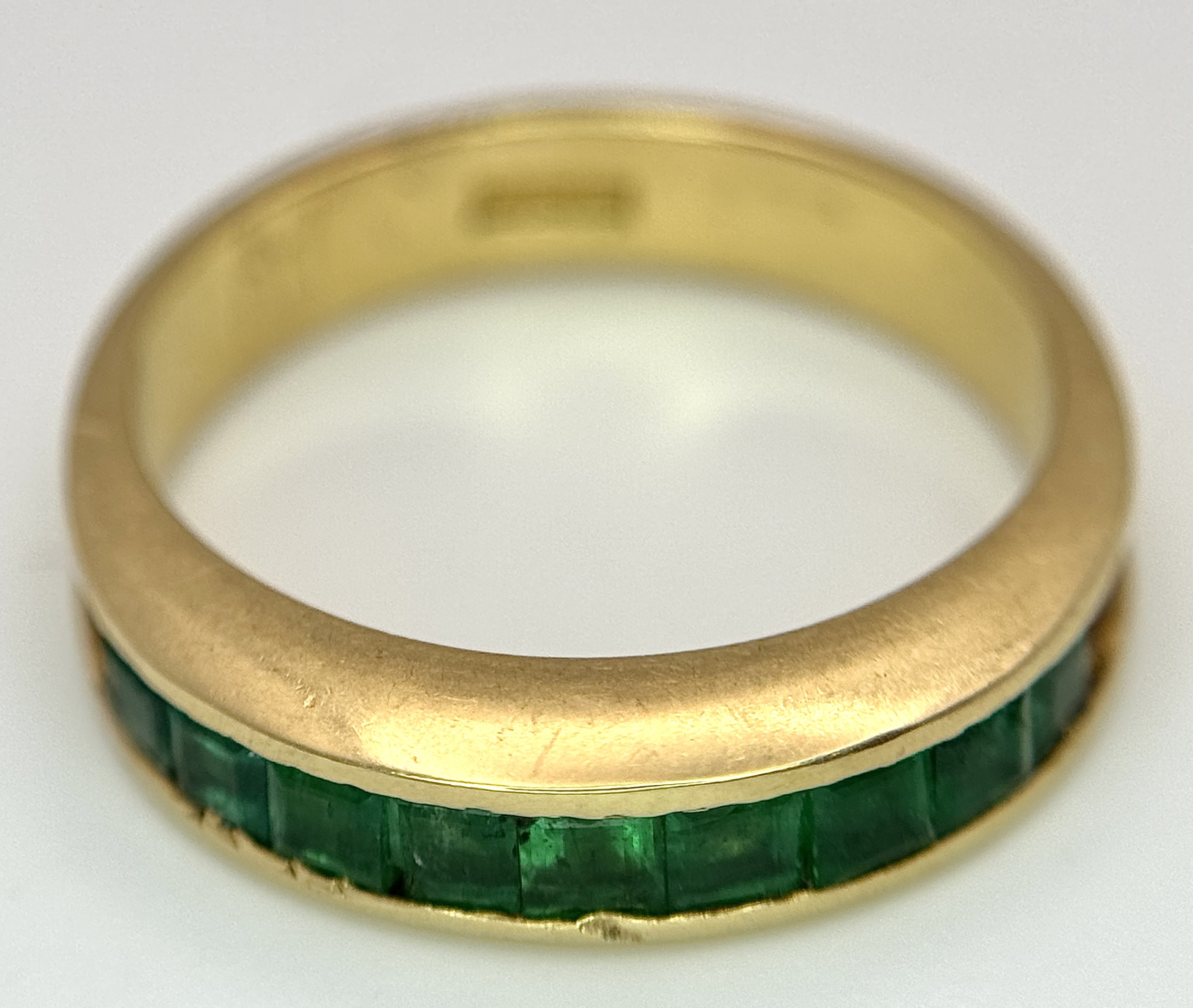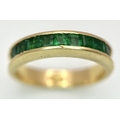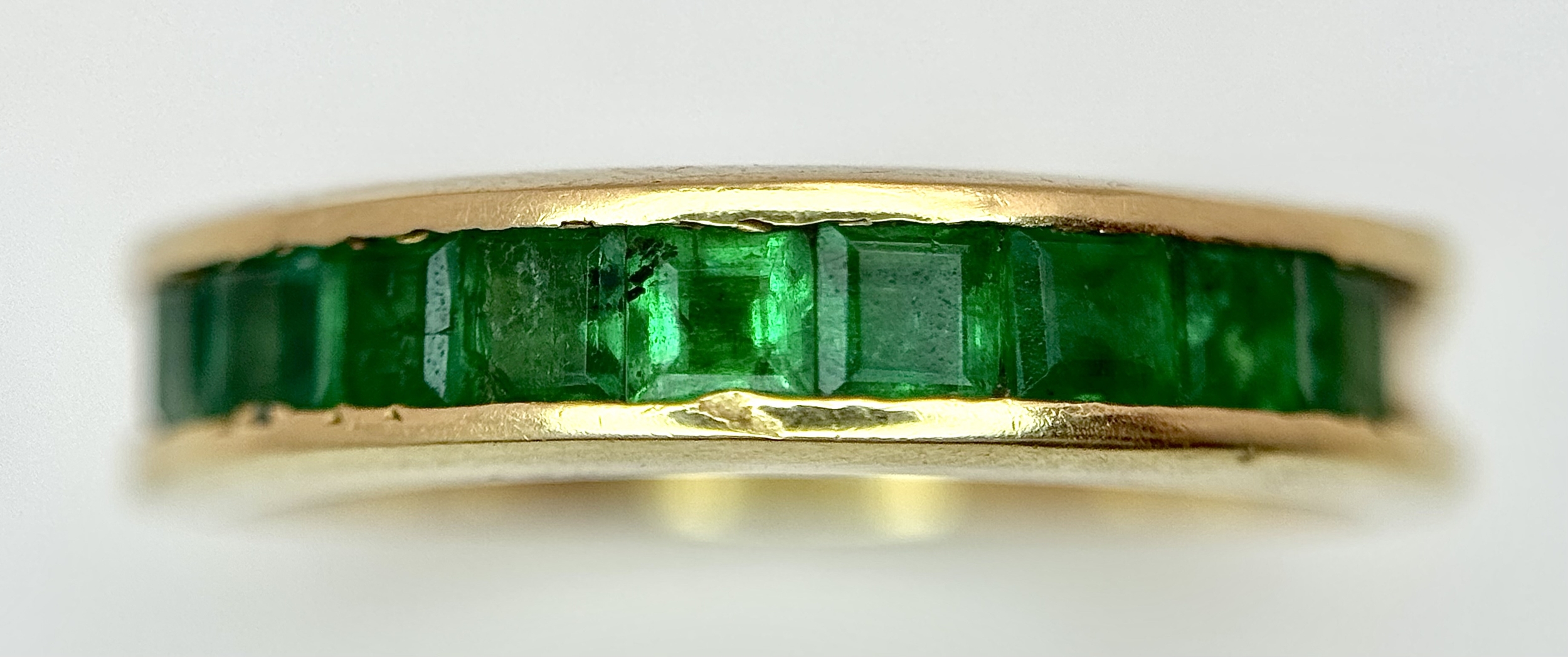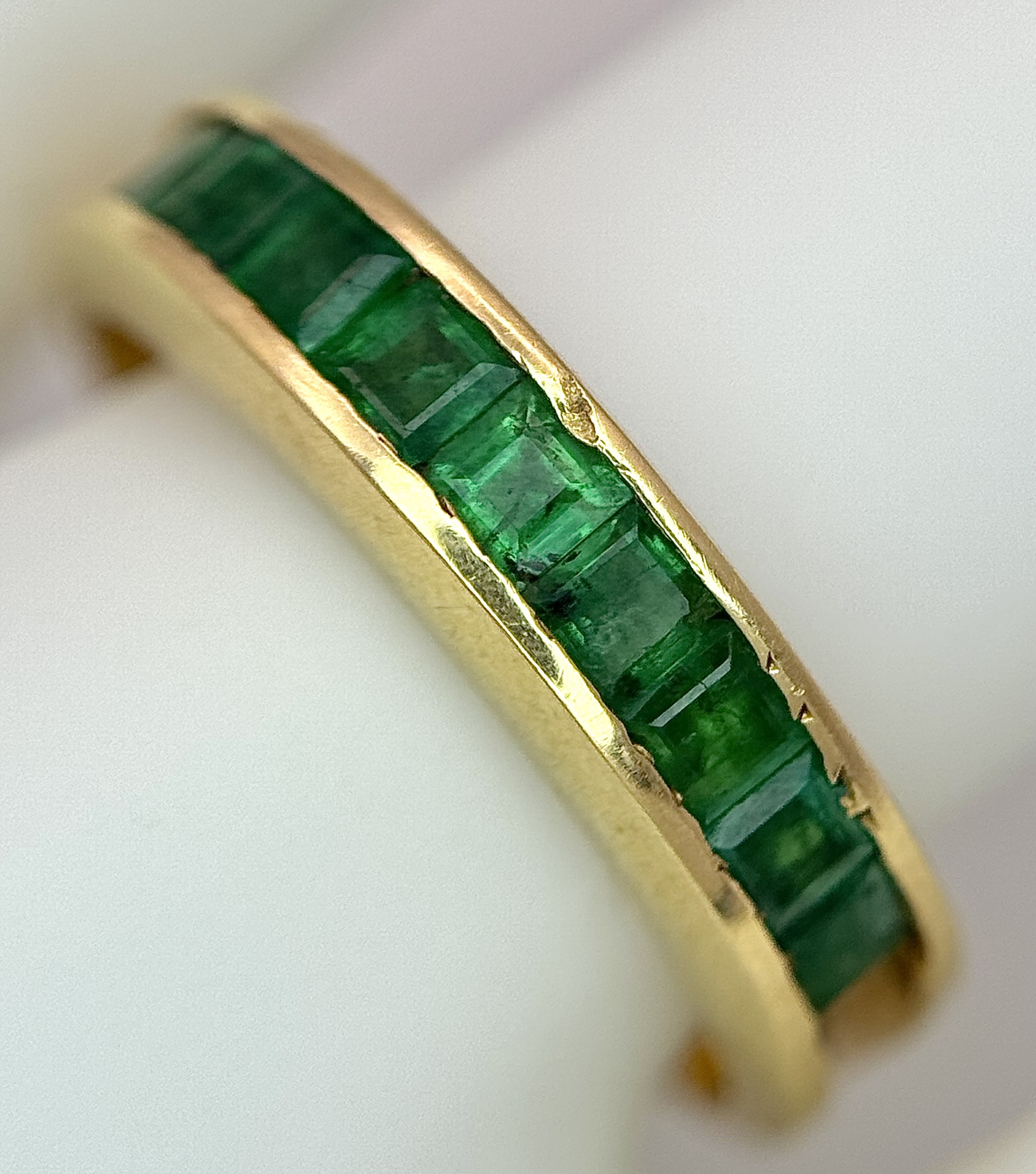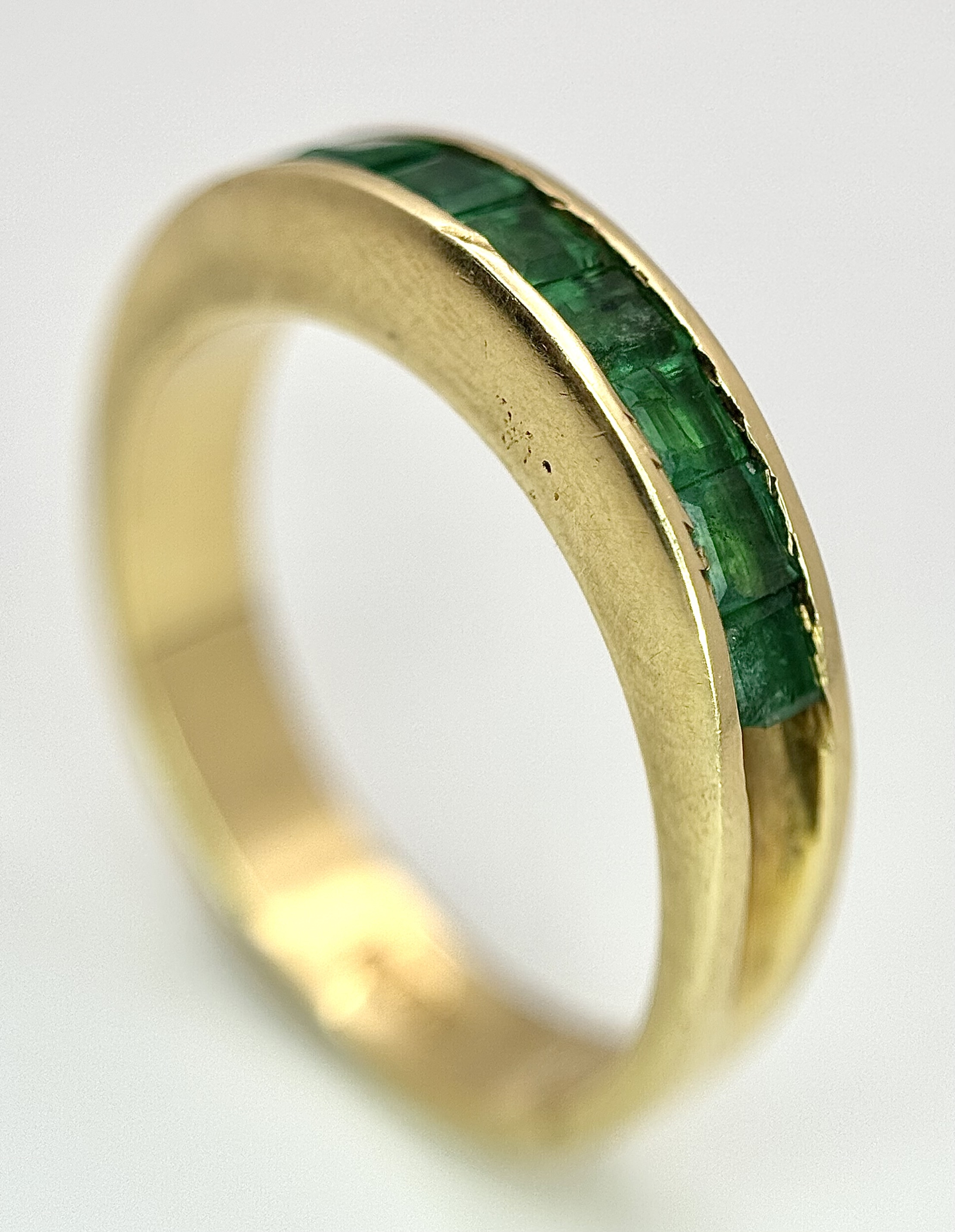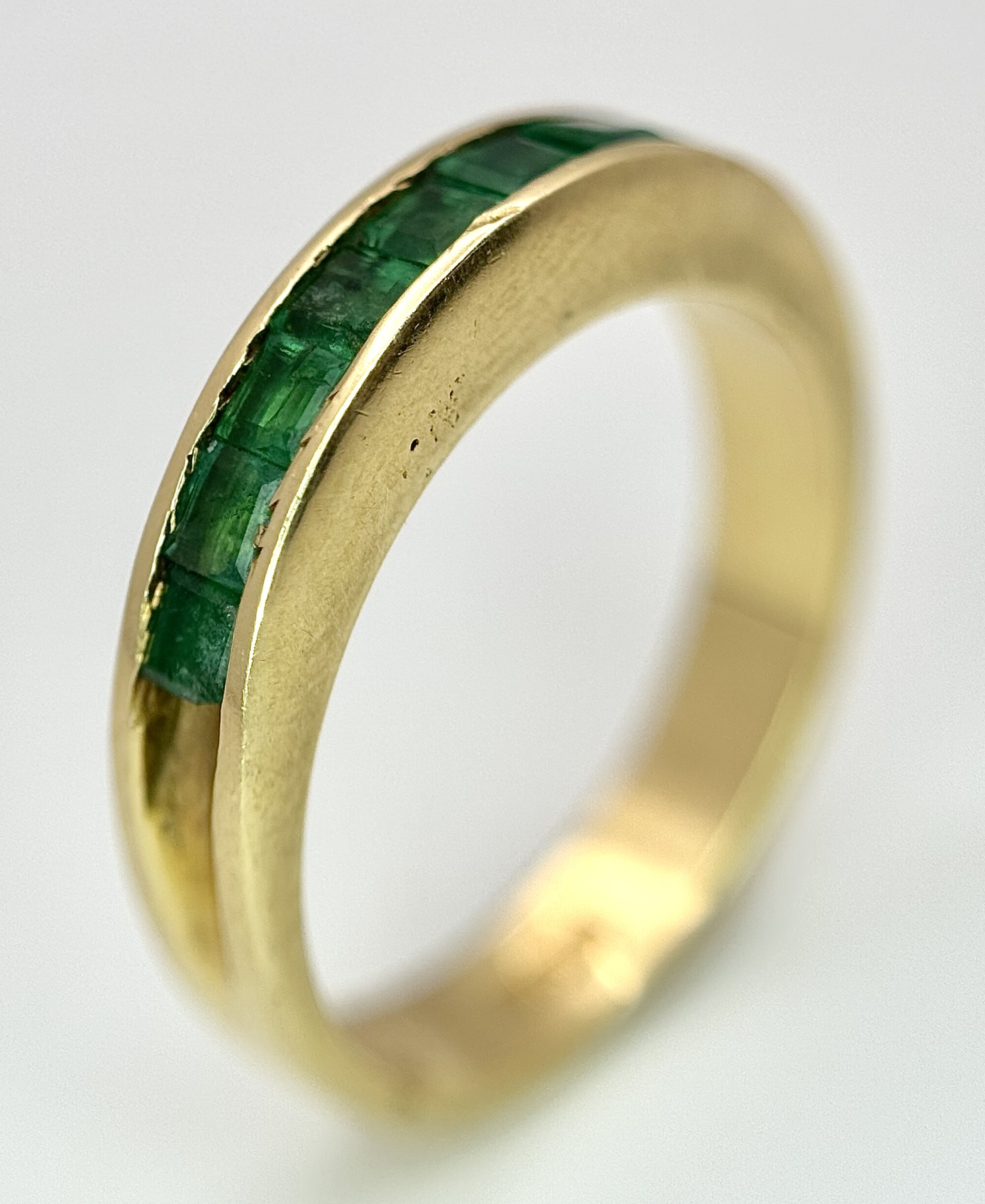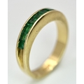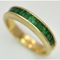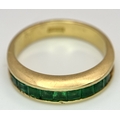 An 18K Yellow Gold Channel Set Emerald Ring. Size O. Nine square shaped emeralds. 5.8g. N10/24756.