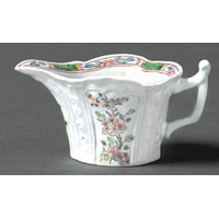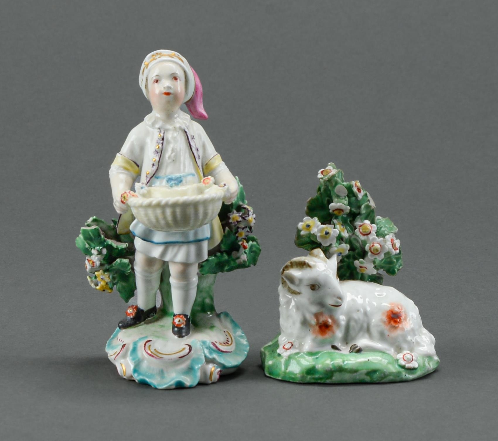 A Derby figure of a boy, c1770, holding a basket before an apron and wearing a puce cap, on turquoise rococo base, 11cm h and a Derby model of a sheep, early 19th c (2)