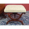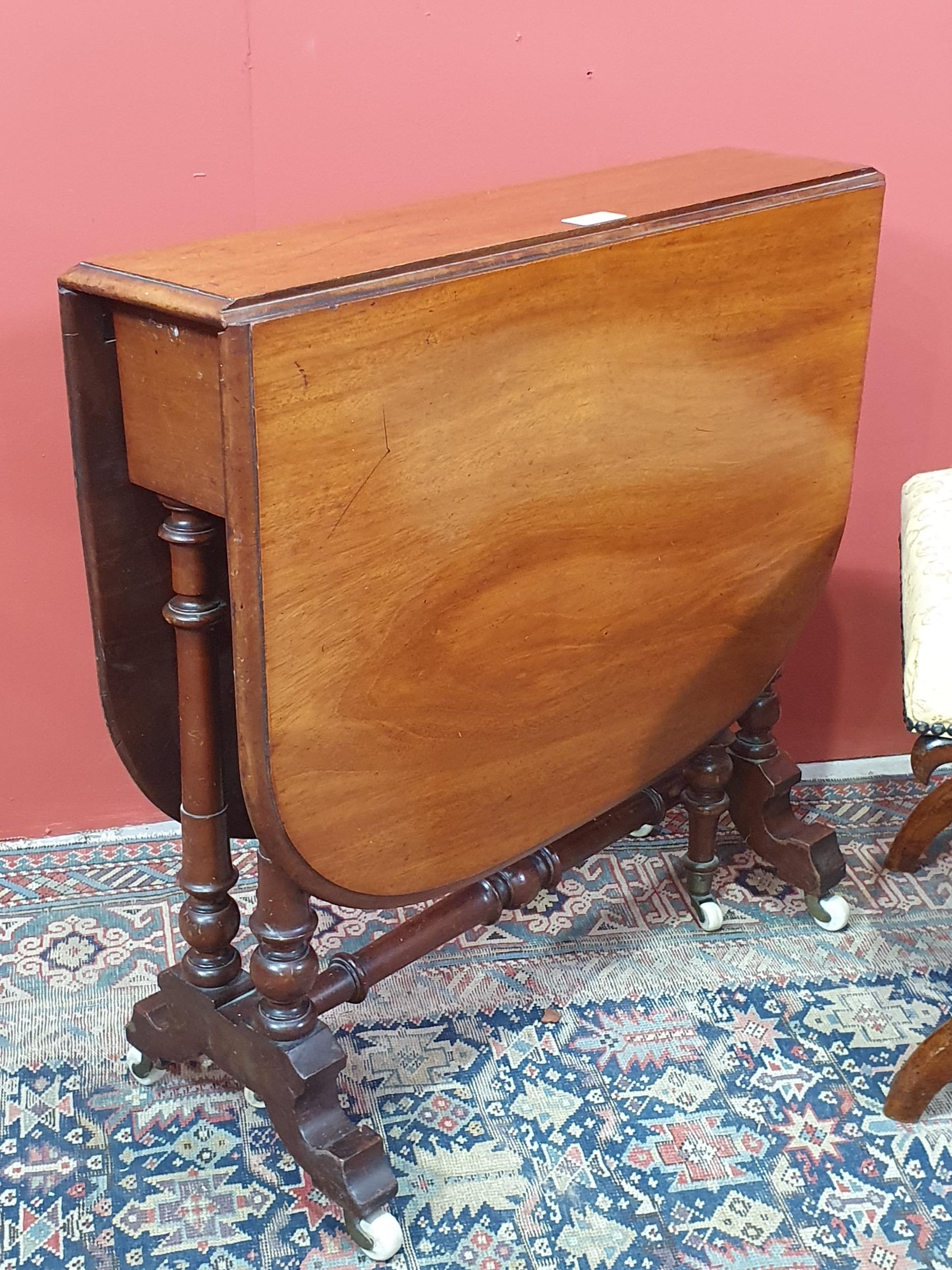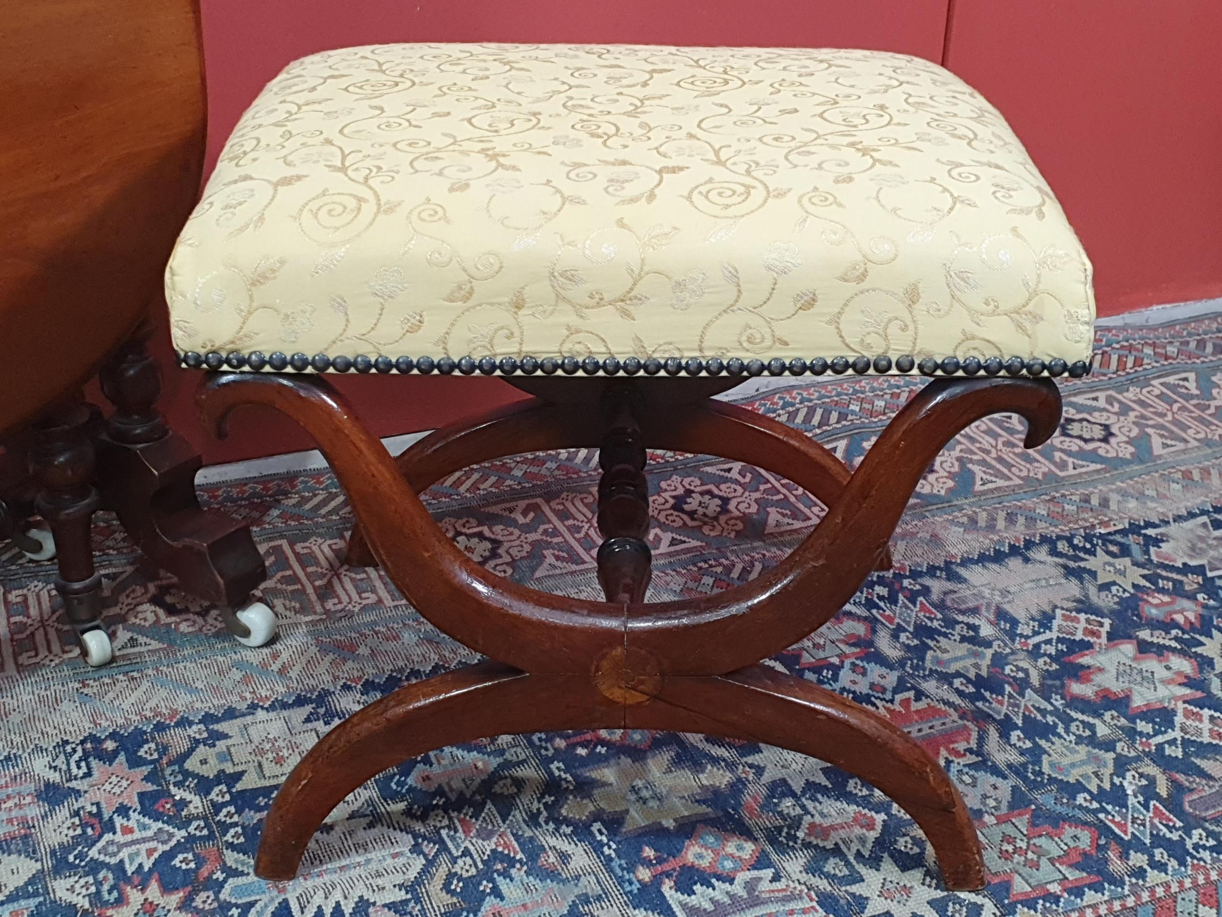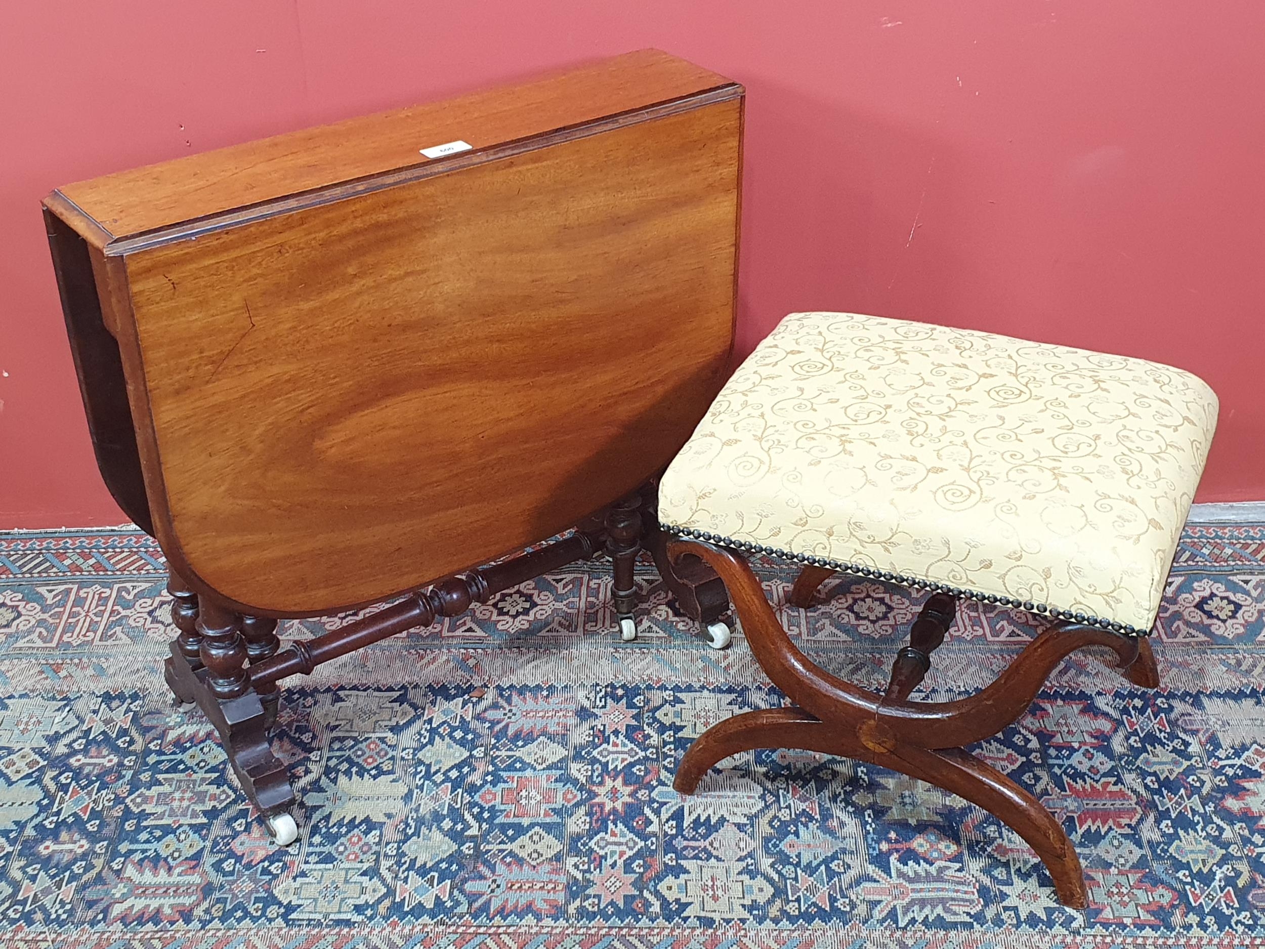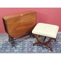 A Victorian walnut Sutherland Table on turned supports 2ft 3in W x 2ft 2in H and a mahogany X-frame Stool with yellow upholstery 1ft 6in W x 1ft 4in H (R2)