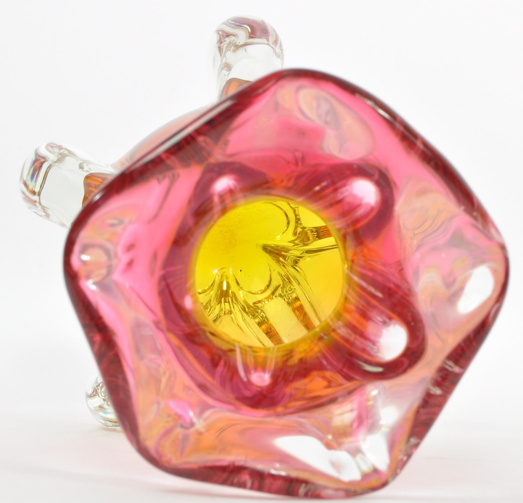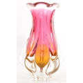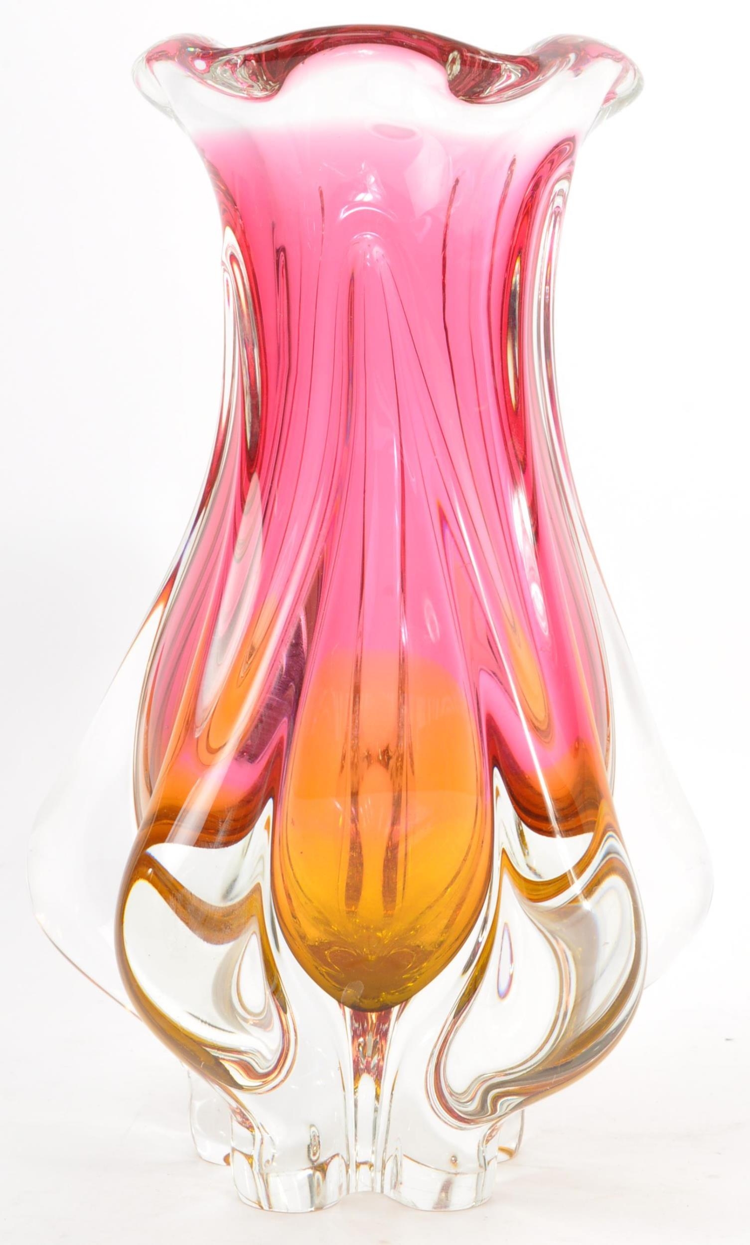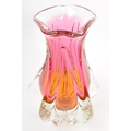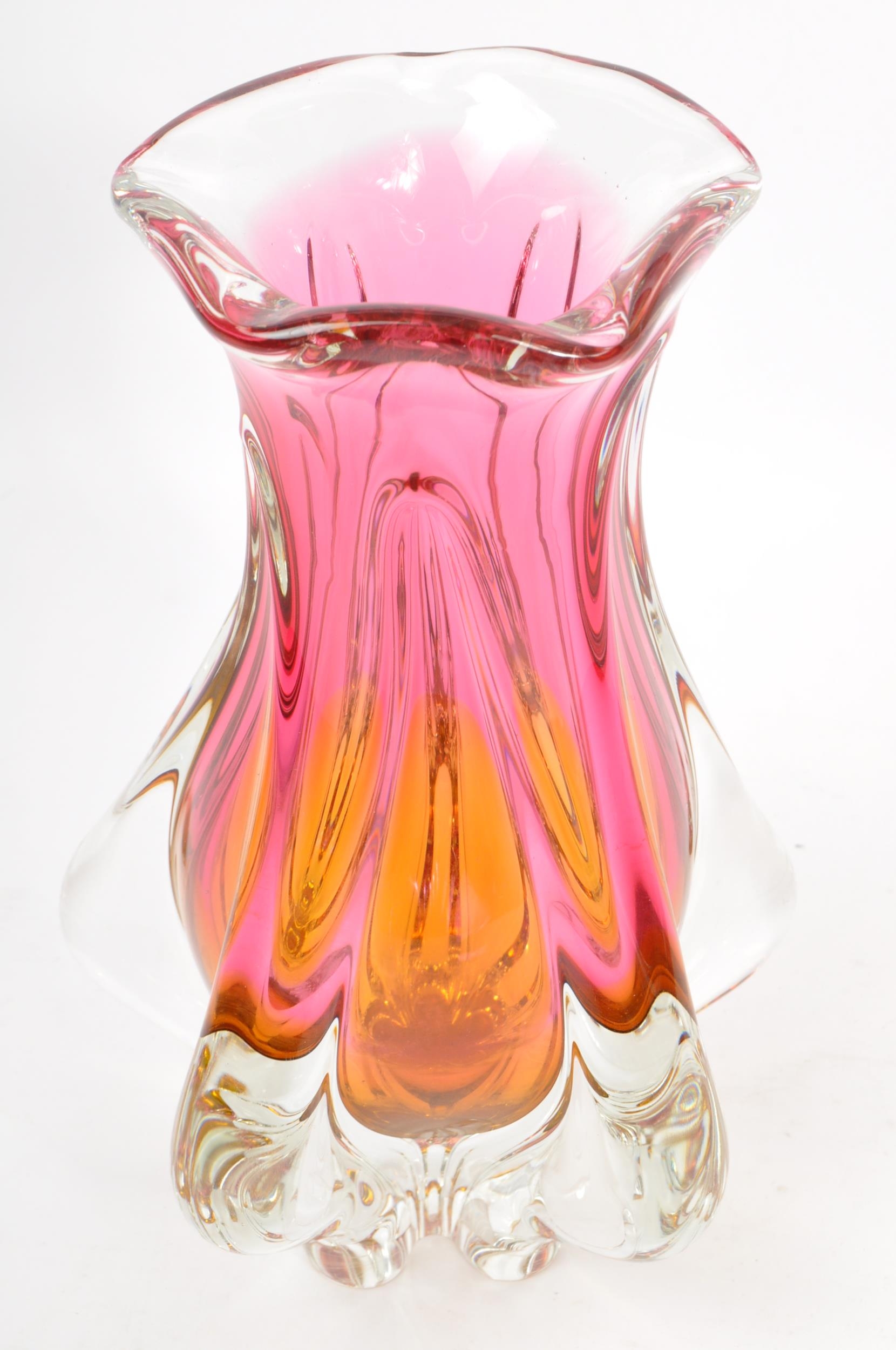 Two retro mid 20th Century Bohemian Czechoslovakian studio art glass vases in a pink and amber colourway by Josef Hospodka for Chribska Sklo Union. Largest measures 22cm (height).