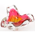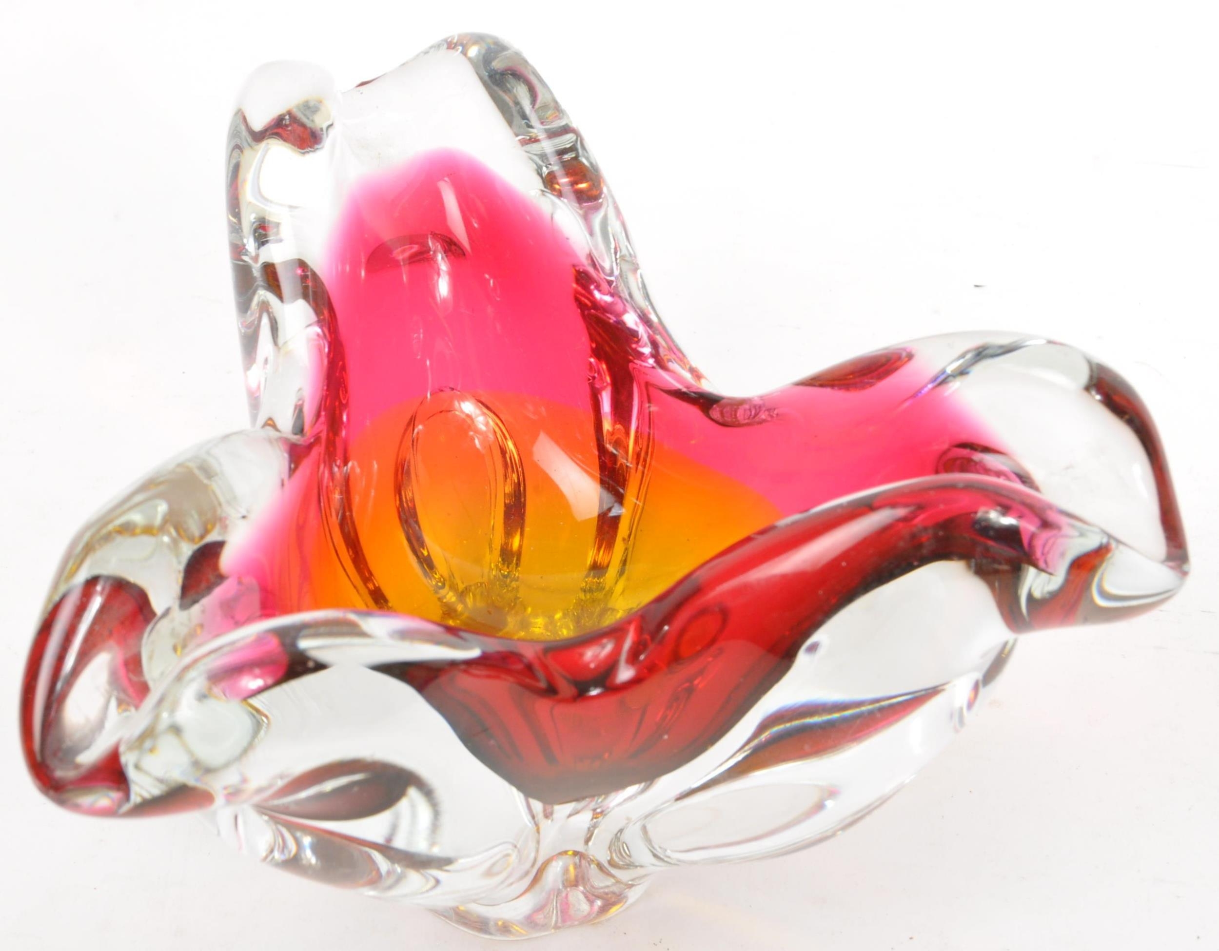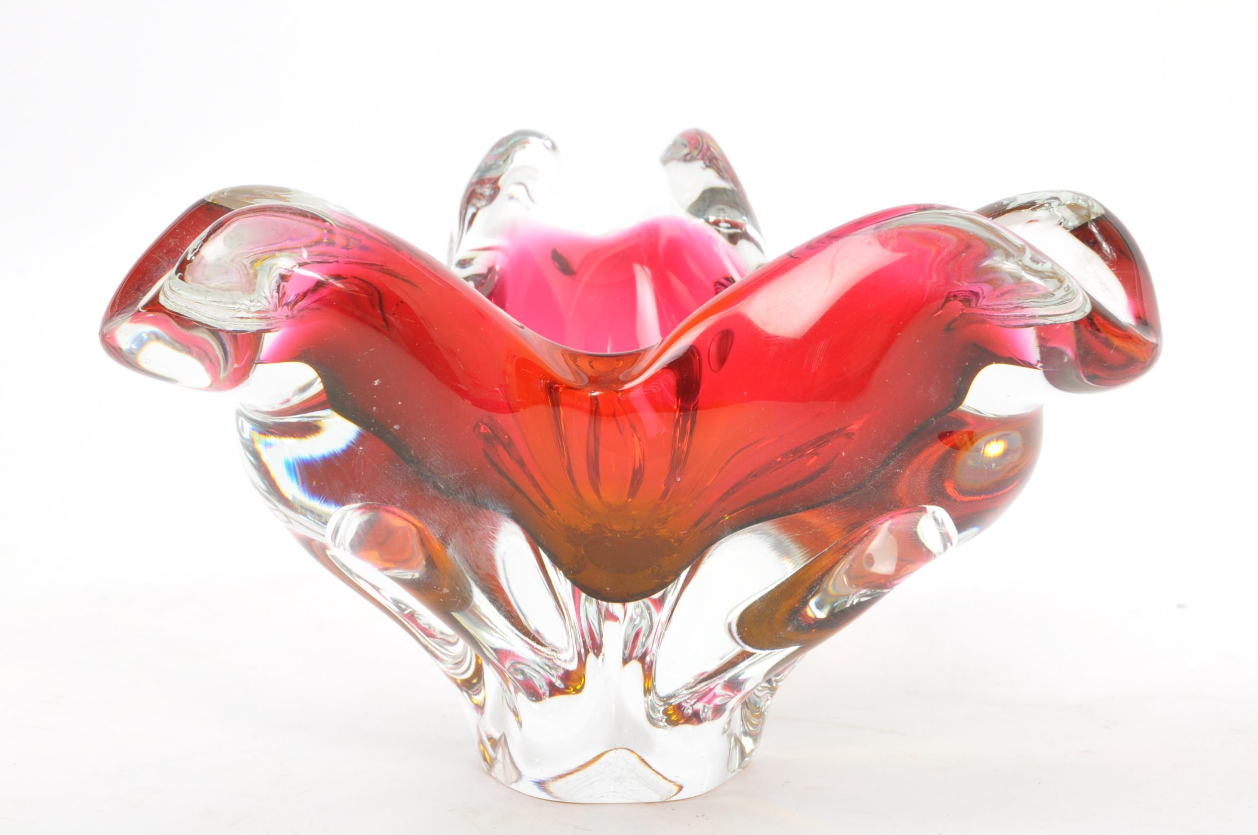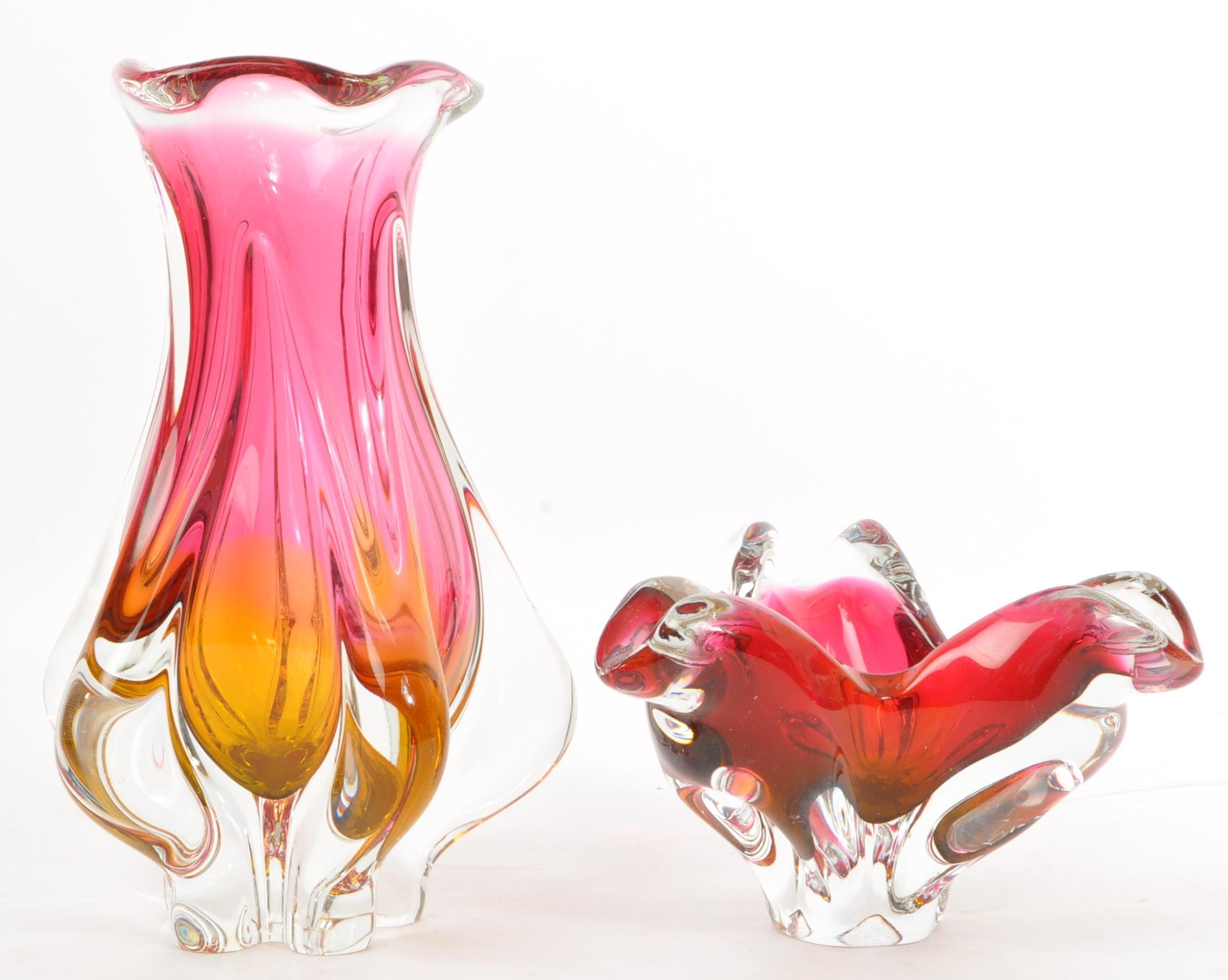 Two retro mid 20th Century Bohemian Czechoslovakian studio art glass vases in a pink and amber colourway by Josef Hospodka for Chribska Sklo Union. Largest measures 22cm (height).