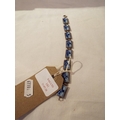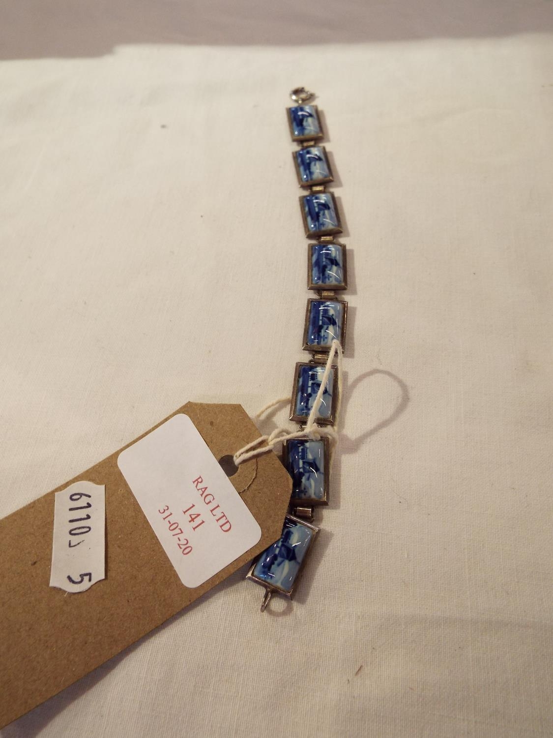A white metal bracelet inset with Delft tiles