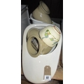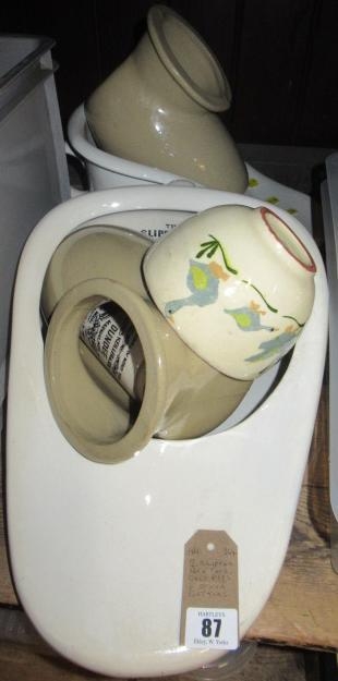 TWO SLIPPER BED PANS SALT PIGS AND STONE BOTTLES