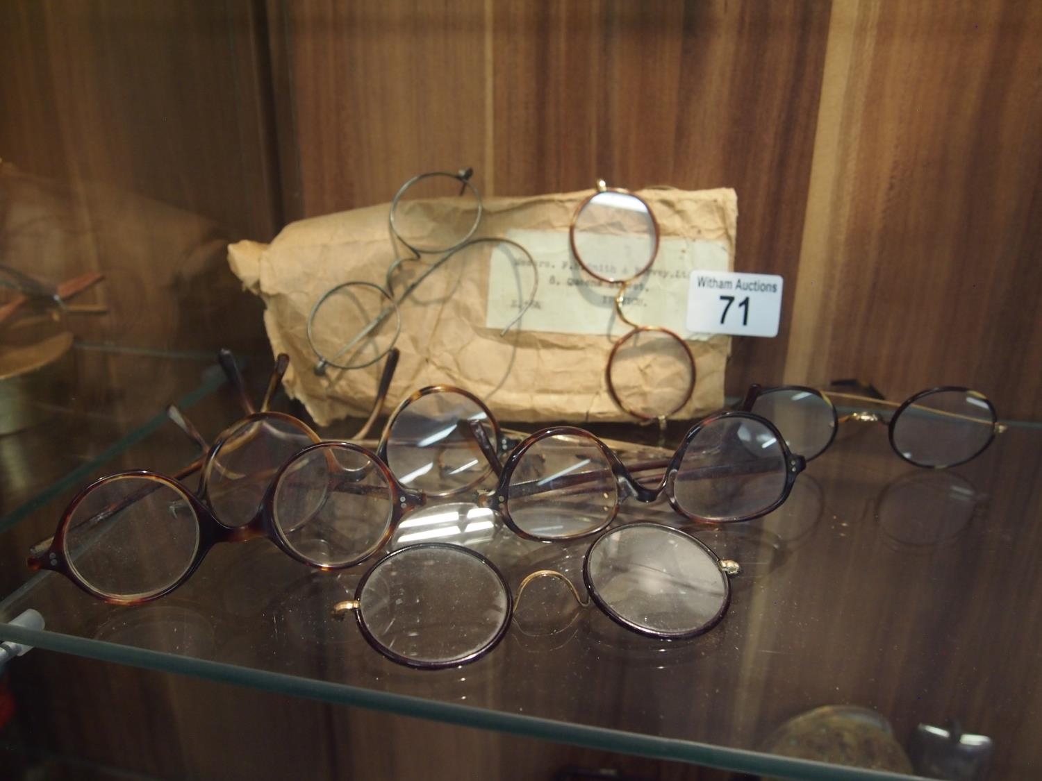 A collection of old spectacles with circular frames including gold/gold coloured wire frames (part tested), faux tortoiseshell etc.