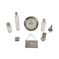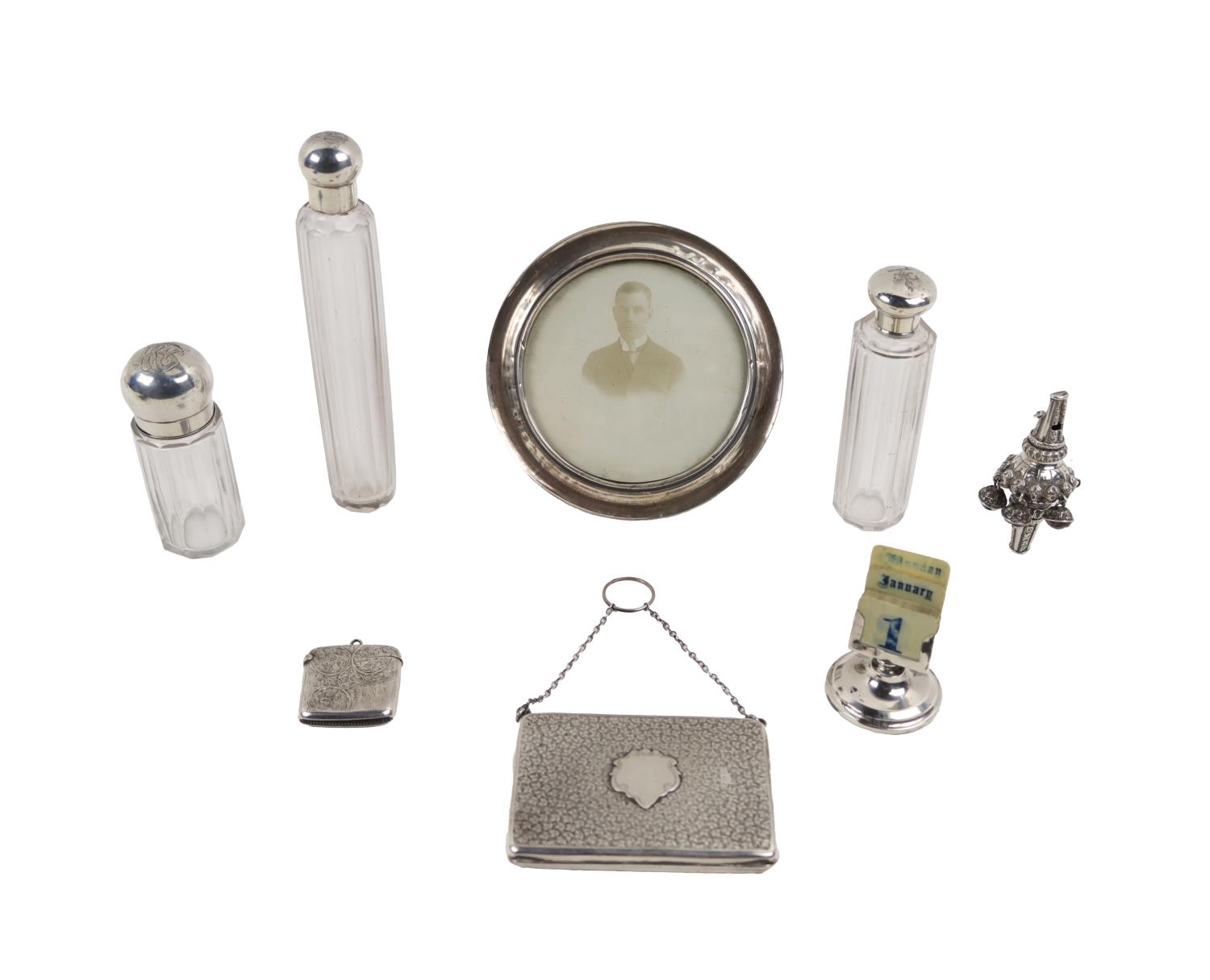 Silverware: An attractive English silver etched leaf design Purse or Organizer, with chain, Birmingham, 1898, by Minshull & Latimer, approx. 4.2 ounces; an etched silver Vesta Case with monogram & date, Birmingham 1909, by Joseph Cook & Sons, approx. 8 ounces; a silver date Calendar (with cards), Birmingham, A.J. Peppers & Co. 1915; a circular silver Picture Frame, Chester, S. Blanckensee & Son Ltd.; three silver capped glass Bottles, and a silver Childs Rattle, as a lot. (8)