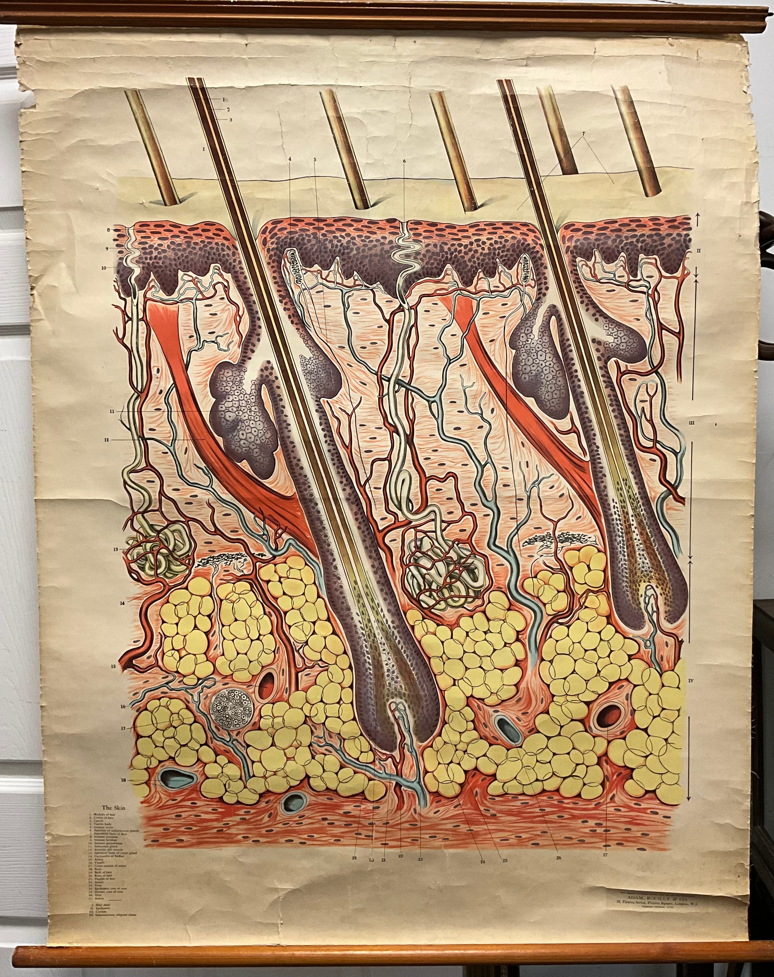 An early 20th century anatomical wall chart by Adam Rouilly & Co, showing a cross section thorough Skin, 107cm x 84.cm wide