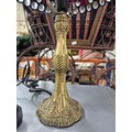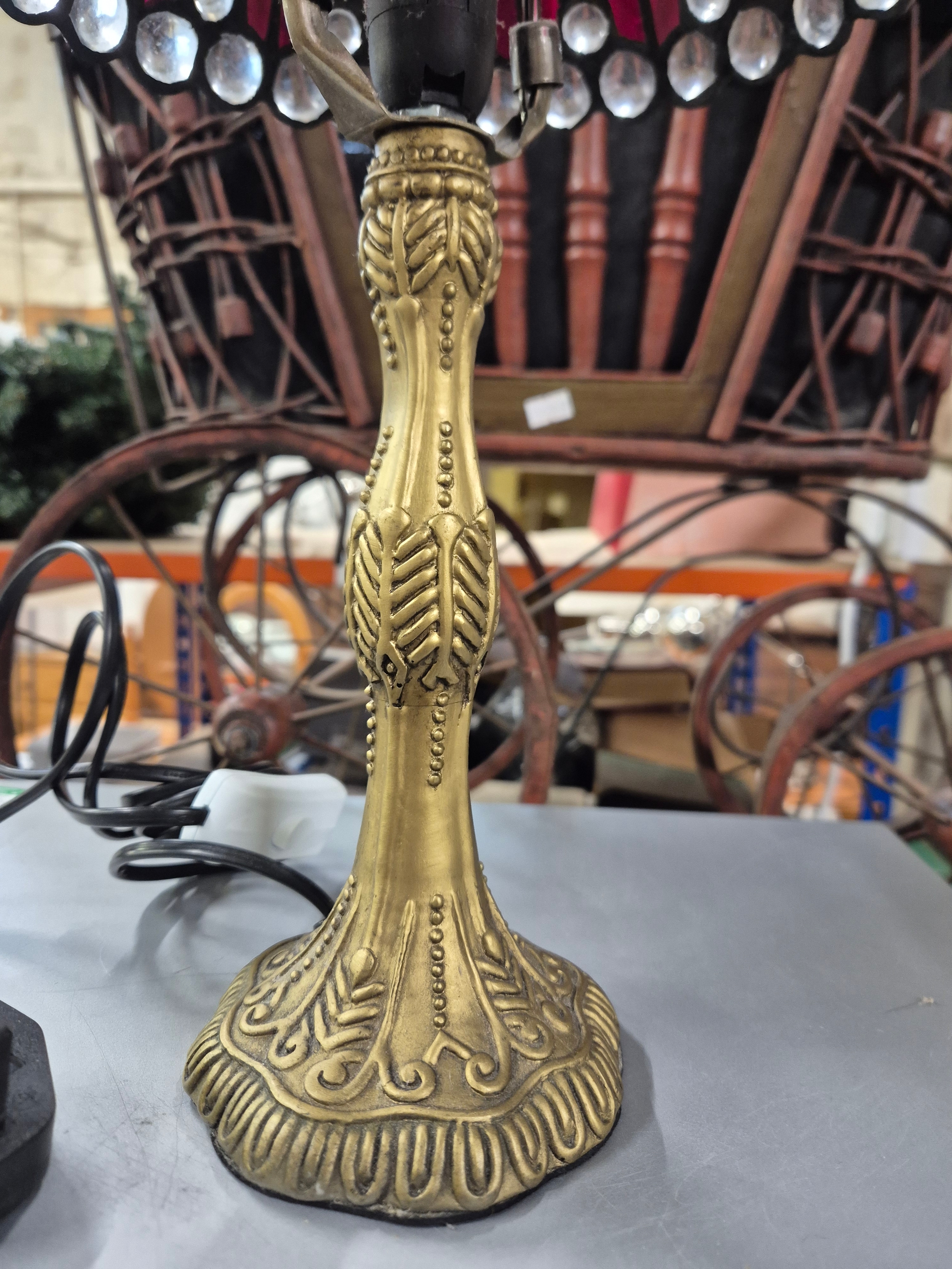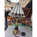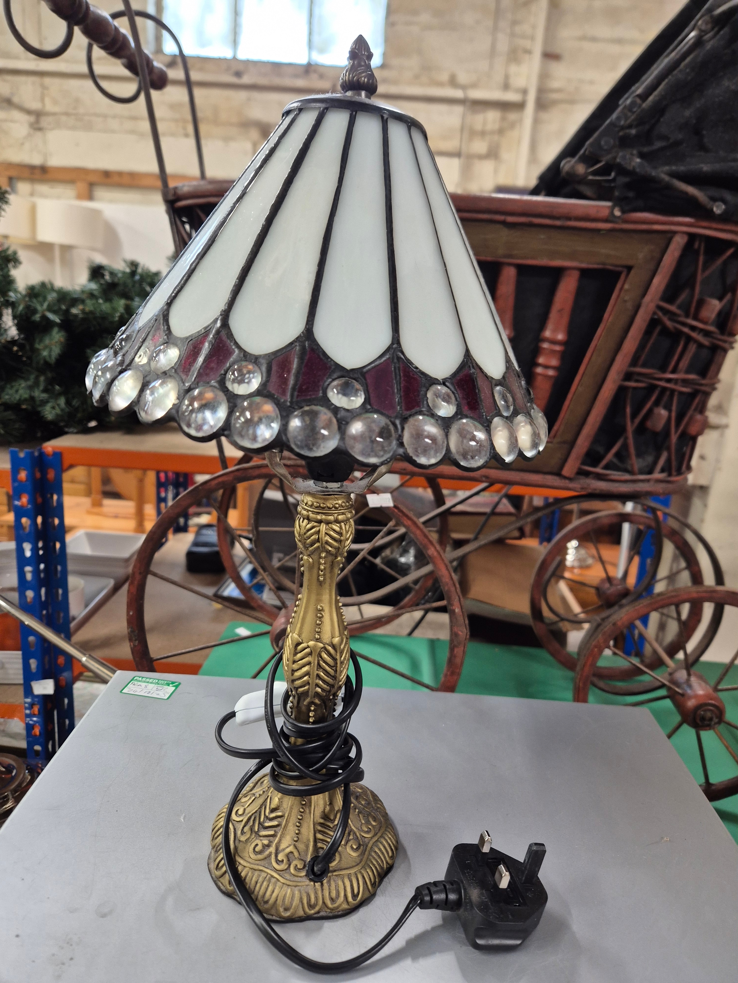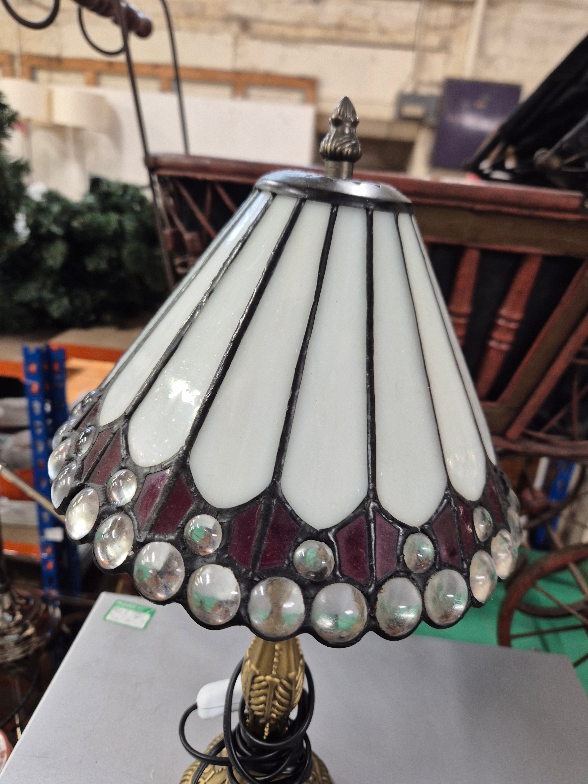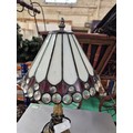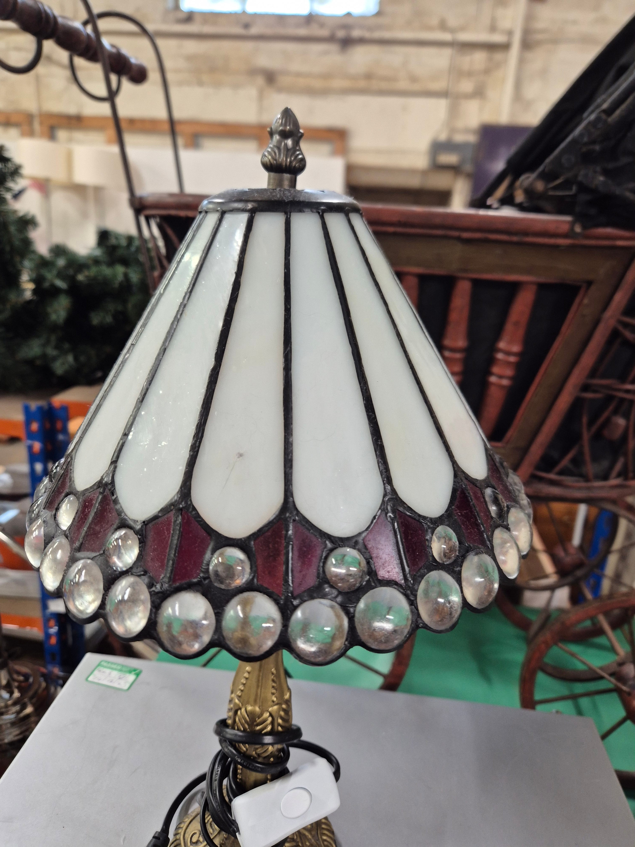 Small traditional white Tiffany-style table lamp with multiple transparent glass jewels and an antique bronze cast resin base.