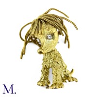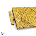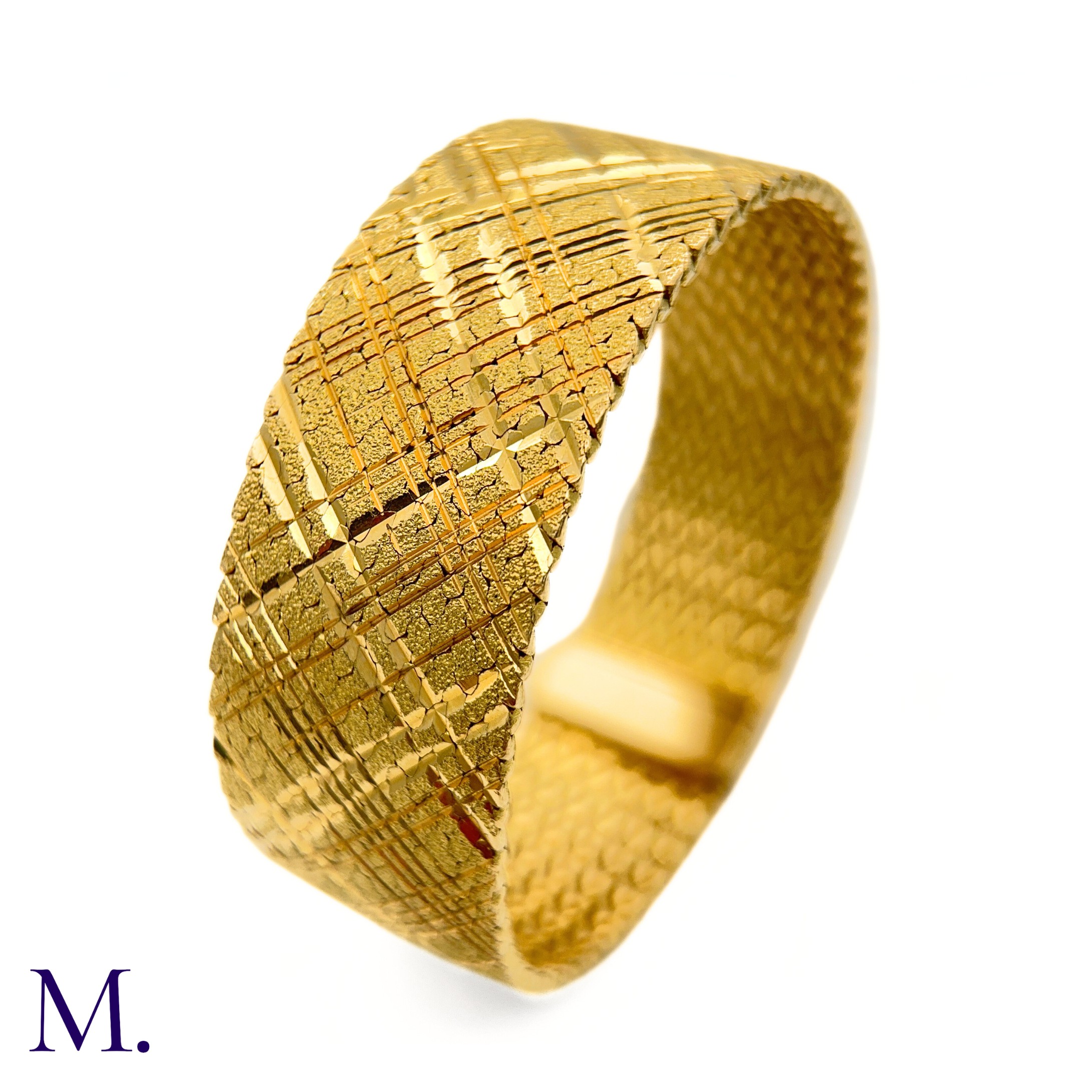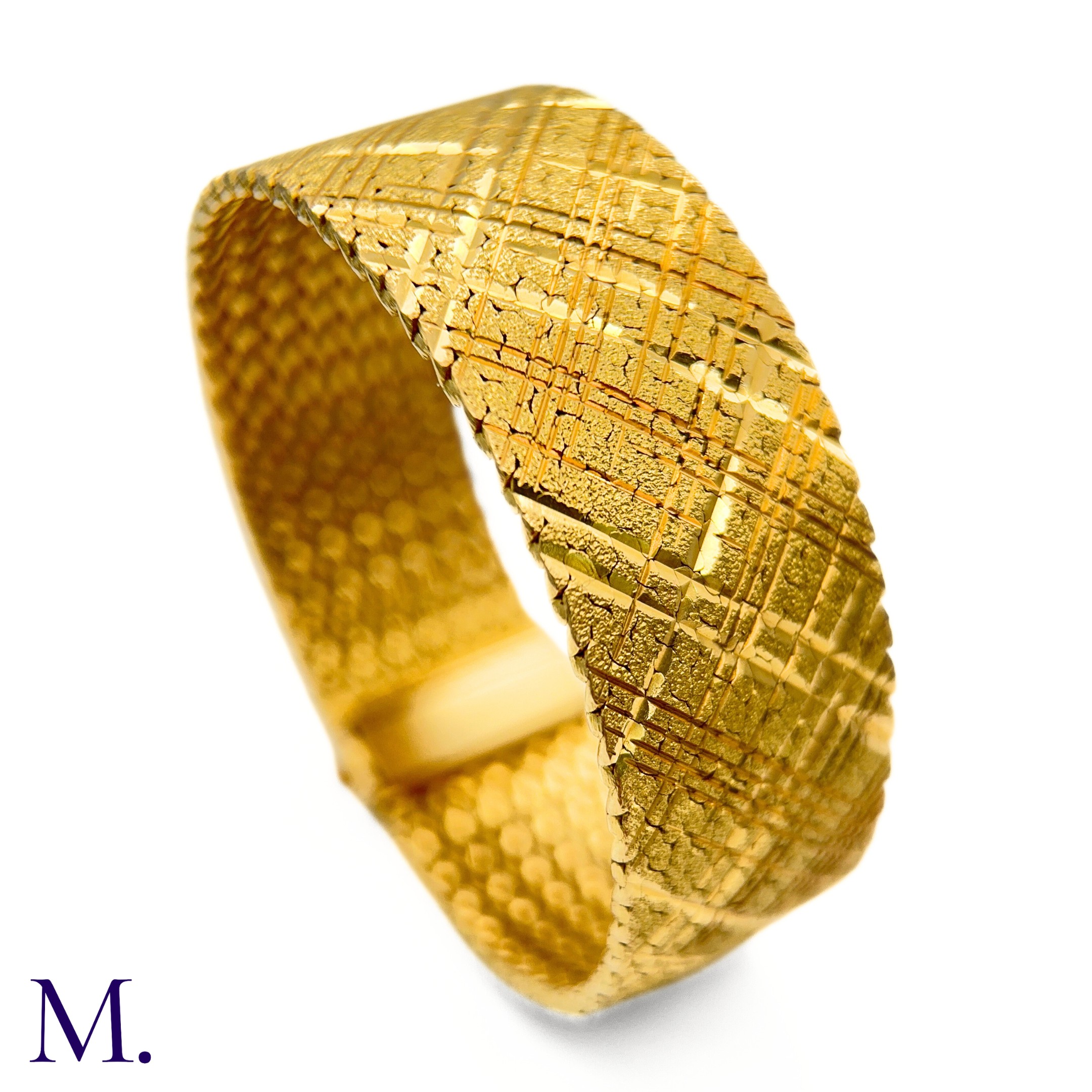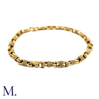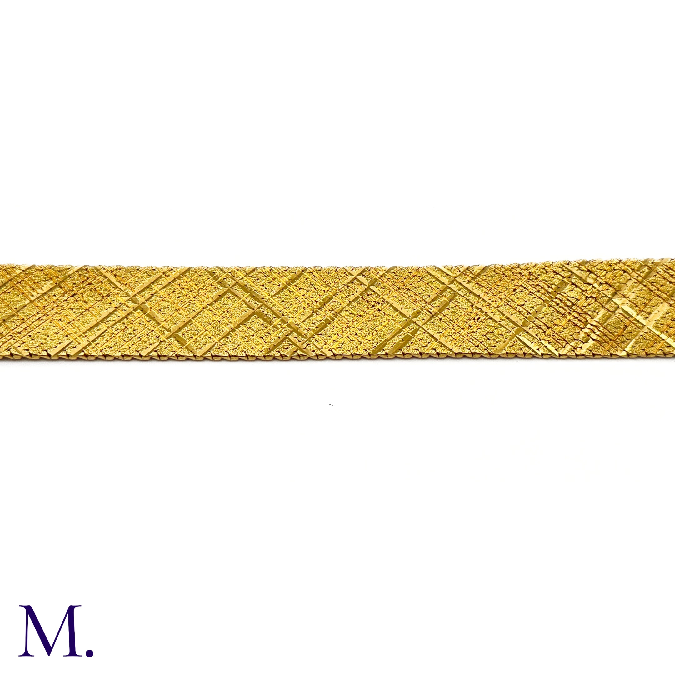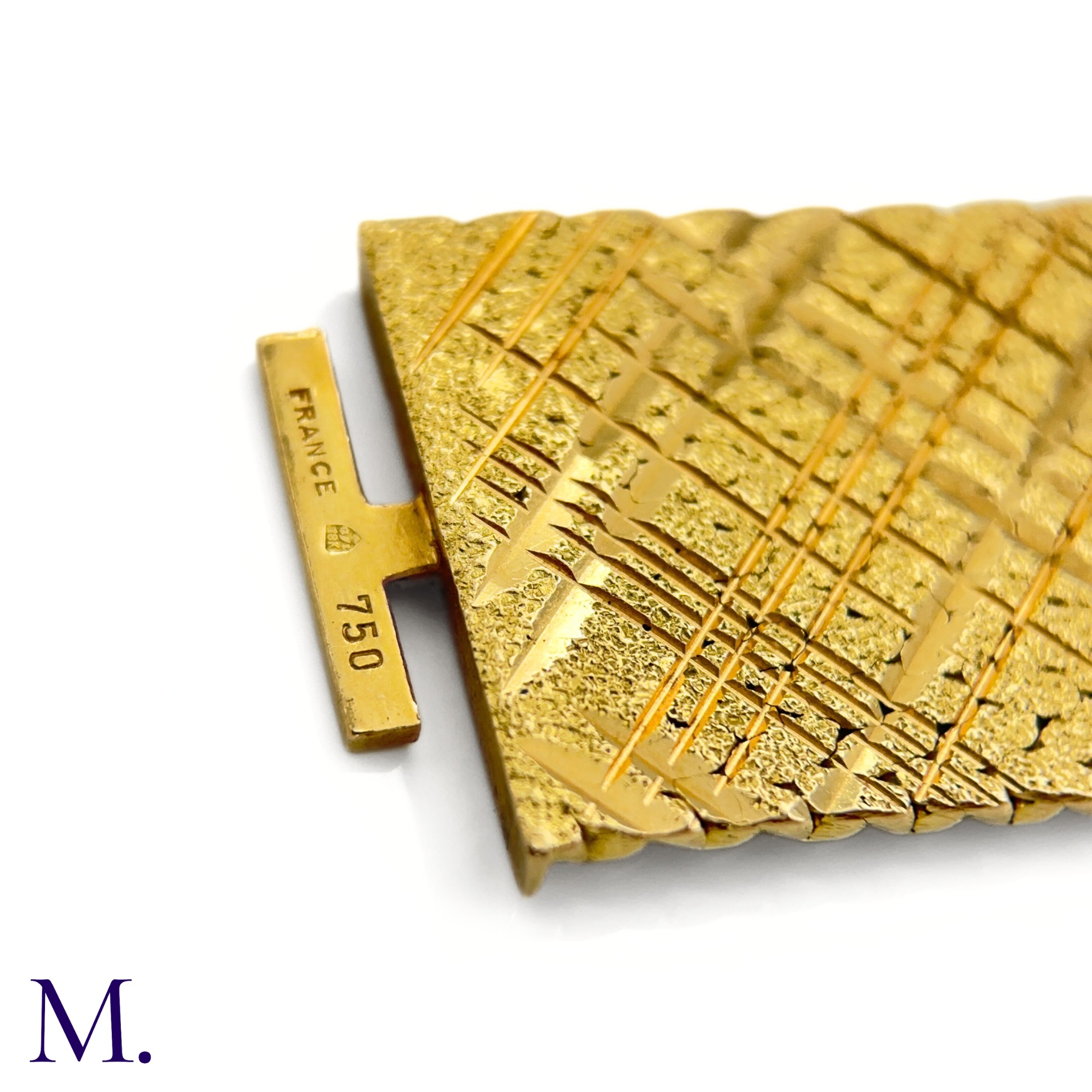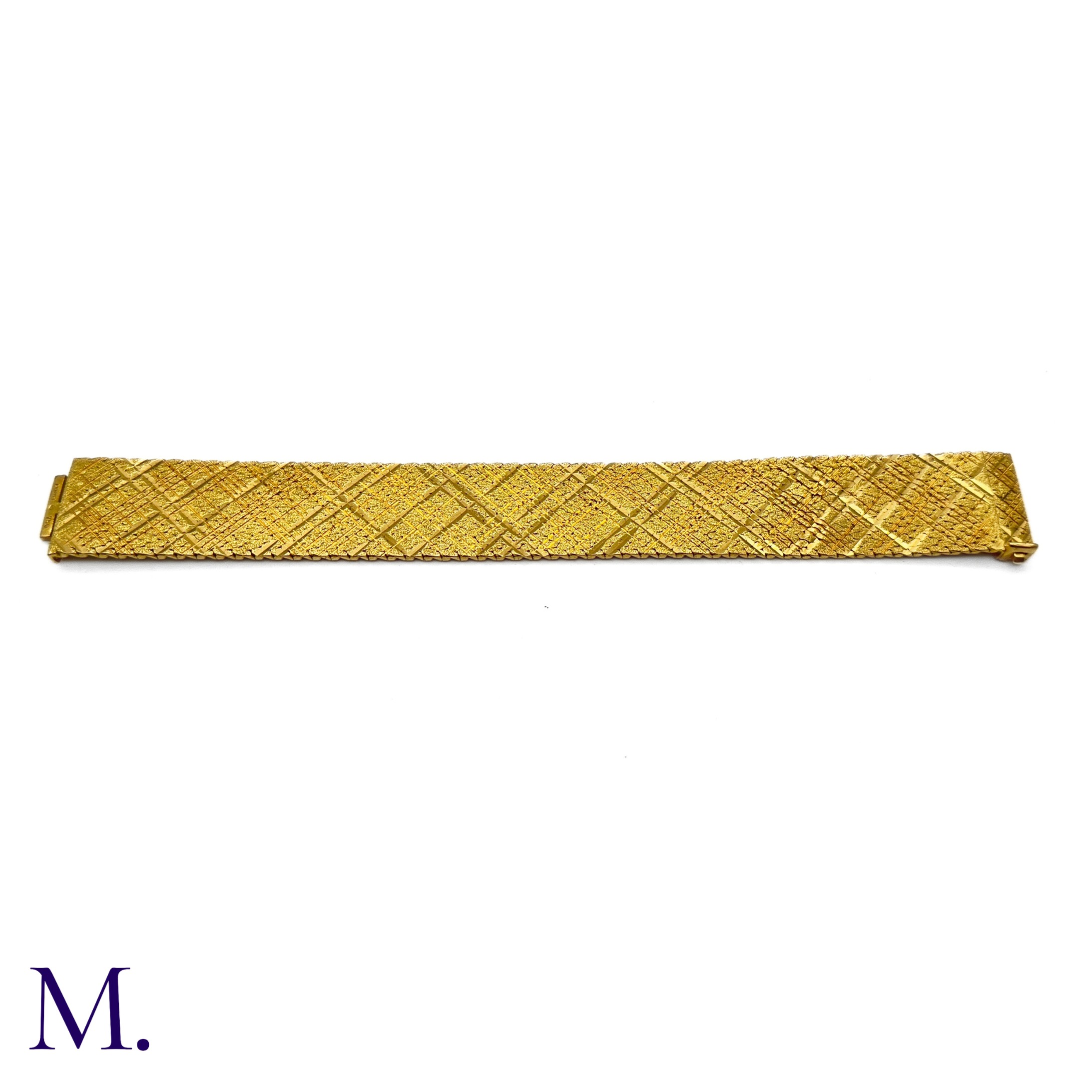 The 18ct yellow gold bracelet in woven and striated pattern is marked '750' for 18ct gold and with the maker's mark for Georges Lenfant.