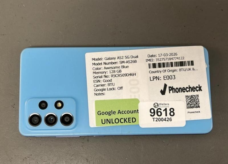 X1SAMSUNG GALAXY A52 5G DUAL/ SM-A526B/ AWESOME BLUE/ 128GB/ GOOGLE LOCKED/ IMEI: 352757184774122