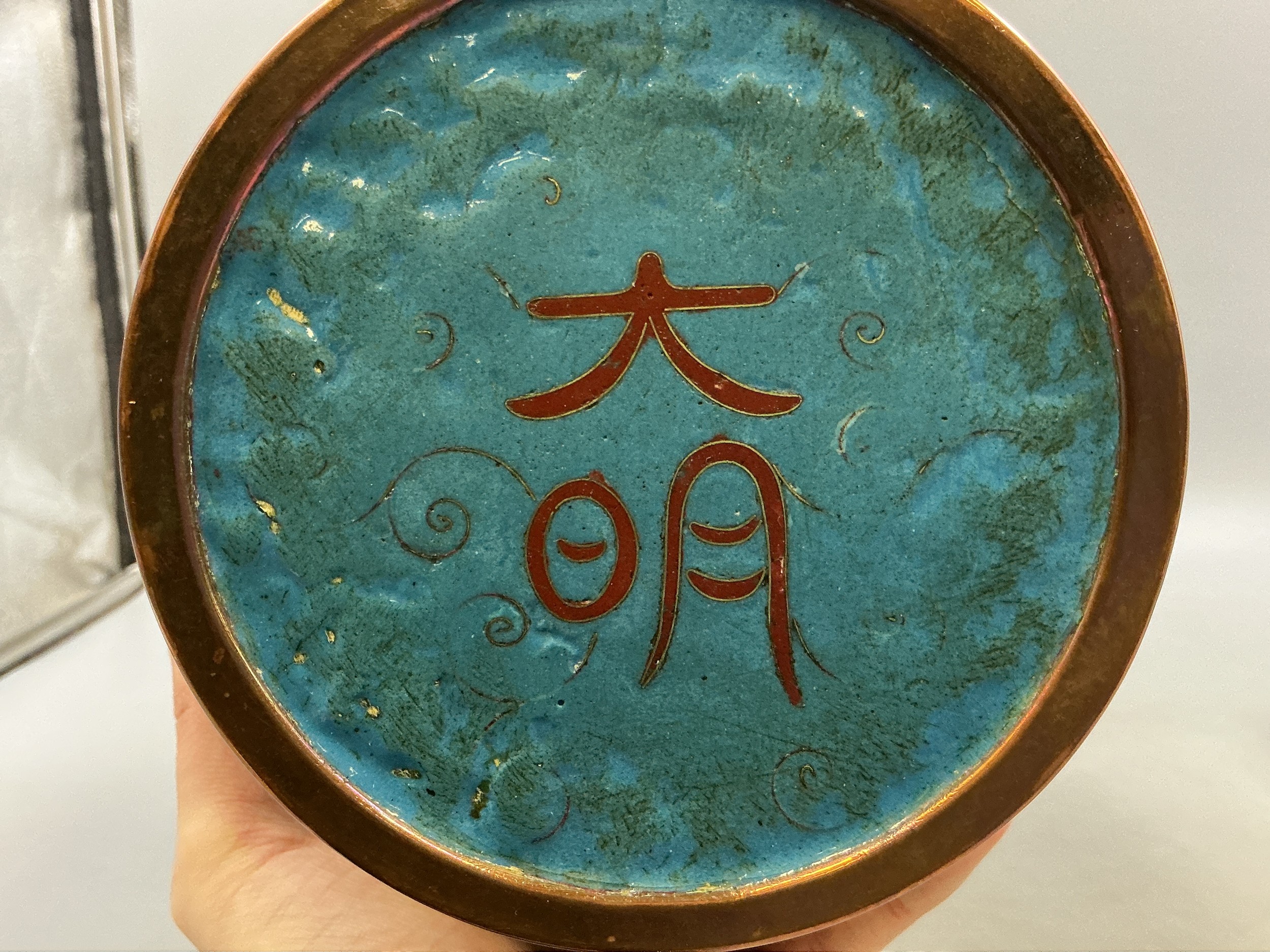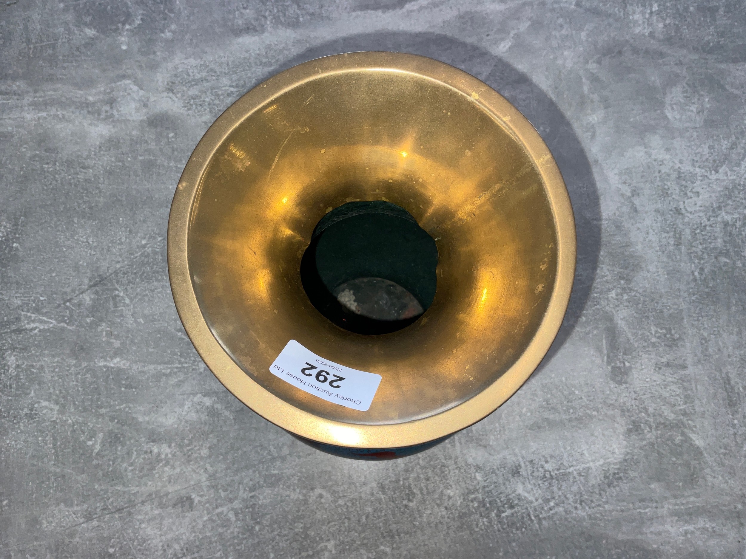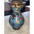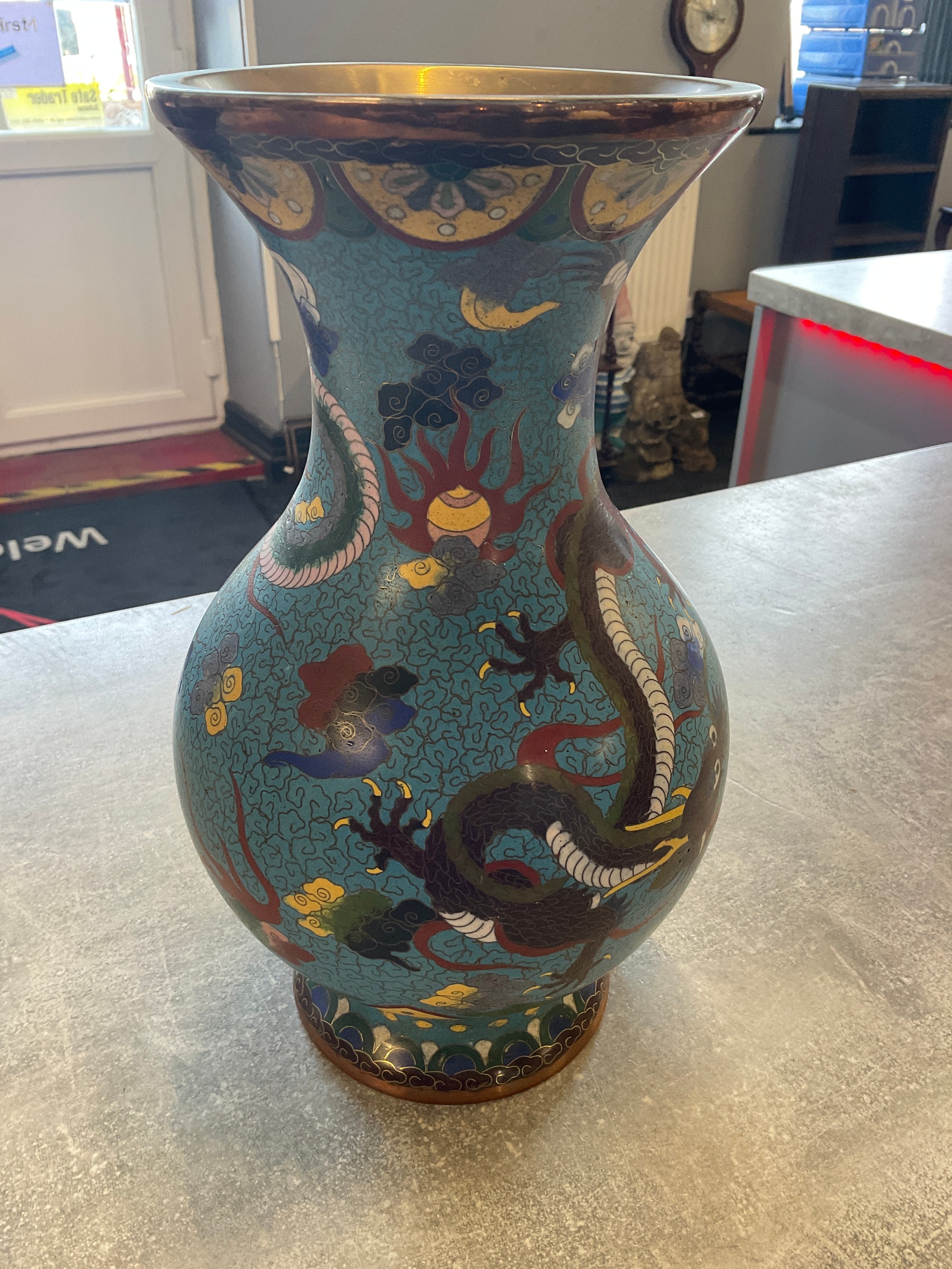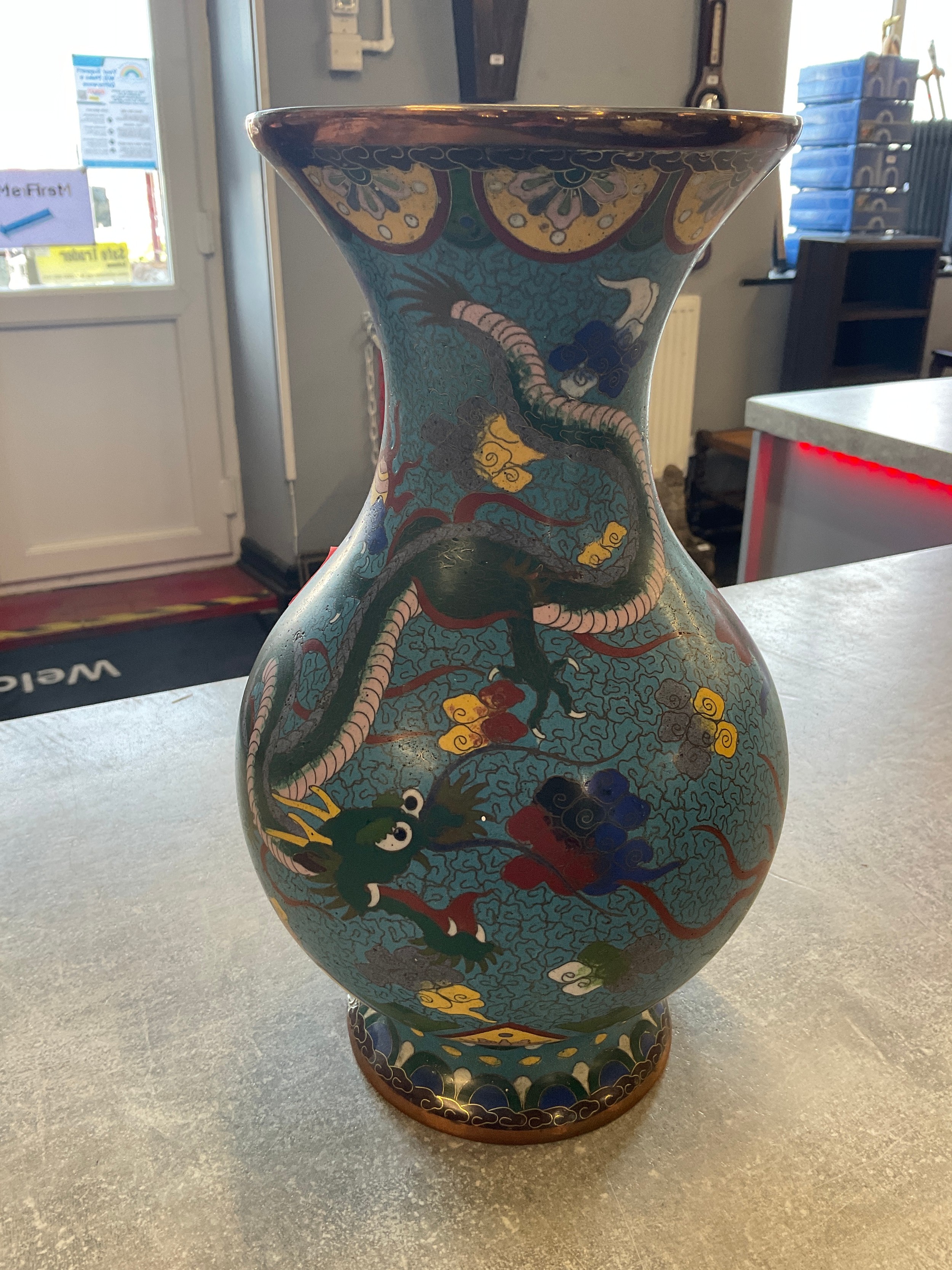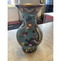 Large Hand Painted Chinese Dragon Cloisonne Vase on wooden p...