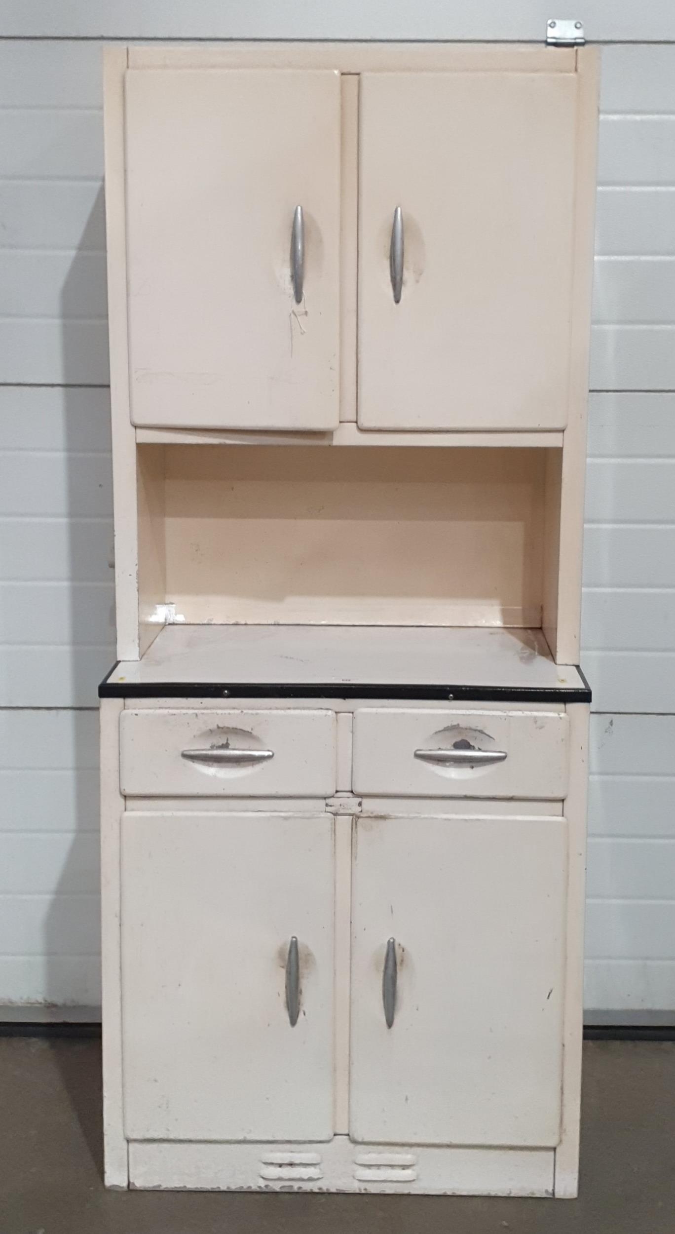 A "House Proud" white painted metal Kitchen Unit the top section fitted pair of doors, above open prep surface, the base fitted pair of drawers above pair of doors (House Proud applied plaque between drawers), A/F, 5ft 11" High x 2ft 6"Wide x 1ft 6"Deep.