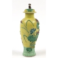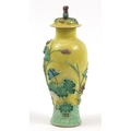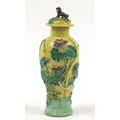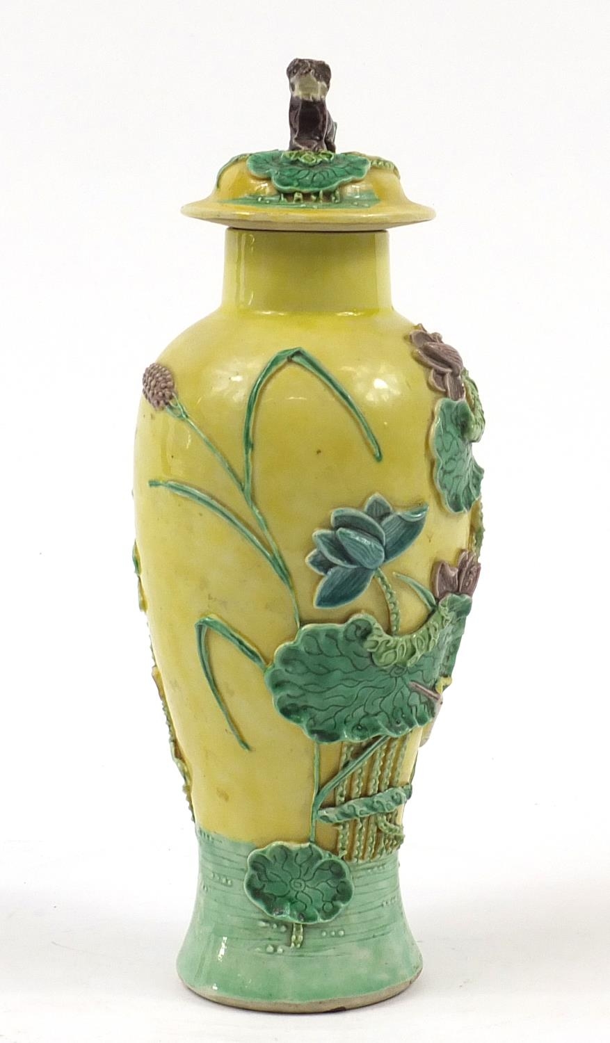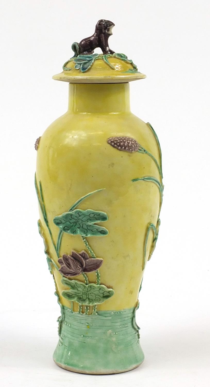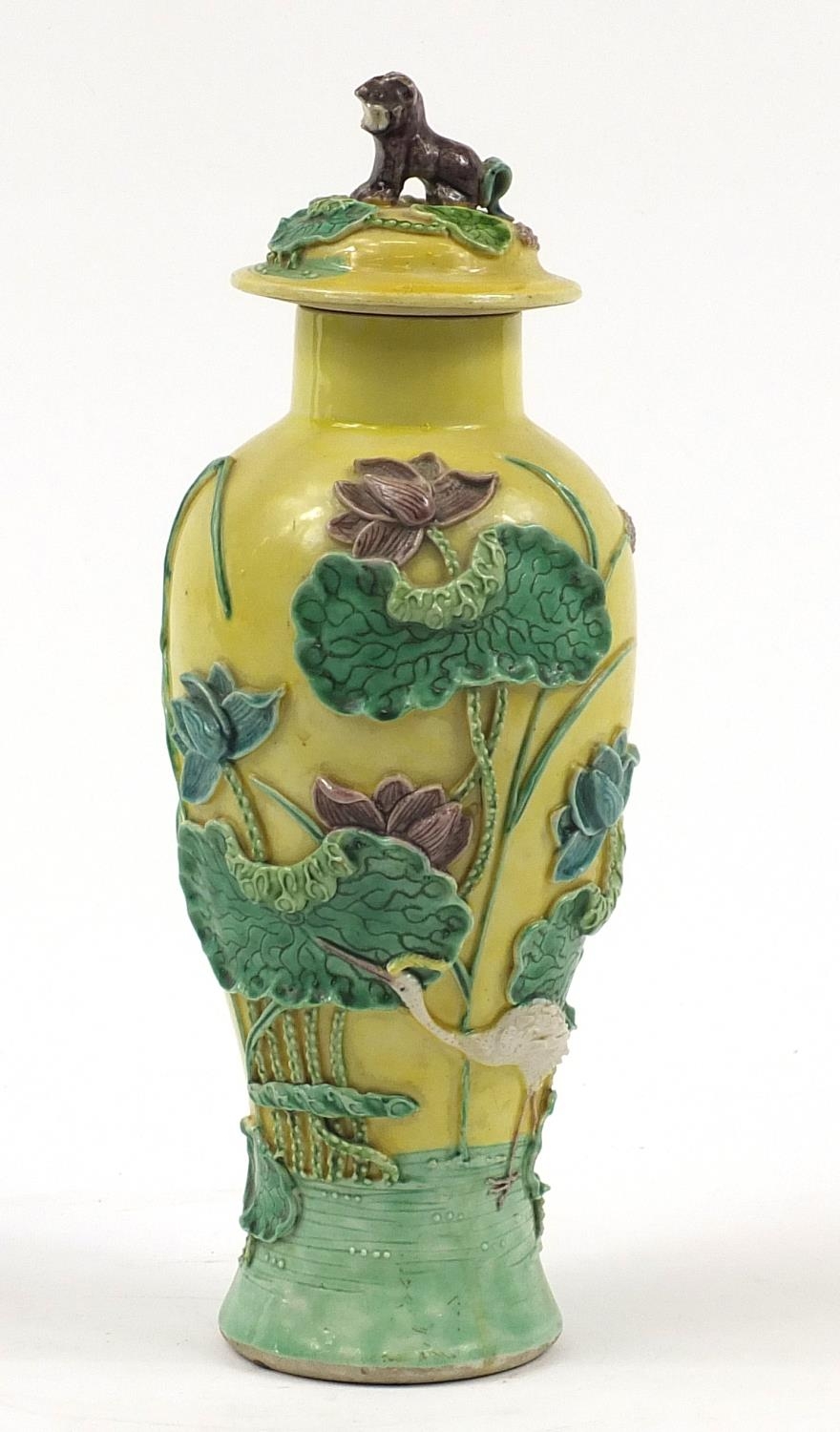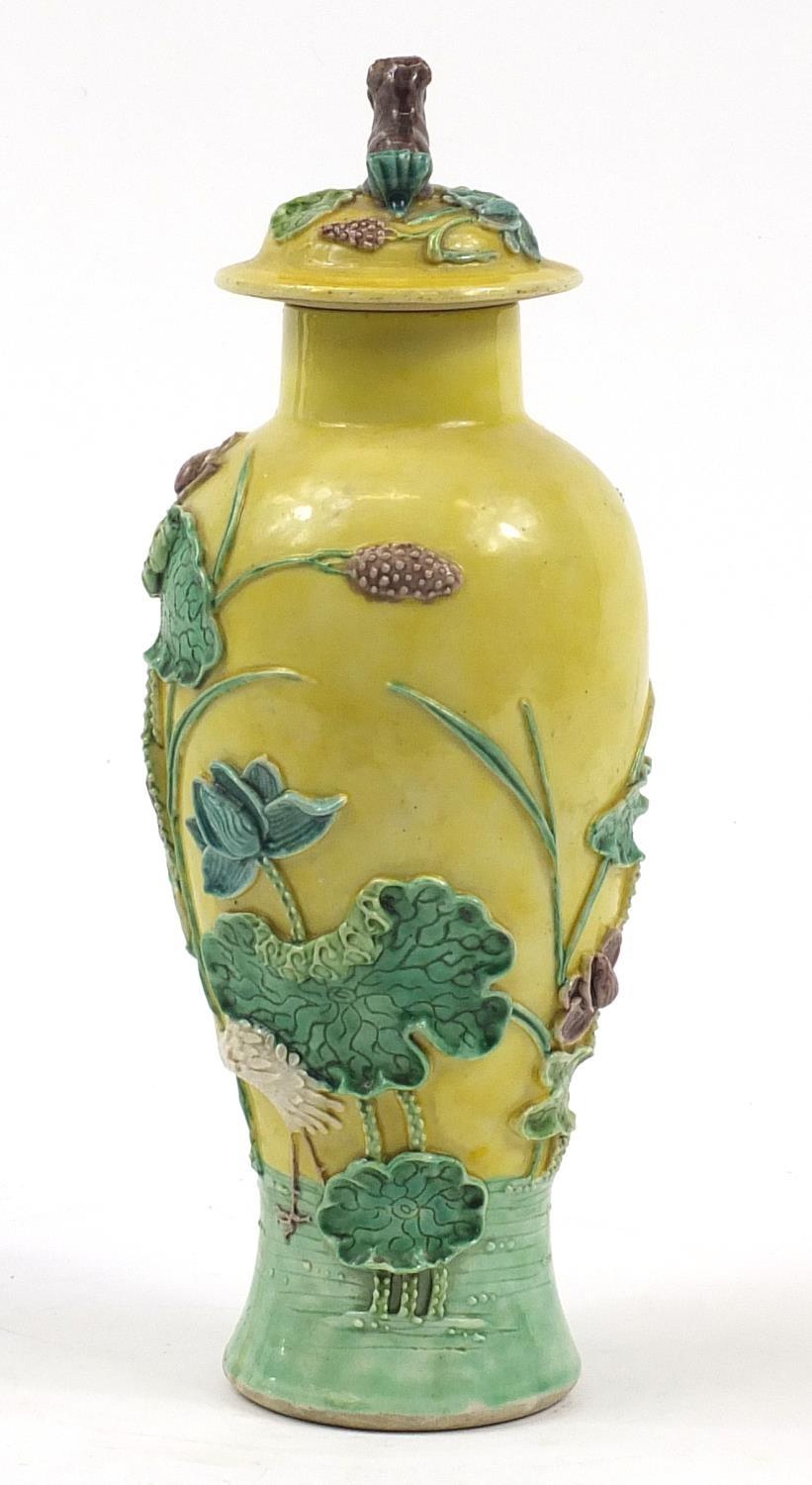 Chinese porcelain baluster vase with cover decorated in relief with a crane amongst lily pads, Wang Bing Rong character marks to the base, 31cm high