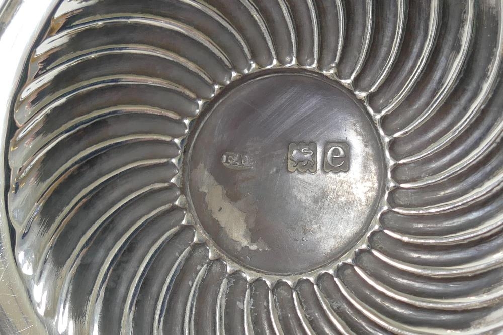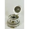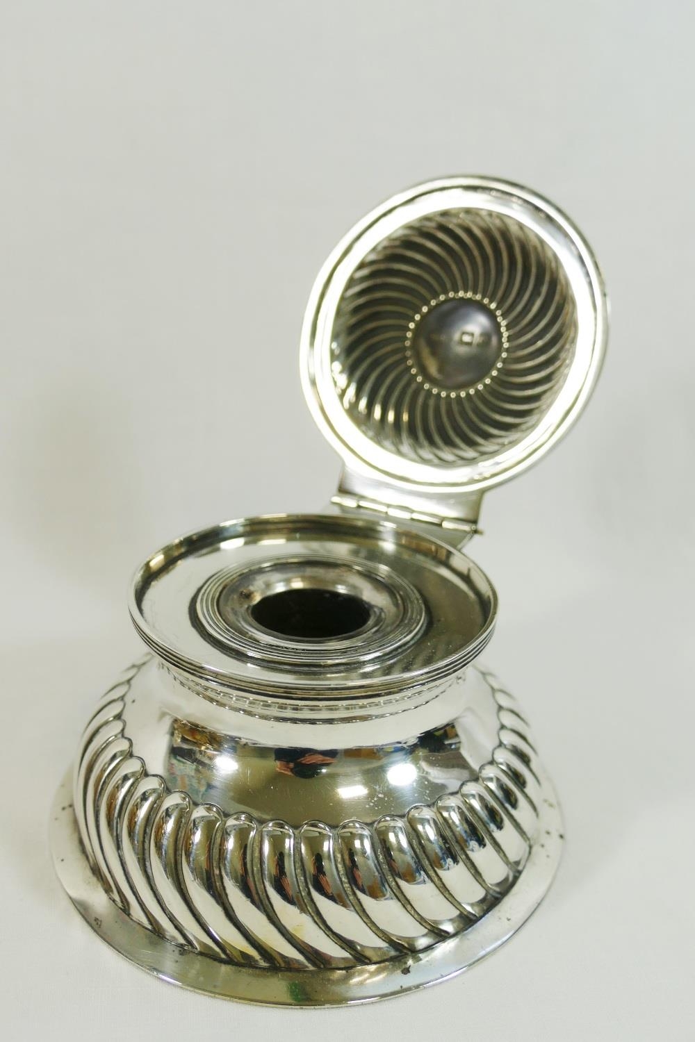A late Victorian silver circular ink well, with half reeded body and hinged lid, on plain spreading foot, with cut glass interior, London 1900, maker's mark by Frederick Augustus Burridge, 7cm high x 12.1cm diameter