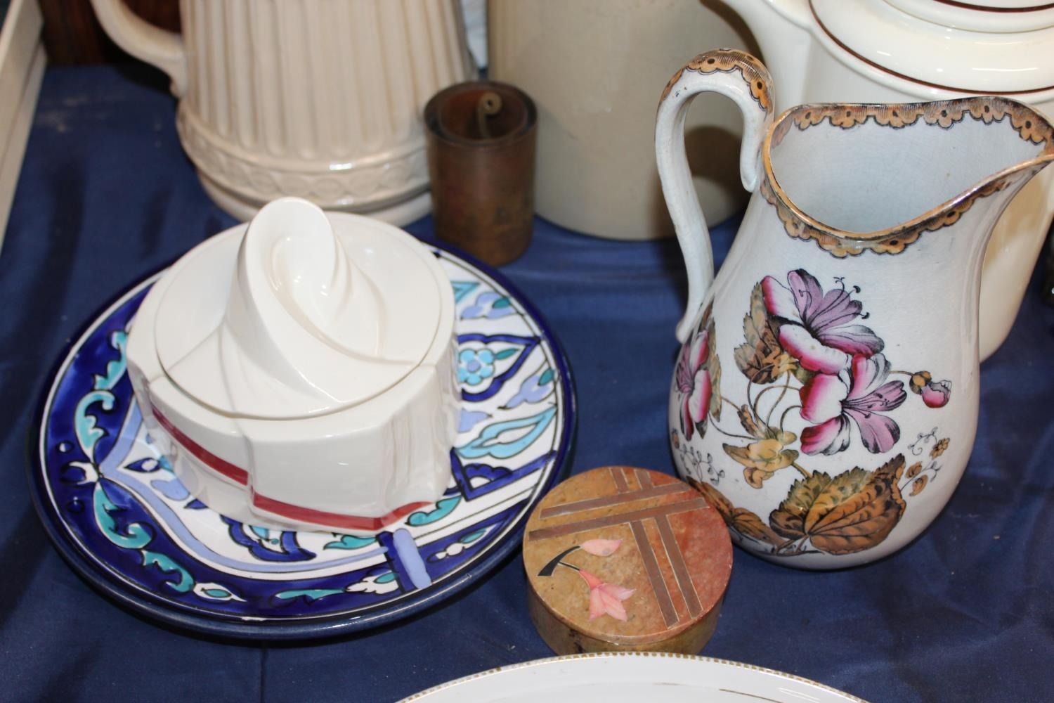 Stoneware jug, a Victorian jug, a pottery pot and cover, etc.