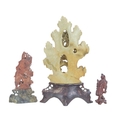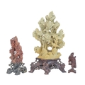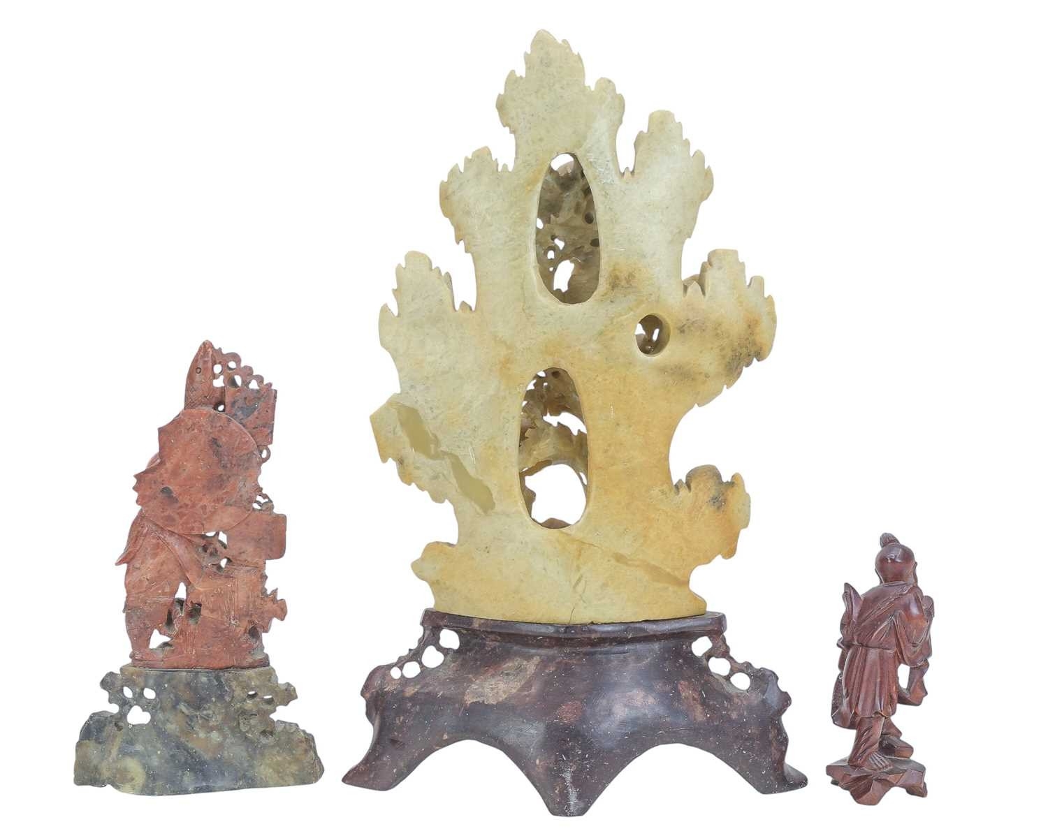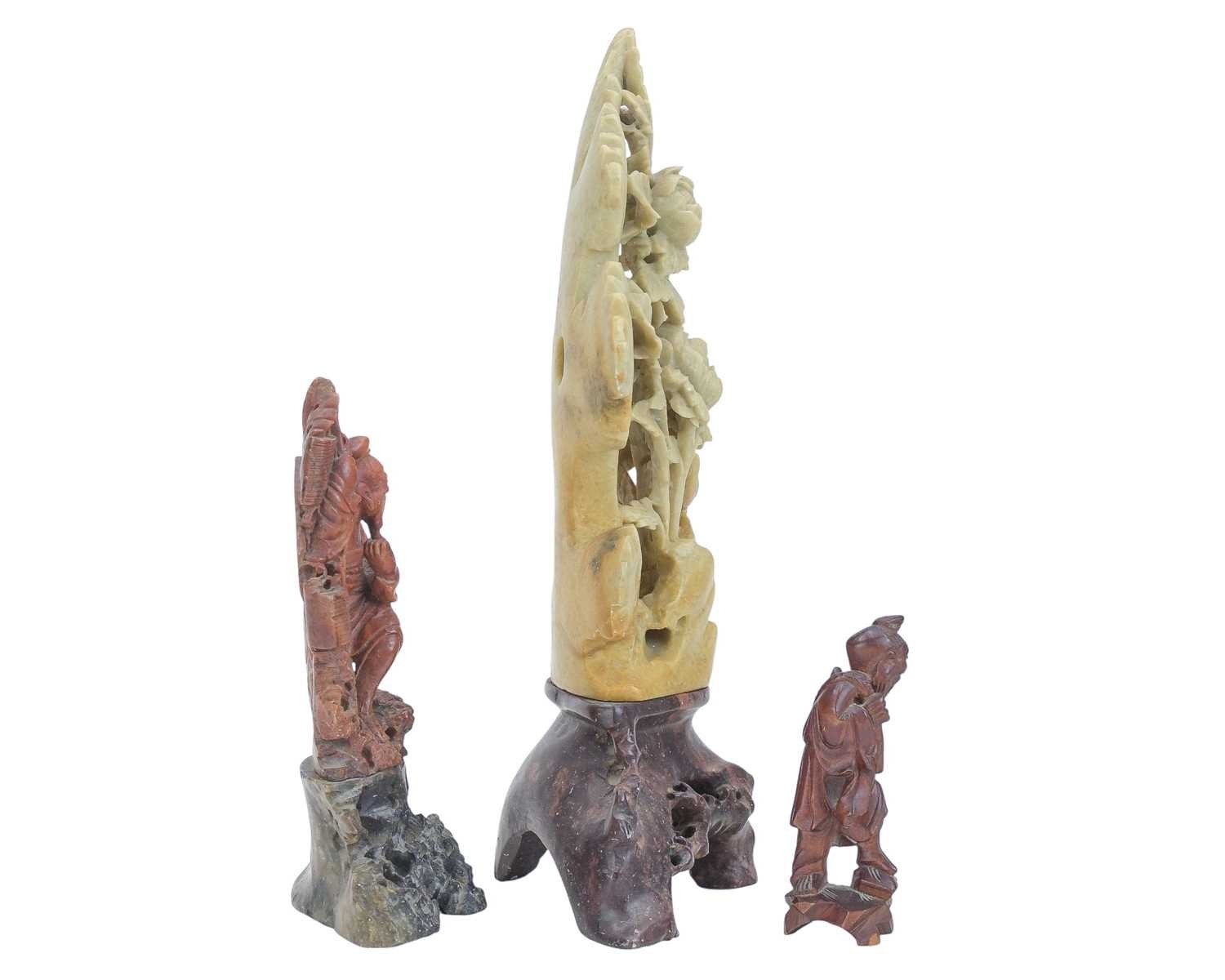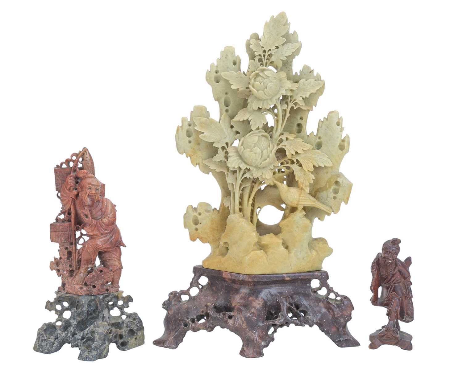 Two Chinese soapstone carvings. One depicting a bird amongst peonies, height 30cm, the other carved with a fisherman, height 18cm. Together with a carved wood figure of the same subject (3).