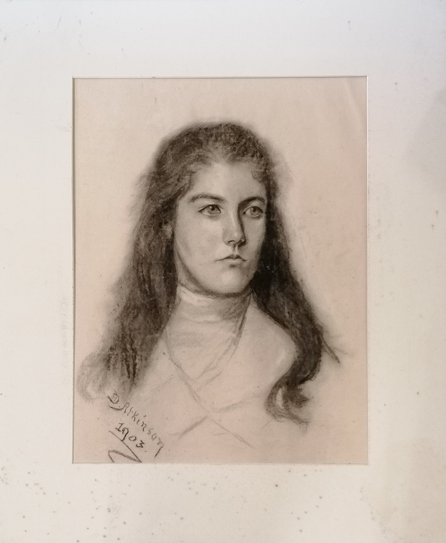 1903 charcoal portrait of young lady signed D Atkinson - mount 68.5cm x 57cm. Signs of wear.
