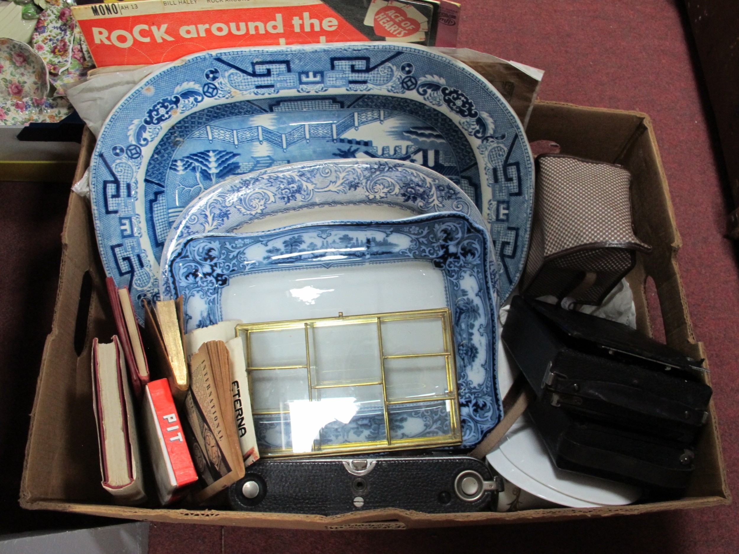 Three Blue & White Meat Plates, cameras, records, magazines, display, etc:- One Box.