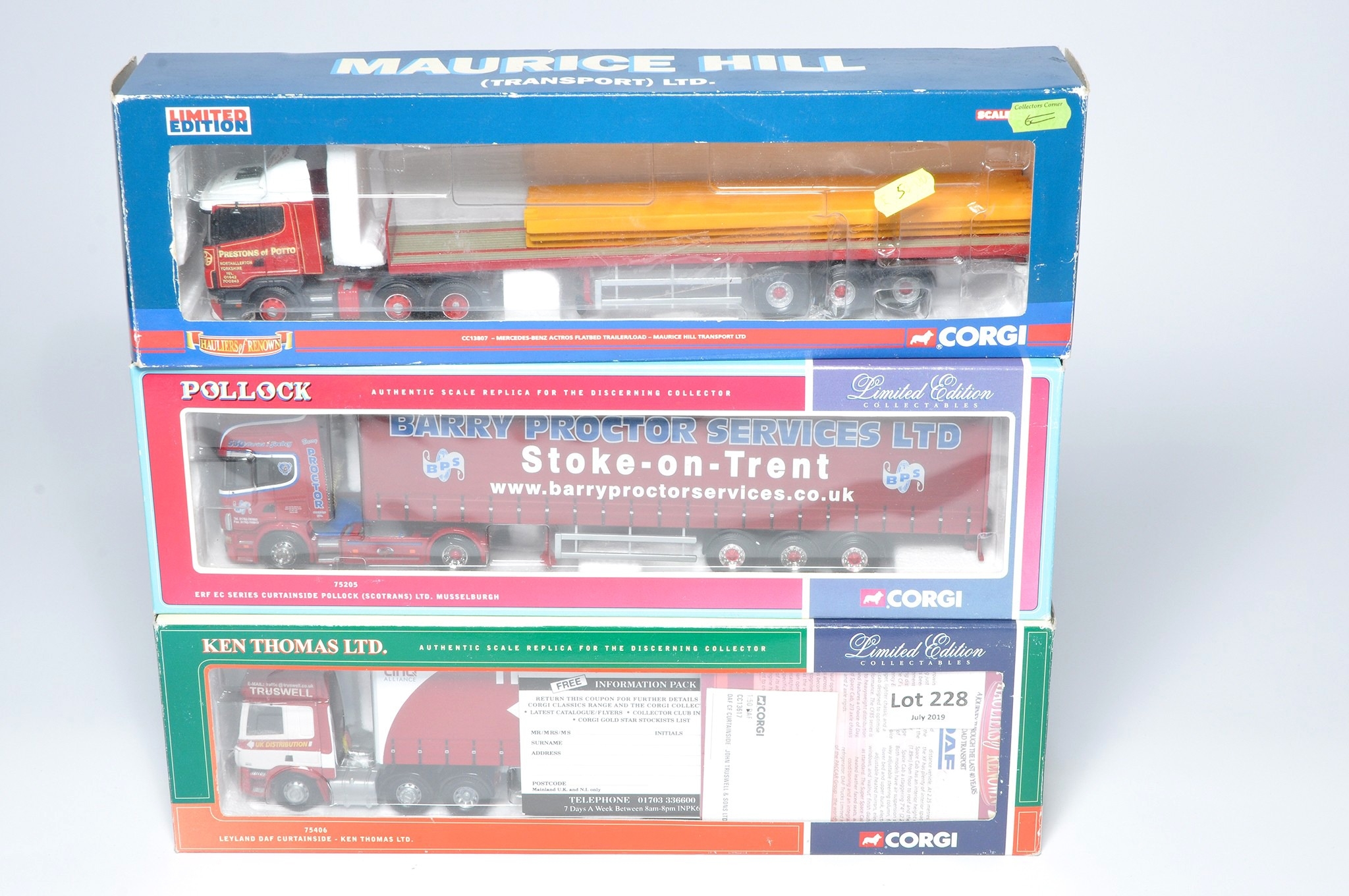 Corgi (boxed) 1/50 diecast model truck issues comprising sets in the livery of Barry Proctor, Prestons and Trusswell. Look to be without obvious sign of notable (damage) faults, albeit, not checked for absolute completeness. Note some incorrect boxes.