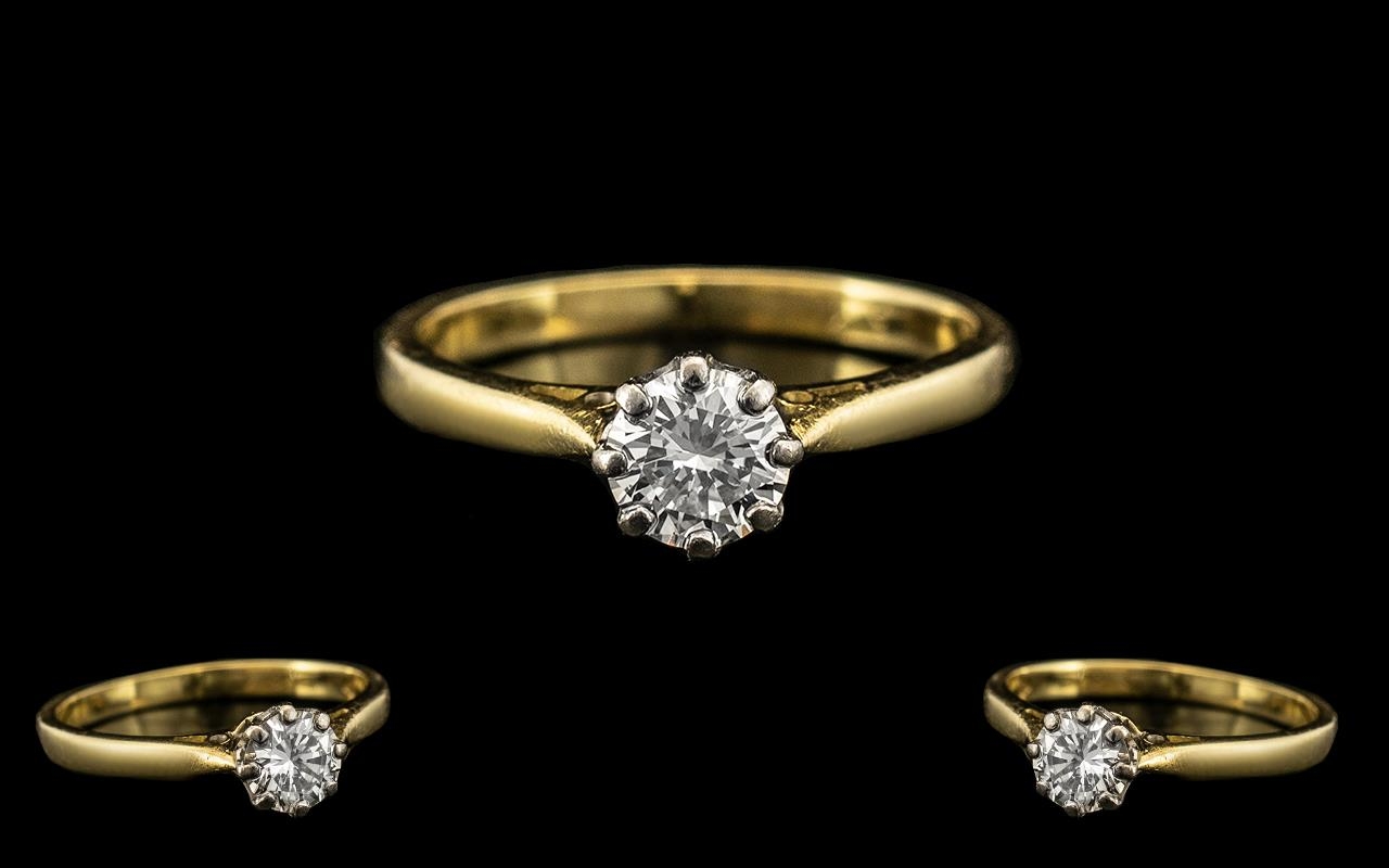18ct Gold Attractive and Good Quality Single Stone Diamond Set Ring, the round brilliant cut diamond of excellent colour and clarity, with good sparkle; est. diamond weight 0.50pts, marked 51 pts to interior of shank; size M; excellent in all aspects of condition including shank and setting