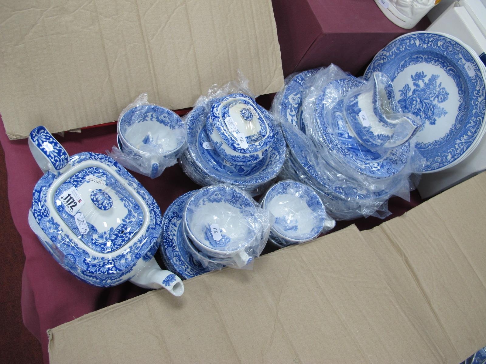 Spode 'Italian' Dinner/Tea Ware, comprising ten dinner plates, six each side plates, tea cups and saucers, teapot, milk jug and sugar bowl (all unused); plus three Spode 'Blue Room' plates.