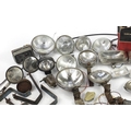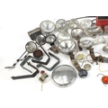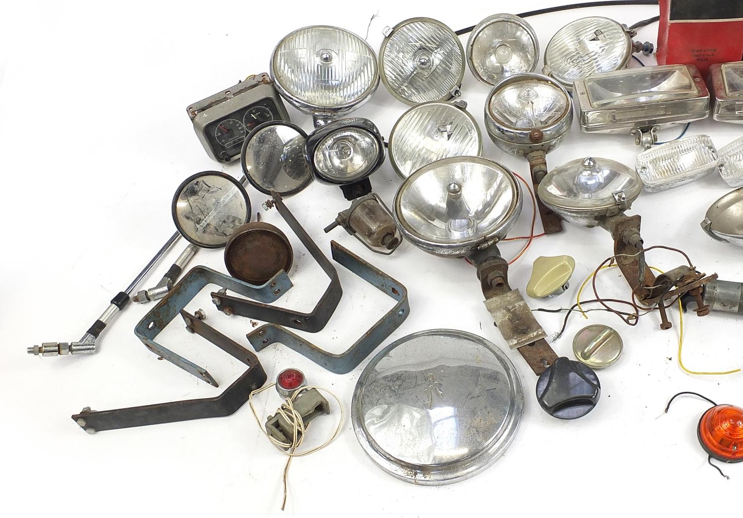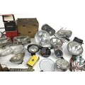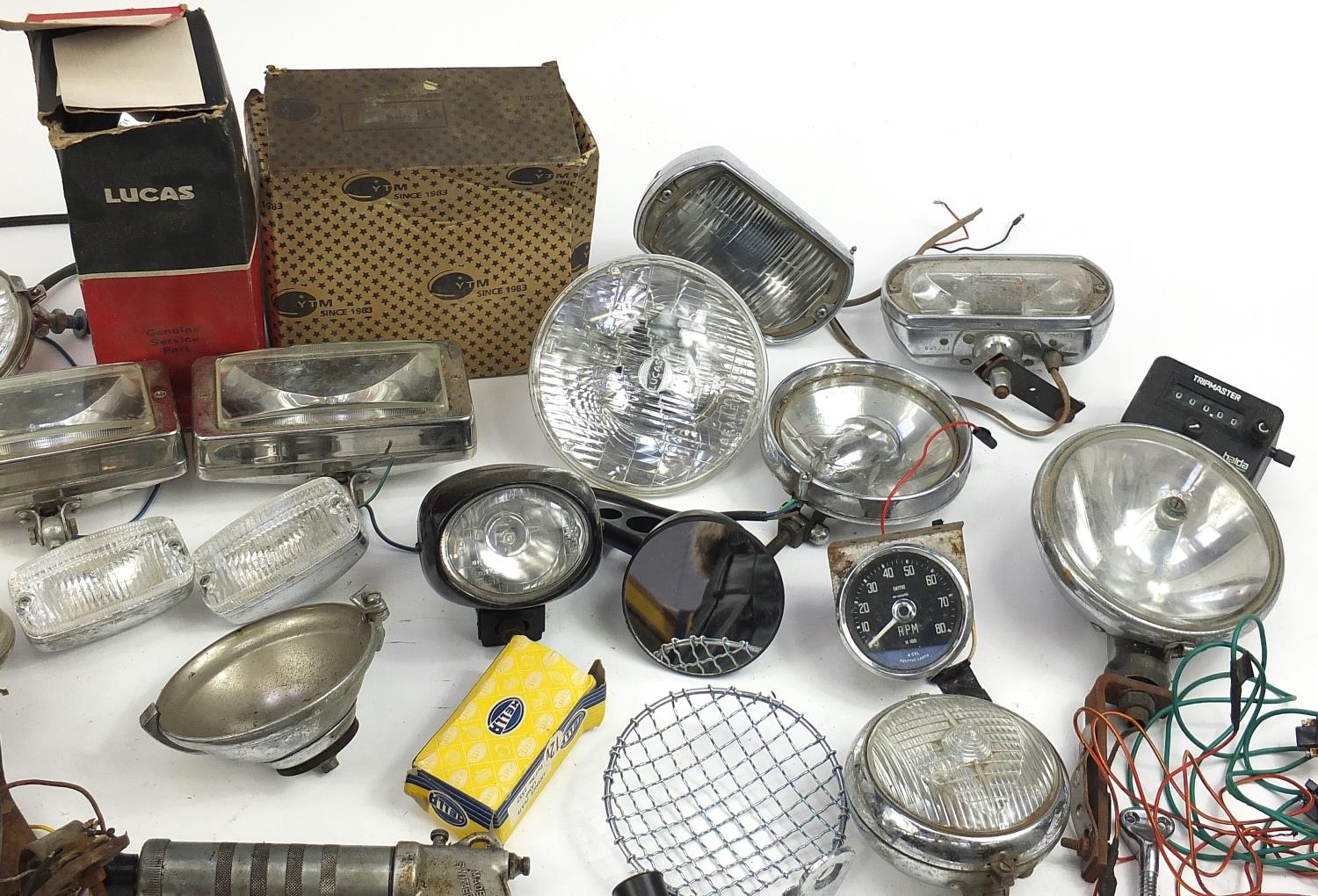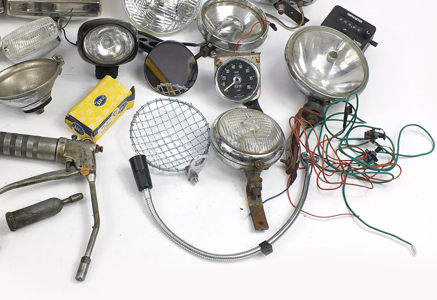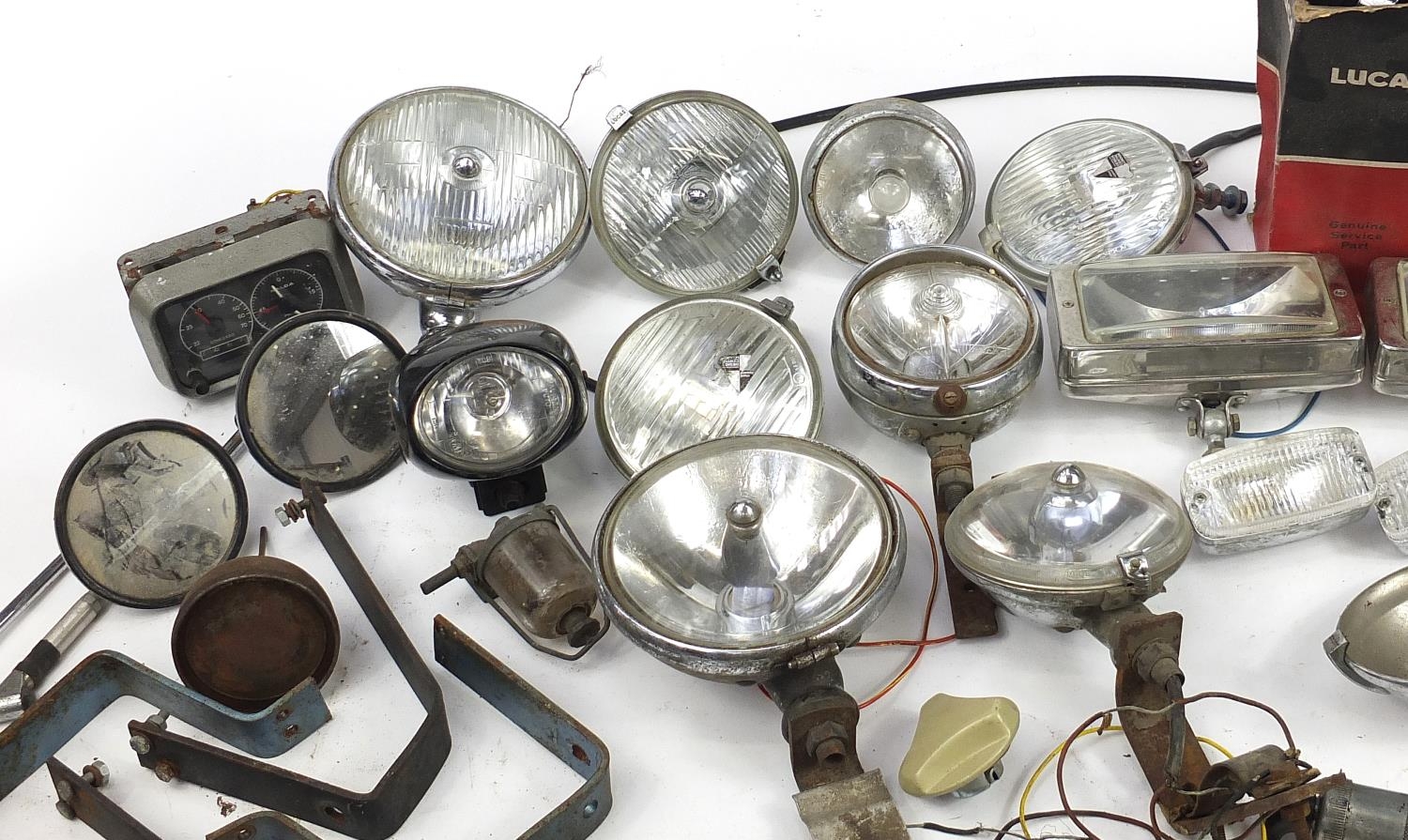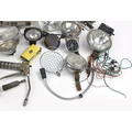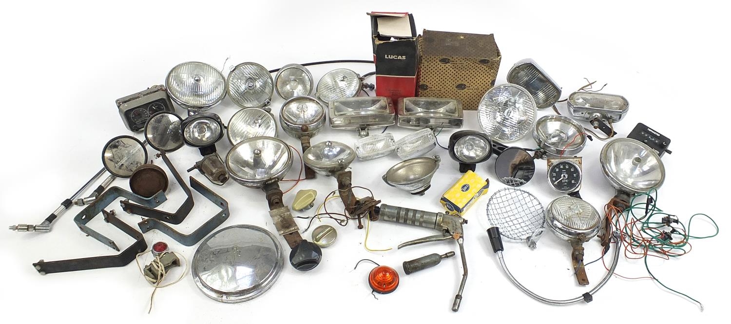 Large collection of vintage motoring interest vehicle parts including Lucas lamps and Marchal headlight
