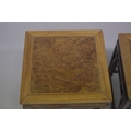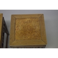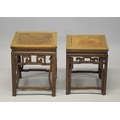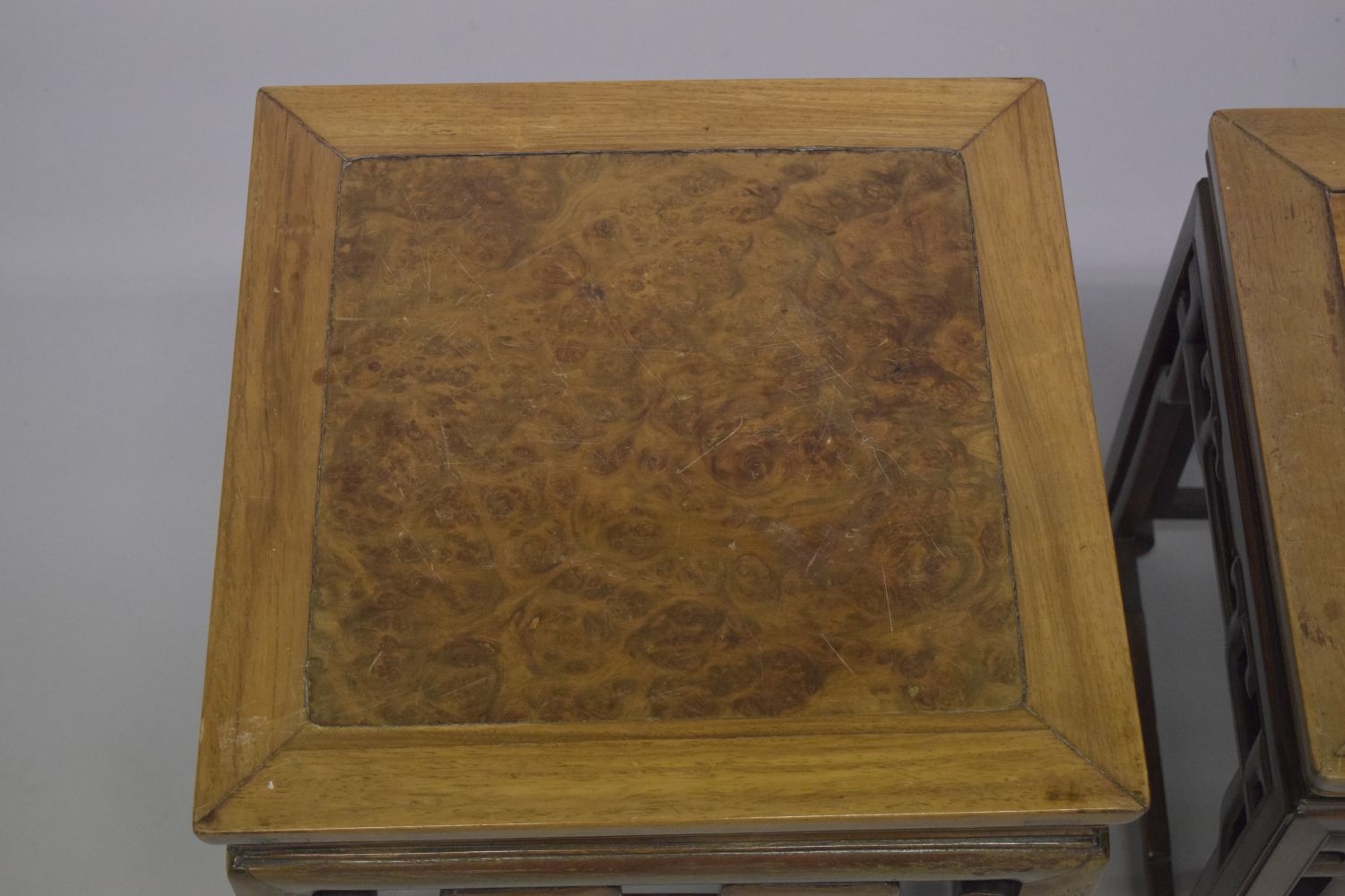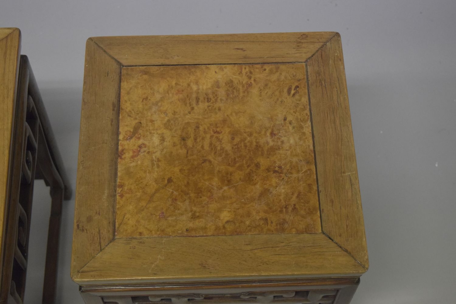 TWO GOOD CHINESE HARDWOOD SQUARE STANDS, each inset with a burr wood panel, above a carved frieze supported on square legs united by stretchers, 46cm and 49cm high.
