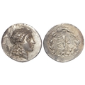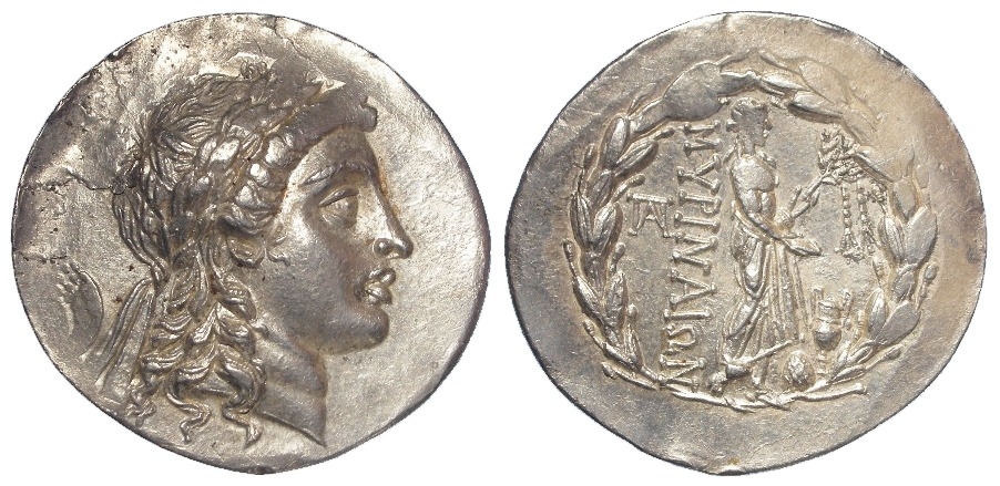 Ancient Greek: Aeolis Myrina silver tetradrachm, 2ndC BC. Apollo's head r. / In laurel wreath: Apollo of Gryneion standing r. with patera and laurel branch with hanging taenias, in front of omphalos and kantharos. 16.37g. EF with an old ticket.