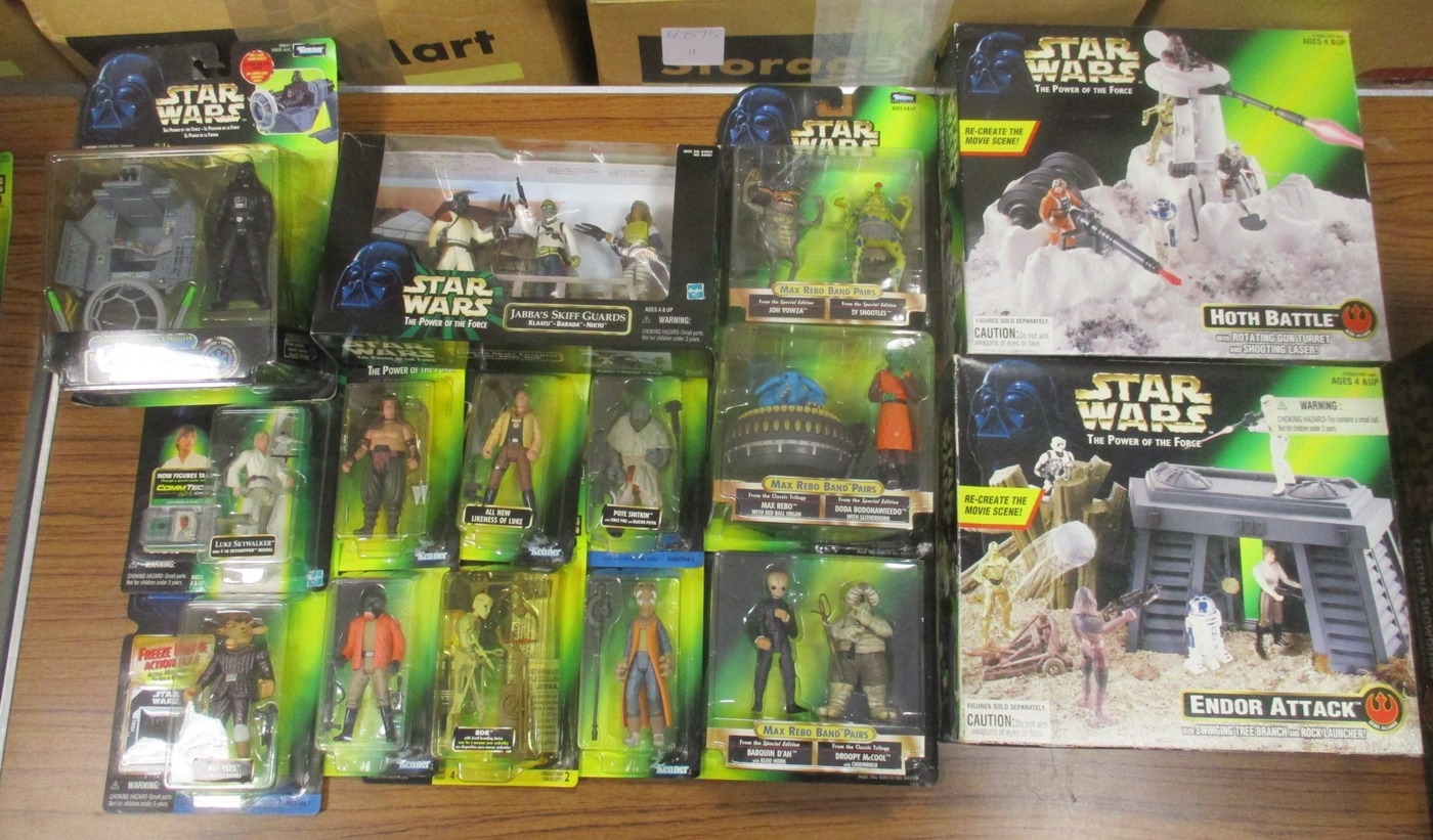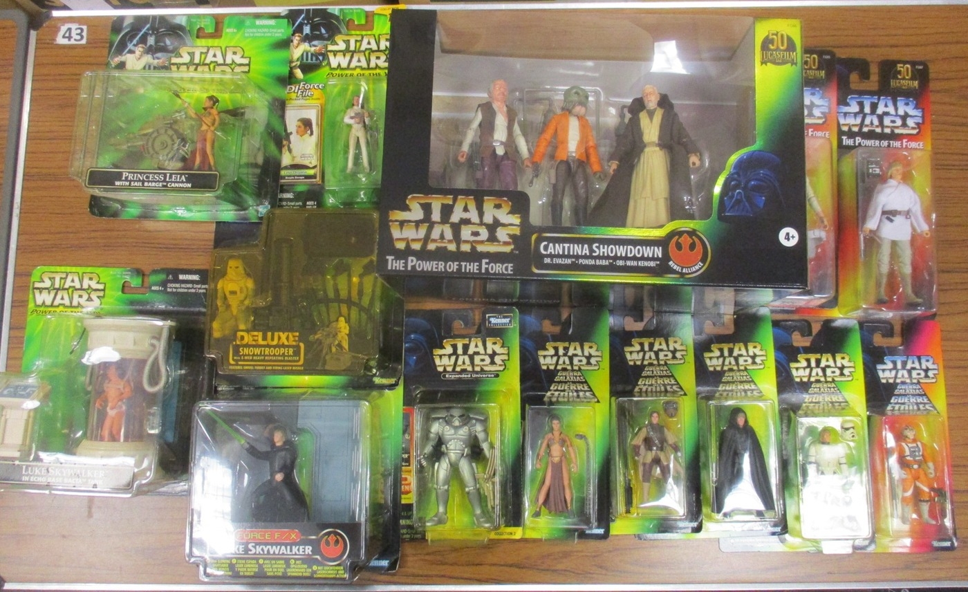 Star Wars. Kenner/Hasbro. Collection of Power of the Force/Power of the Jedi figures and packs, generally near mint to mint in excellent to near mint boxes, with Cantina Showdown, Endor Attack, Hoth Battle, Jabba's Skiff Guards, Luke Skywalker in Echo Base Bacta Tank, Max Rebo Band Pairs (3 different), Princess Leia with Sail Barge Cannon, etc. Qty 30 (2B)