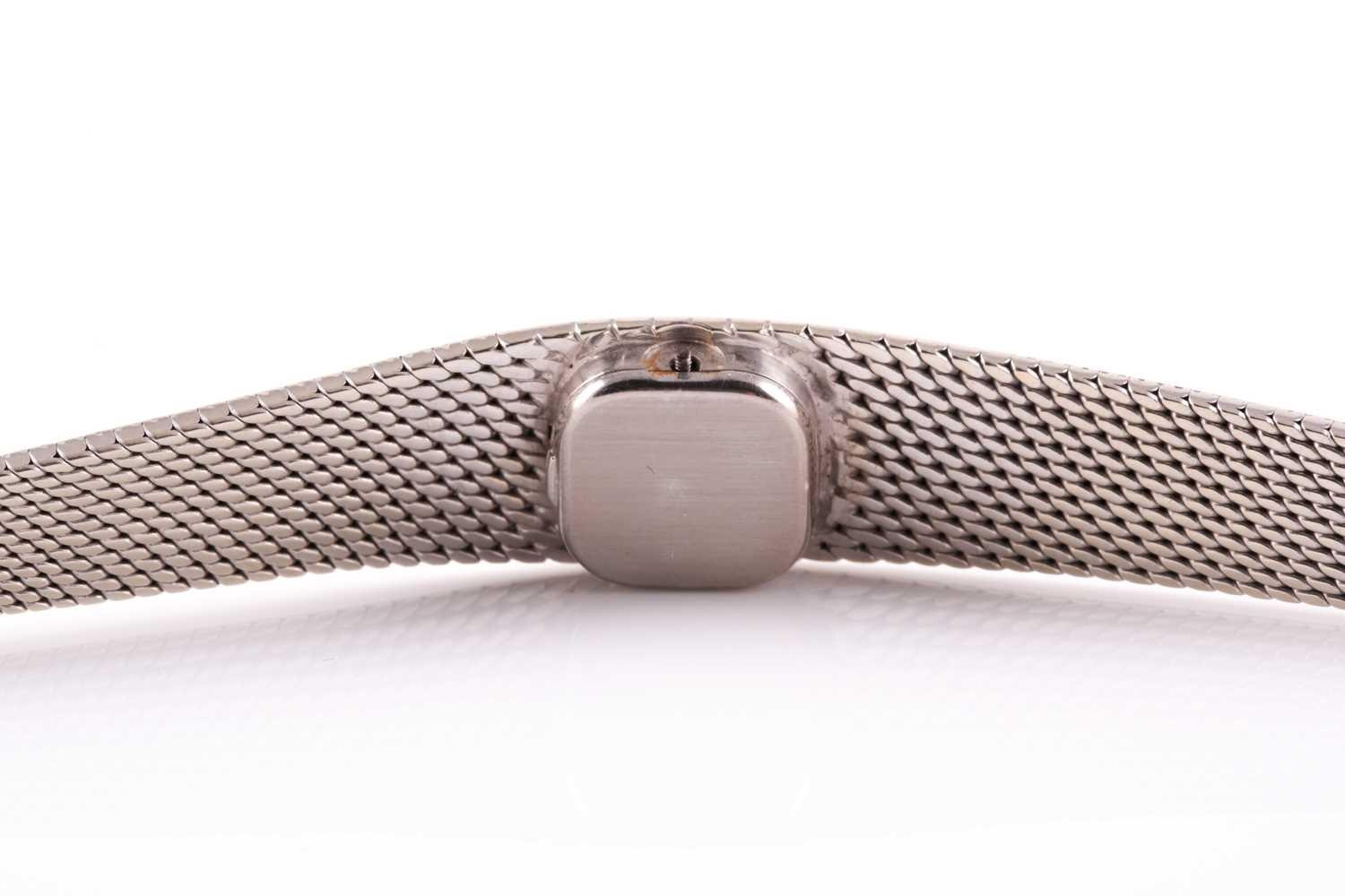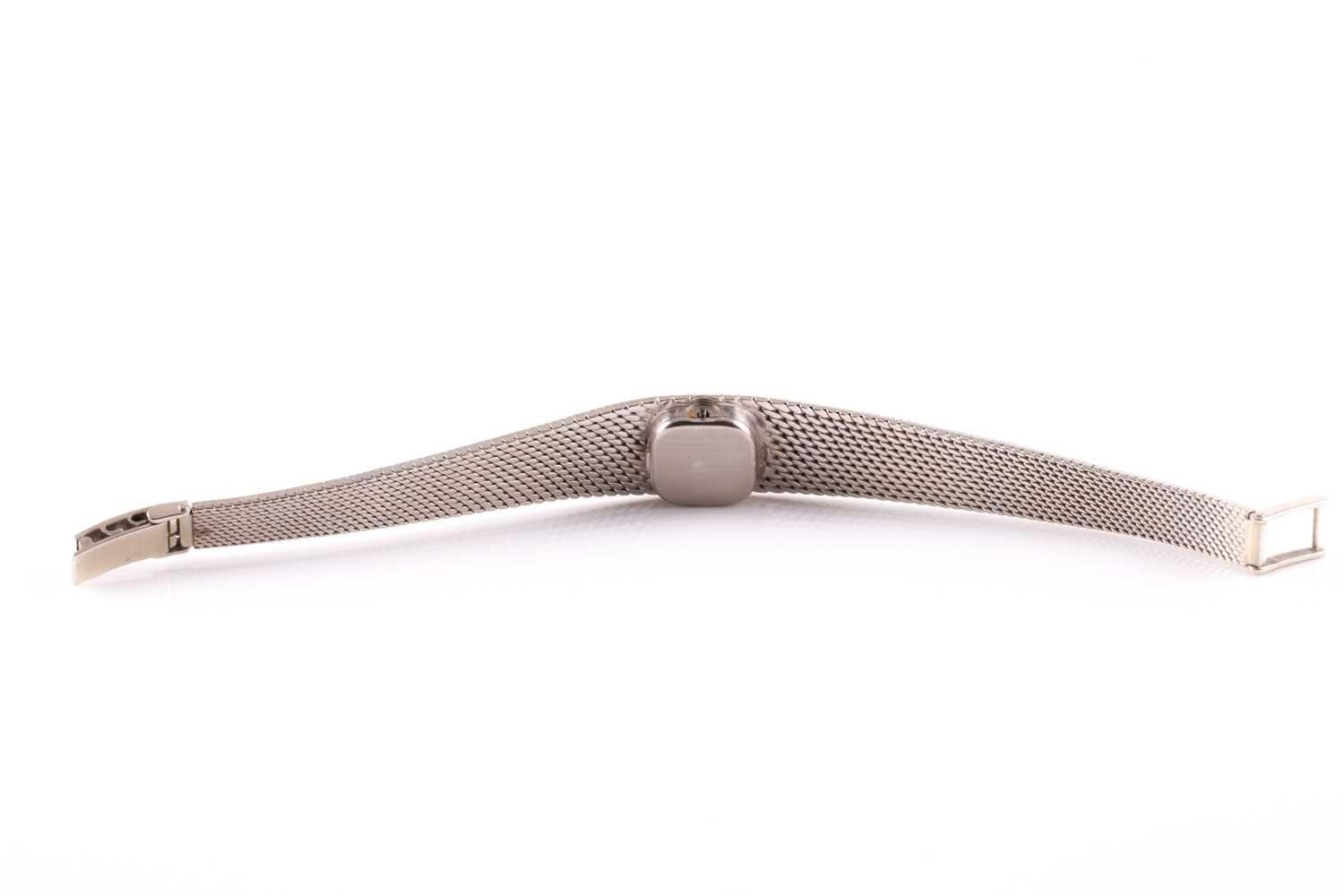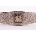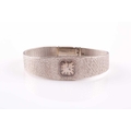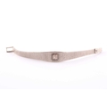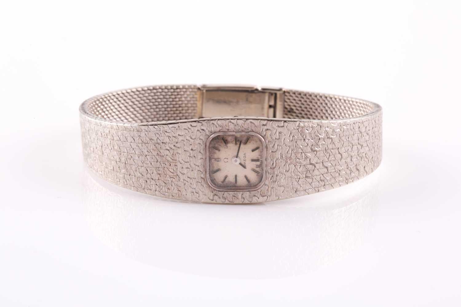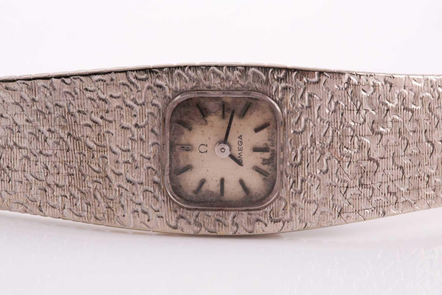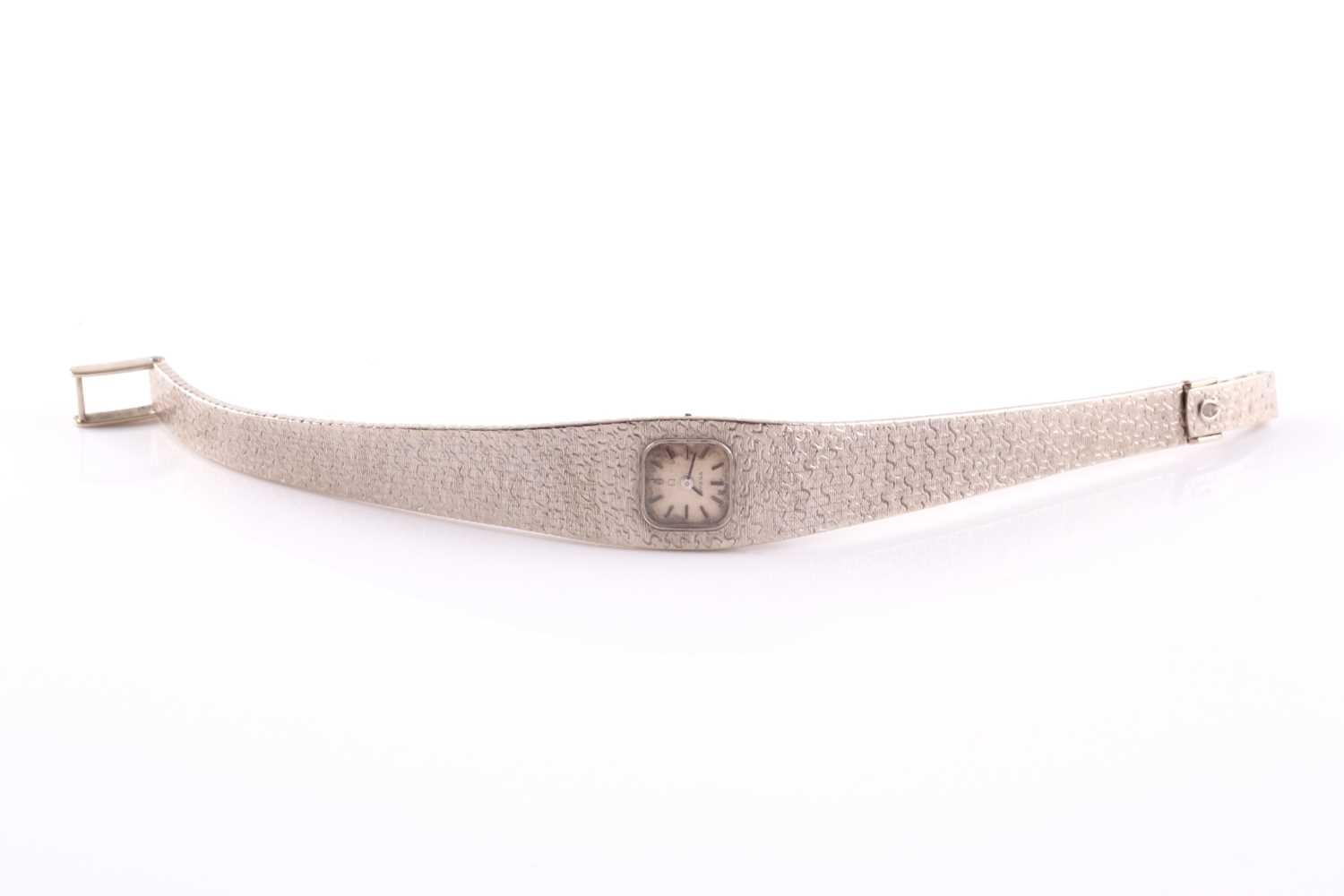An 18ct white gold ladies Omega cocktail watch, the small baton dial inset into an articulated strap bracelet with engraved decoration, 16.5 cm long.