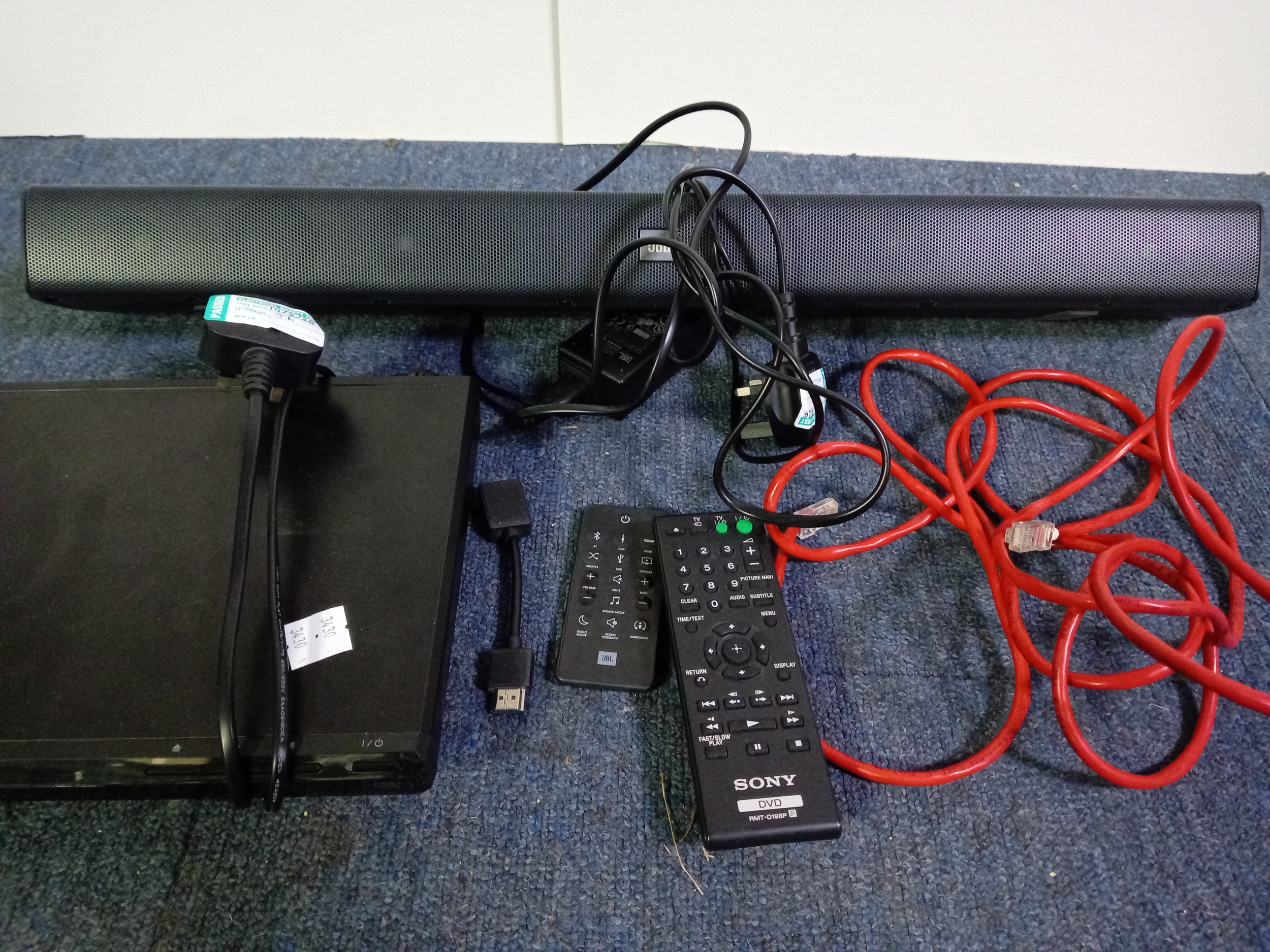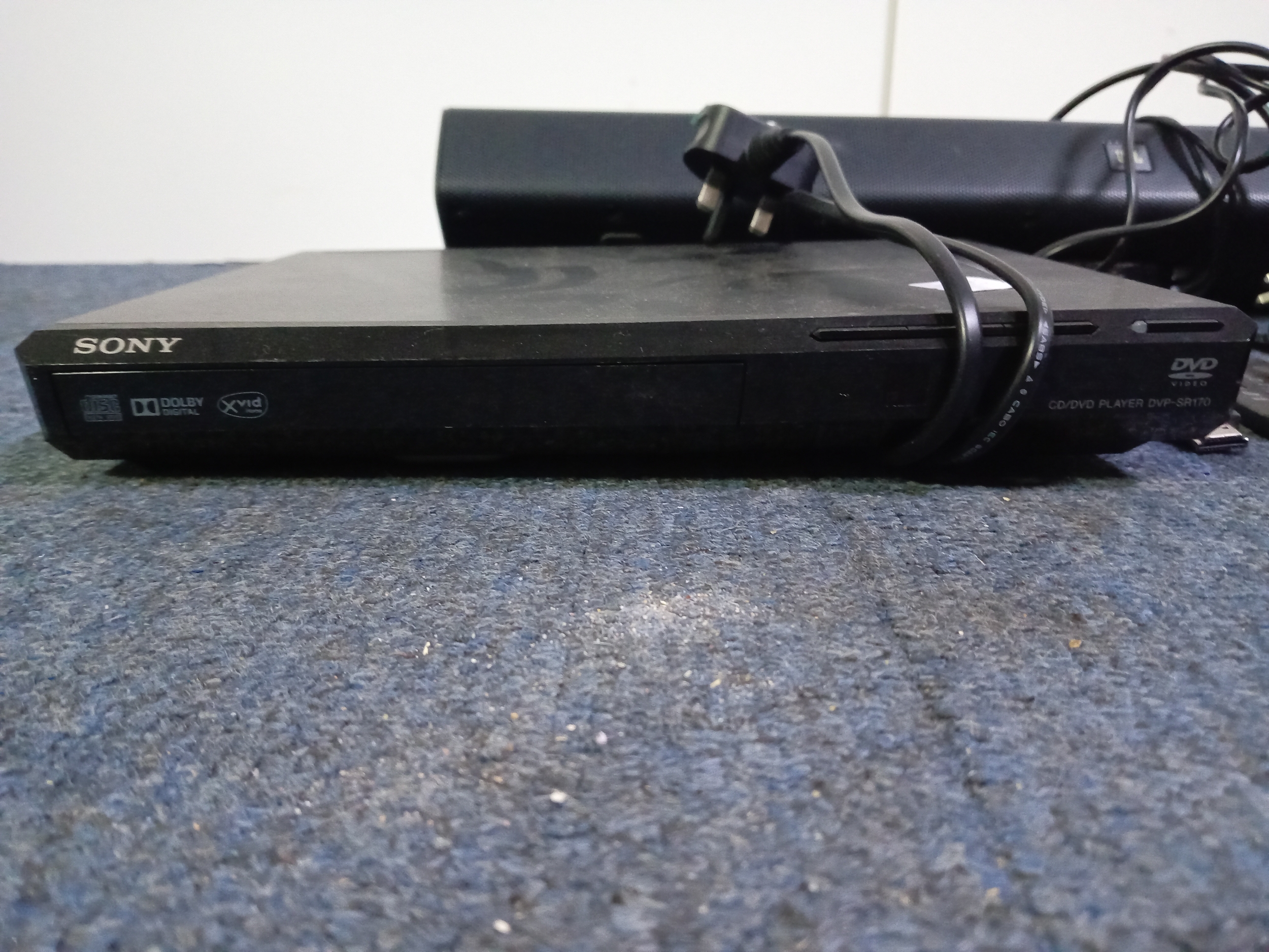 A Sony CD/ DVD player model DVP-SR170 with a JBL Bar studio sound bar complete with remotes and ethernet cable, Pat tested and CD player working, no way to test sound bar