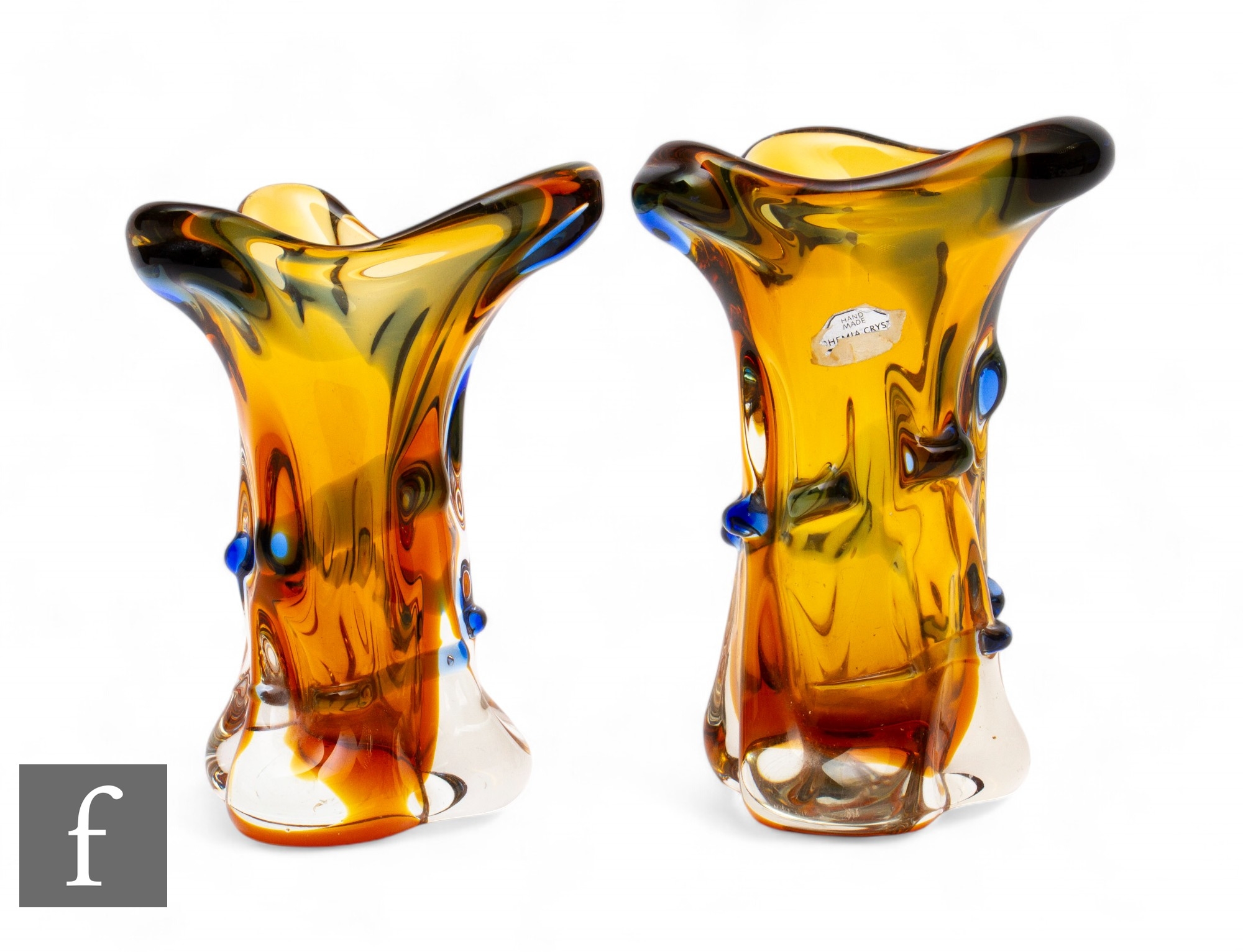 Josef Hospodka - Chribska - A post war Czechoslovkian glass vase of flared cylindrical form with pulled body, amber and blue cased in clear, height 20cm, together with another with triform rim. (2)