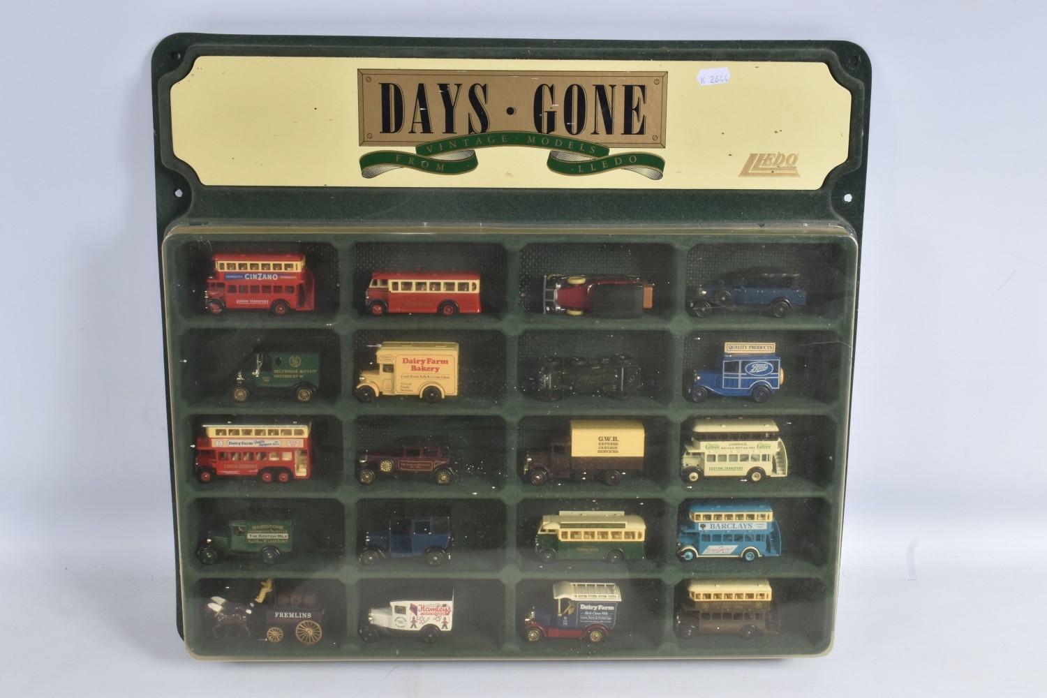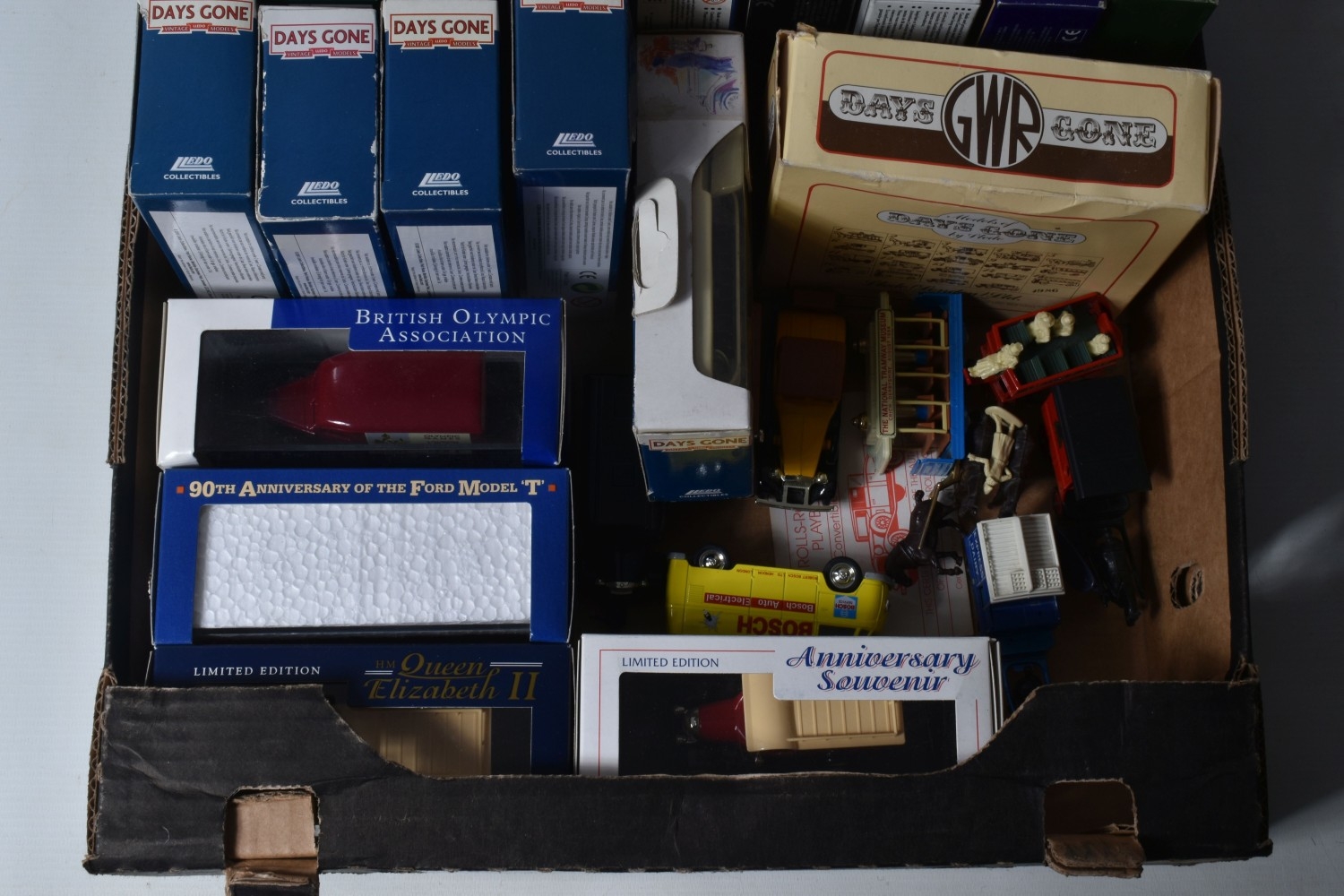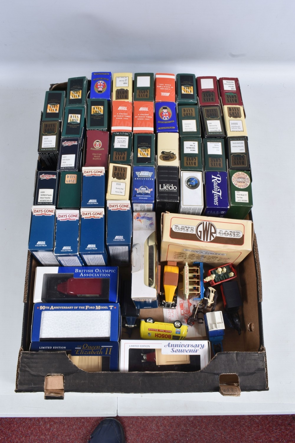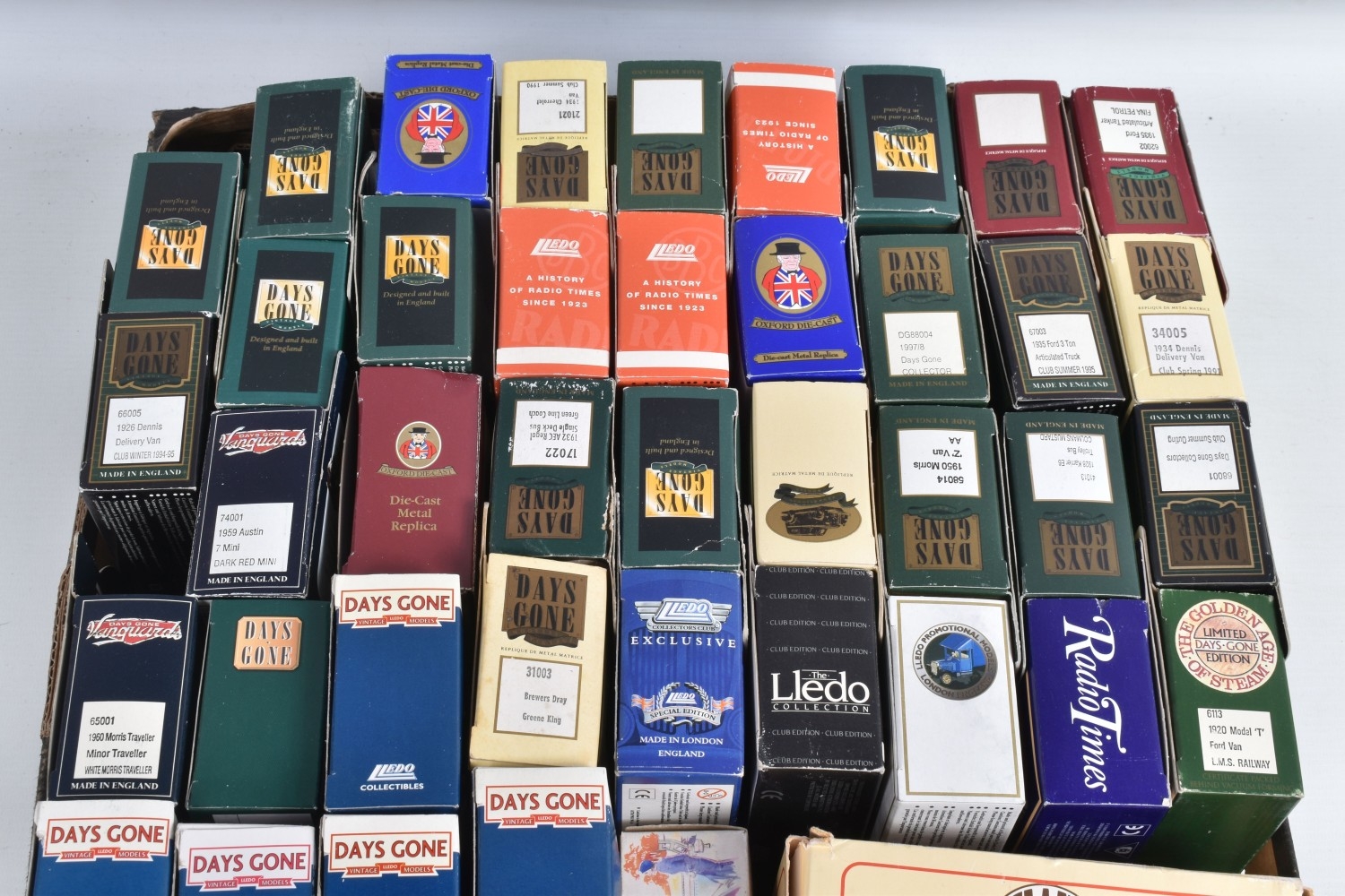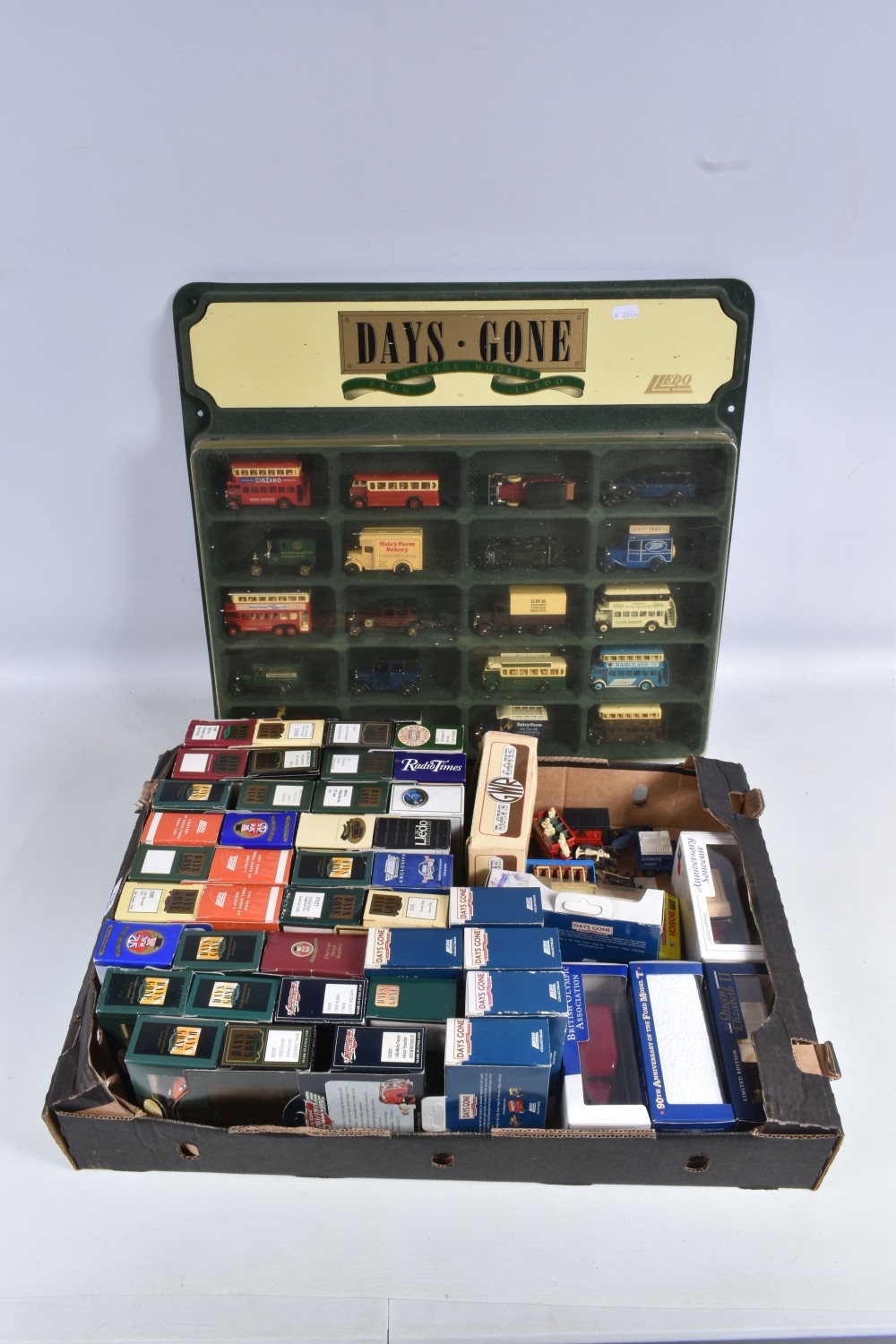 ONE TRAY AND SHOP DISPLAY CASE OF BOXED AND UNBOXED LLEDO DAYS GONE MODELS, included is a covered plastic Days Gone shop display case containing twenty mostly promotional model vehicles, models and case both appear in okay condition, some discolouration and dust to the lid of the case, also included are a selection of other models, some of these included are a Vanguards 1960 Morris Traveller Minor Traveller numbered 65001, 1959 Austin 7 mini Dark red mini numbered 74001, club summer 1990 1934 Chevrolet van numbered 21021 and more, all models appear in good condition however contents has not been checked for their completion, housed inside their plastic and cardboard boxes, boxes are in good condition with some light wear to sharp edges and corners