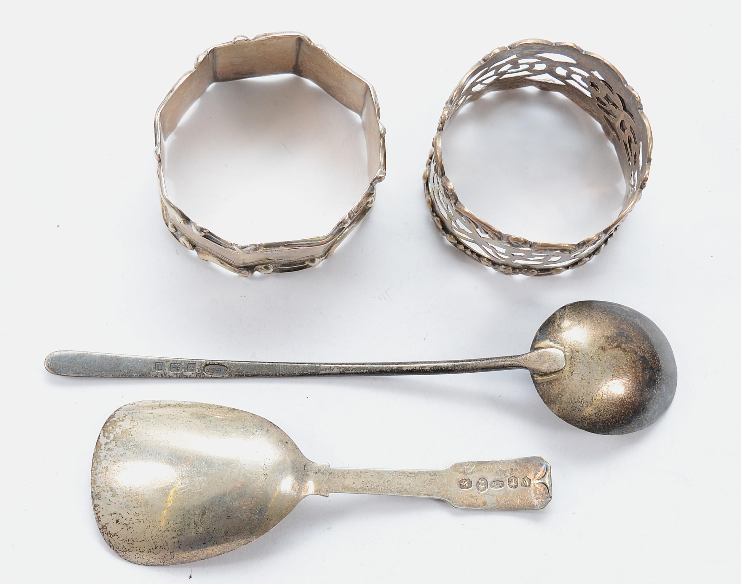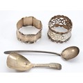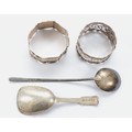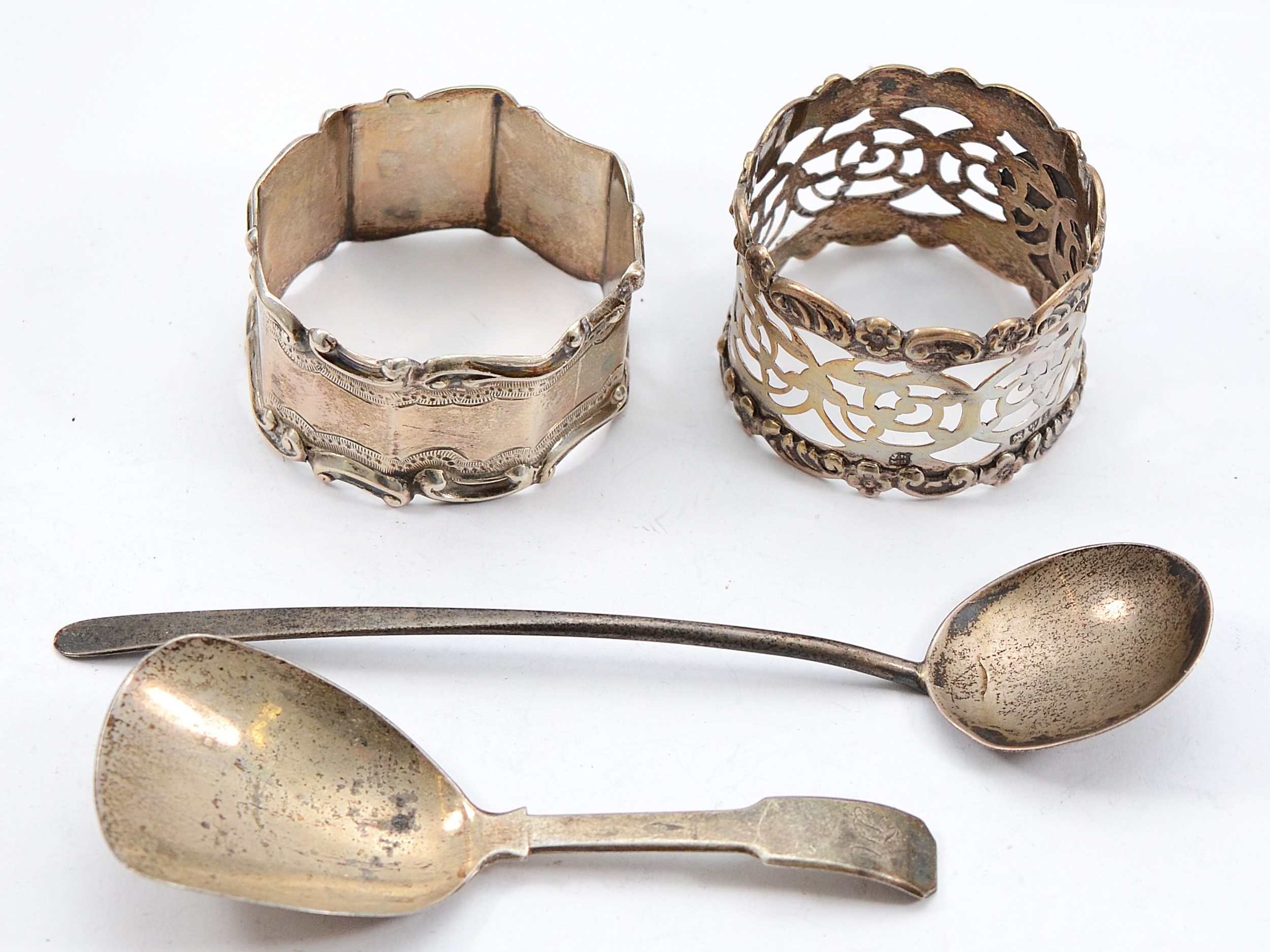 A silver pierced napkin ring, Chester 1904, together with another silver napkin ring, Sheffield 1897, a Georgian salt spoon, Birmingham 1819, and another silver spoon, Birmingham 1912, 62gm.