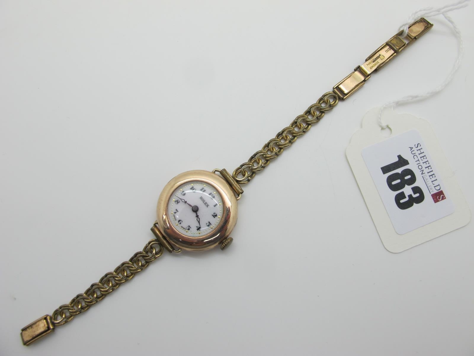 Rolex; A Vintage 9ct Gold Cased Ladies Wristwatch, the signed white dial with black Arabic numerals, the movement stamped "Admiralty 15 Jewels", within Rolex case (import marks for Glasgow 1924), on a gold plated curb link style bracelet.