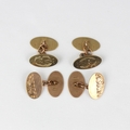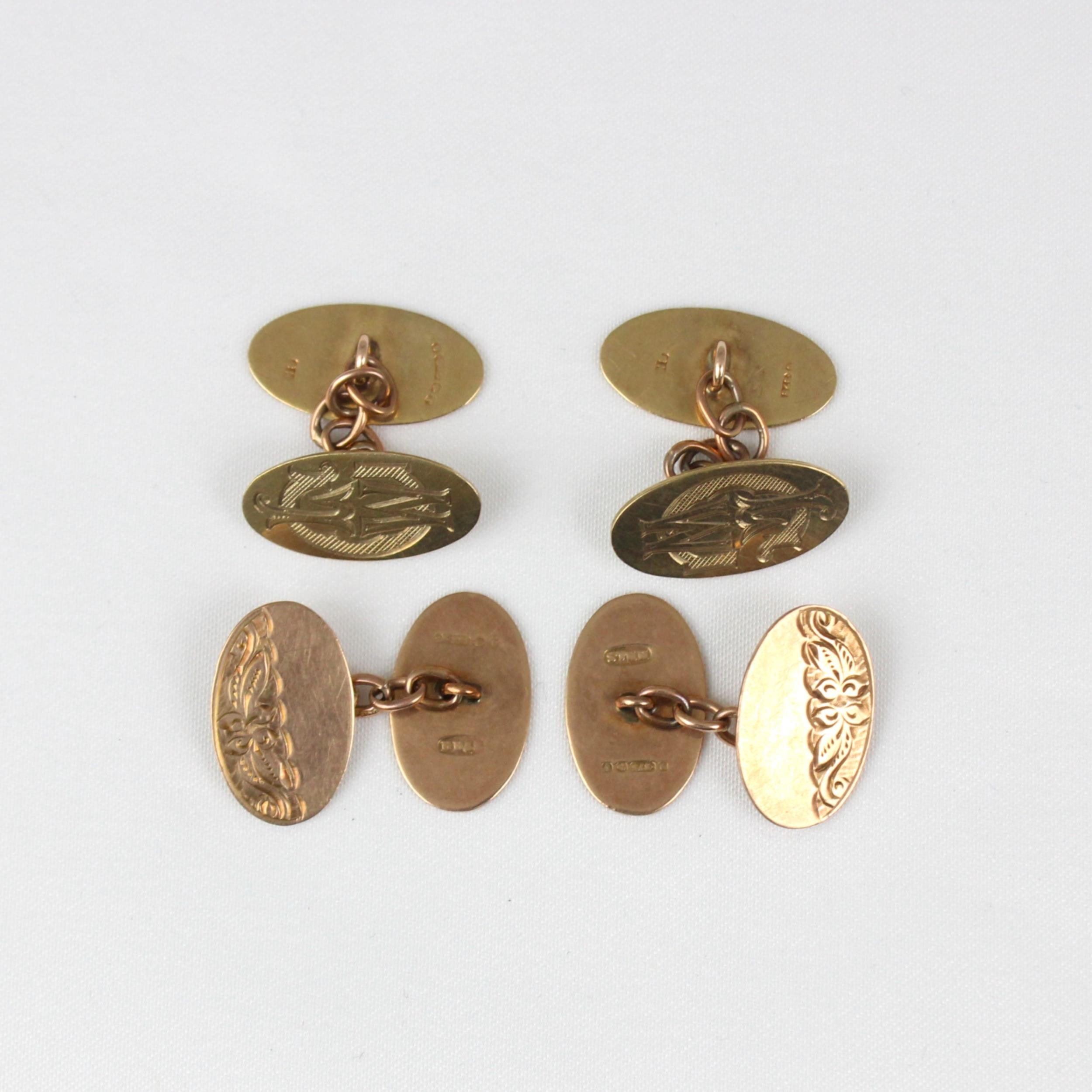 A pair of mid 20th century 9ct cufflinks, the oval links with engraved monogram to front, 2cm long, stamped 'SH' Birmingham 1943, with a further pair of 9ct rose gold cufflinks, gross weight 10gms (4)